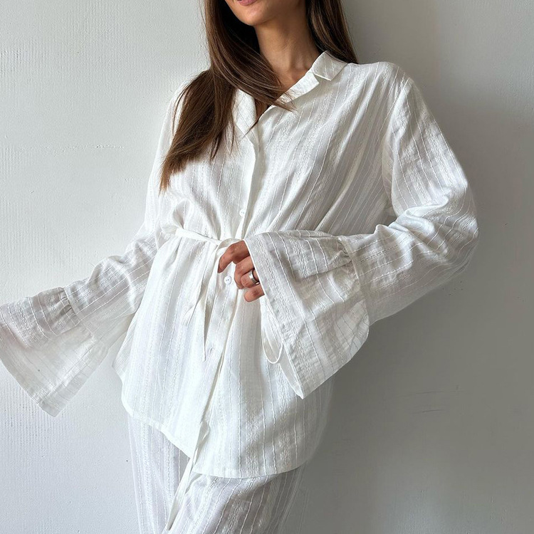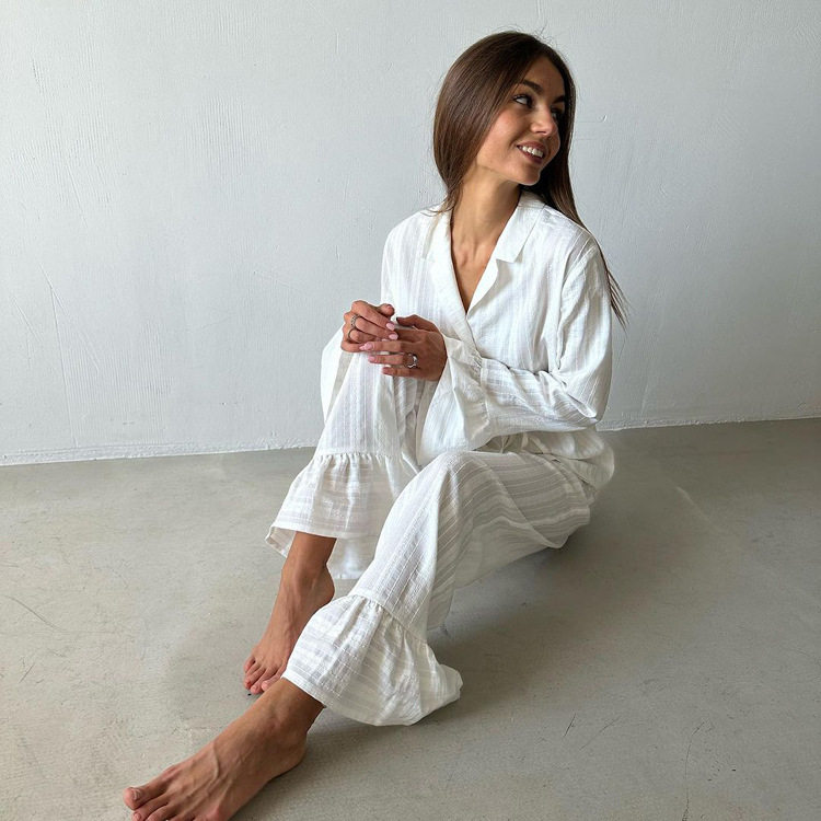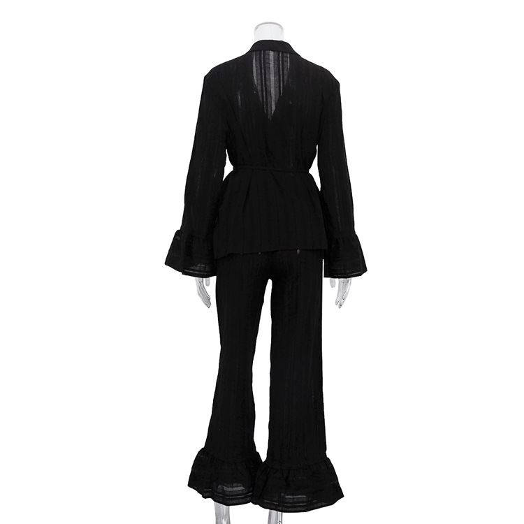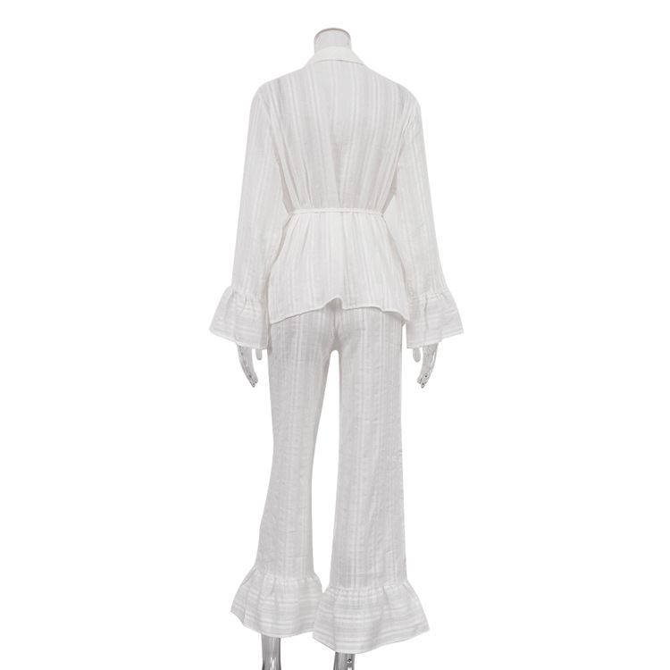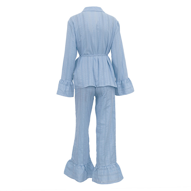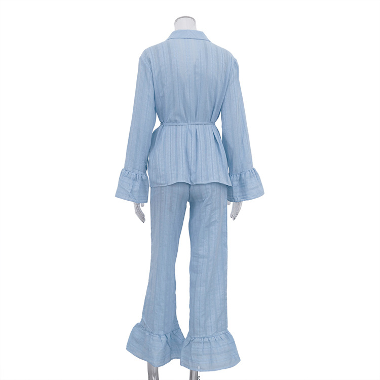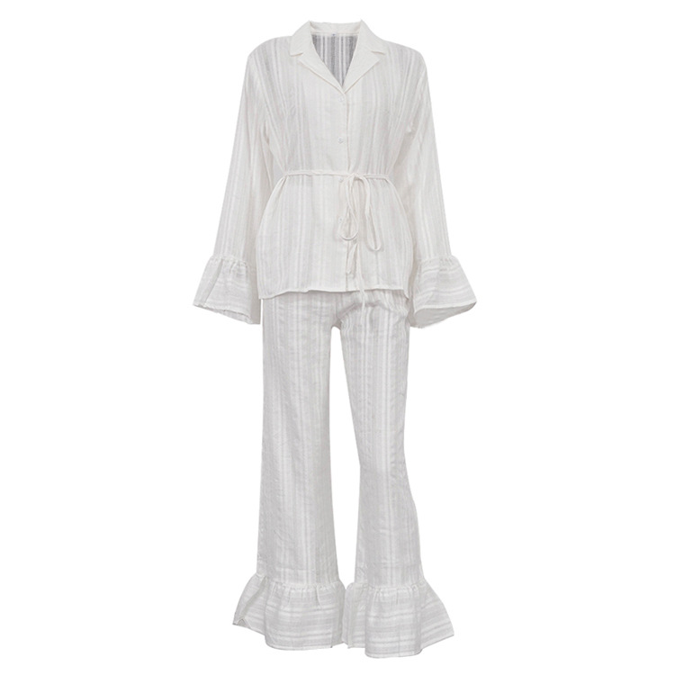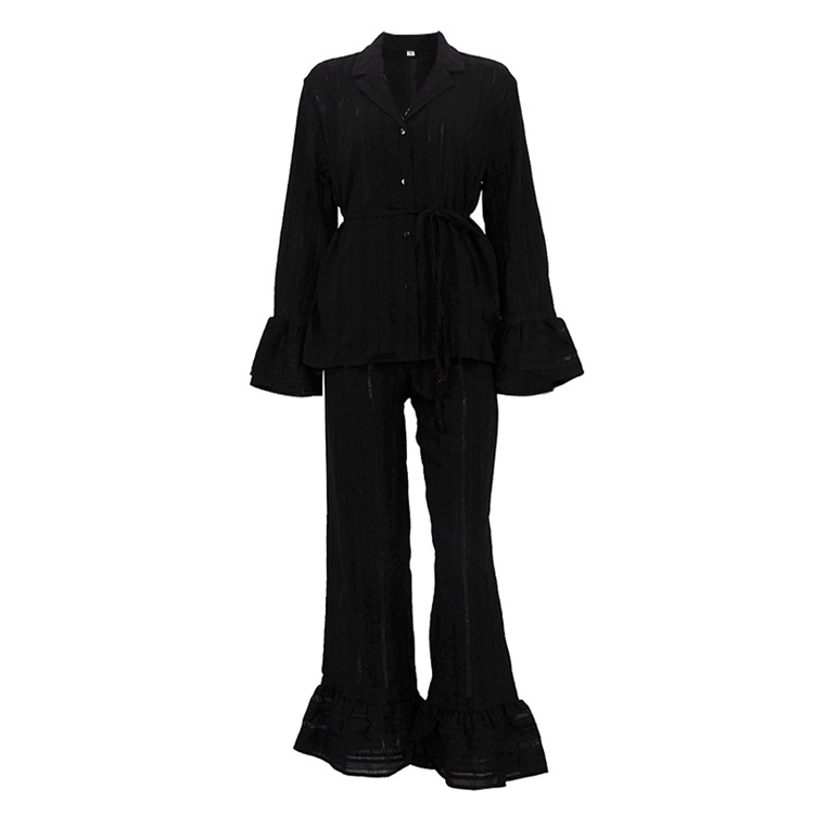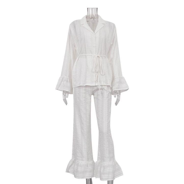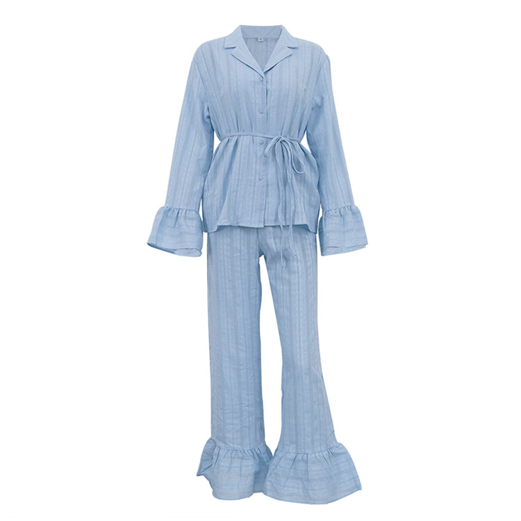러시아 새로운 러플 레이스 업 셔츠 바지 투피스 코튼 옷깃 긴팔 캐주얼 게으른 세트 여성