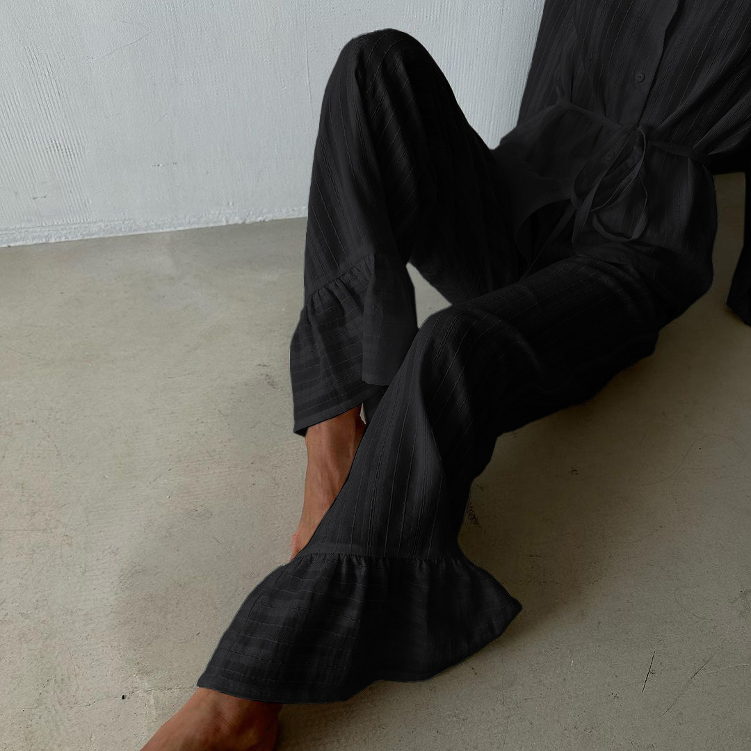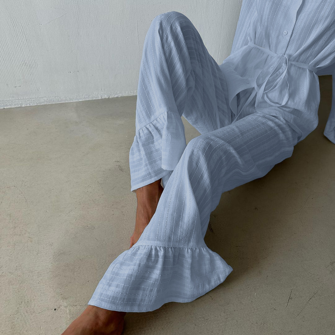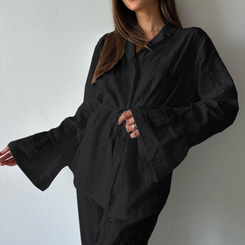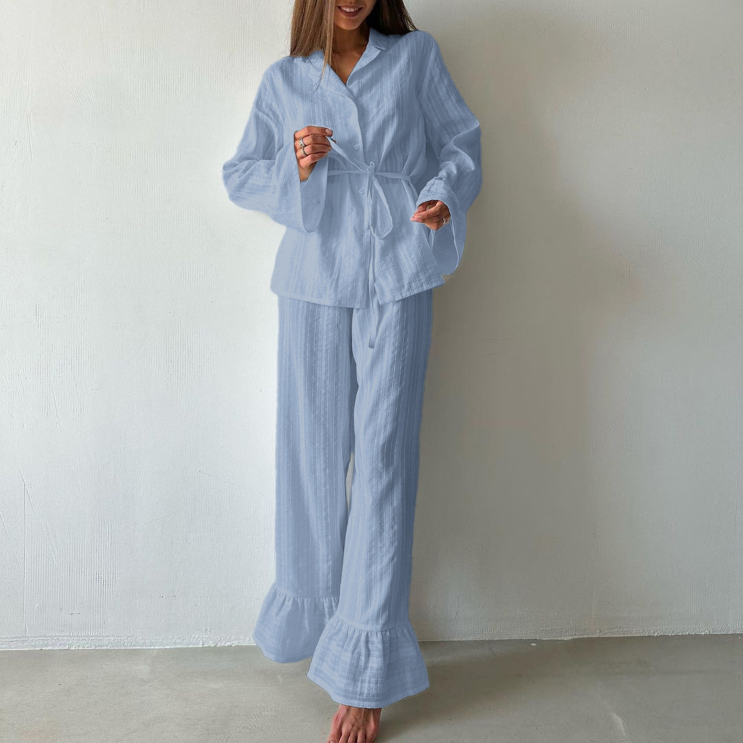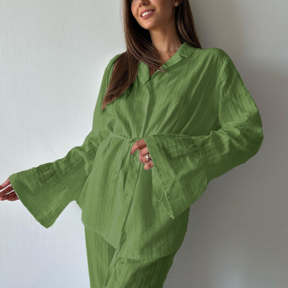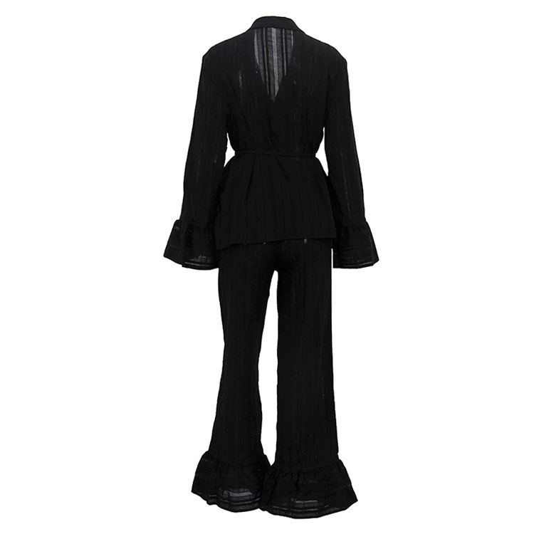 러시아 새로운 러플 레이스 업 셔츠 바지 투피스 코튼 옷깃 긴팔 캐주얼 게으른 세트 여성
