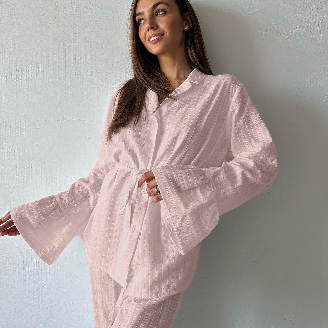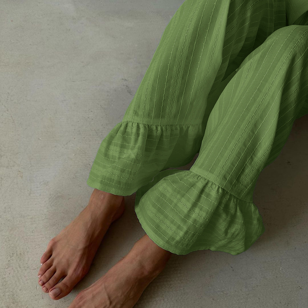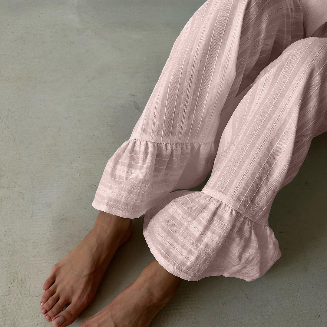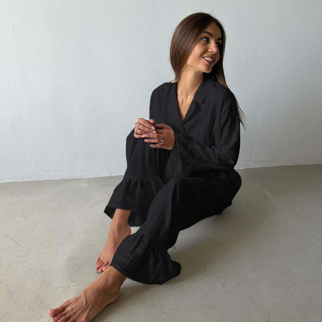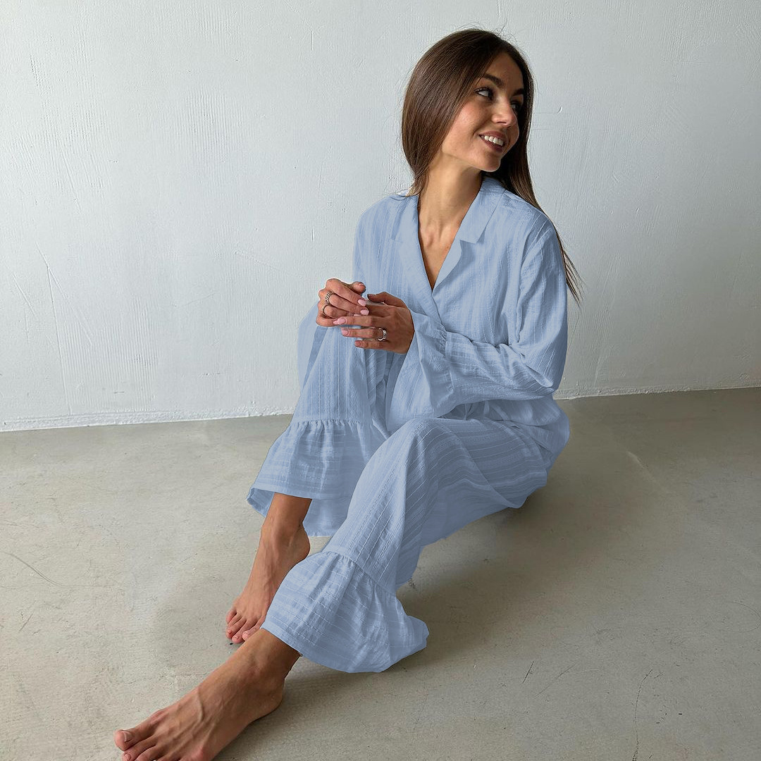 러시아 새로운 러플 레이스 업 셔츠 바지 투피스 코튼 옷깃 긴팔 캐주얼 게으른 세트 여성
