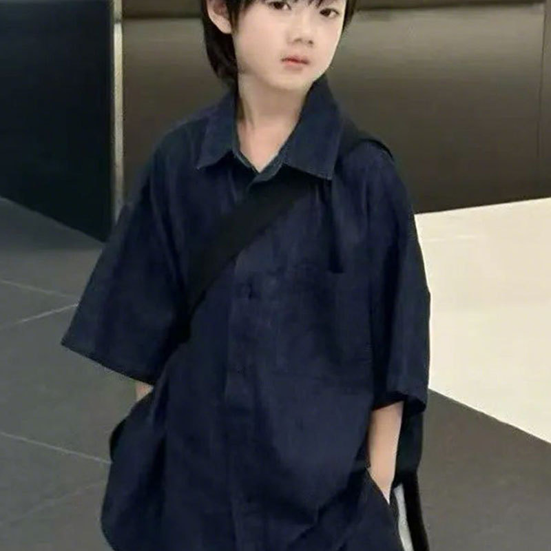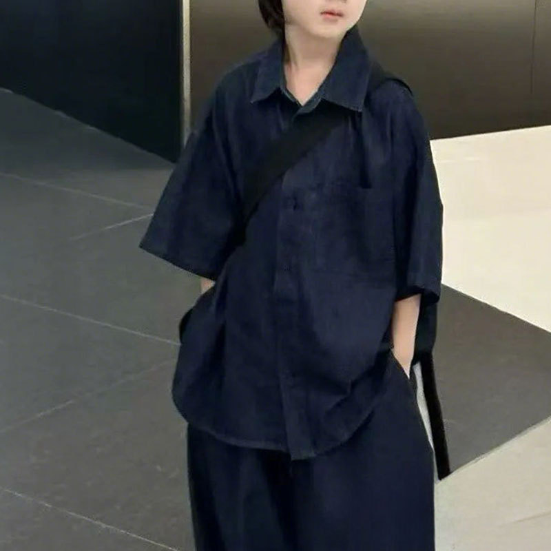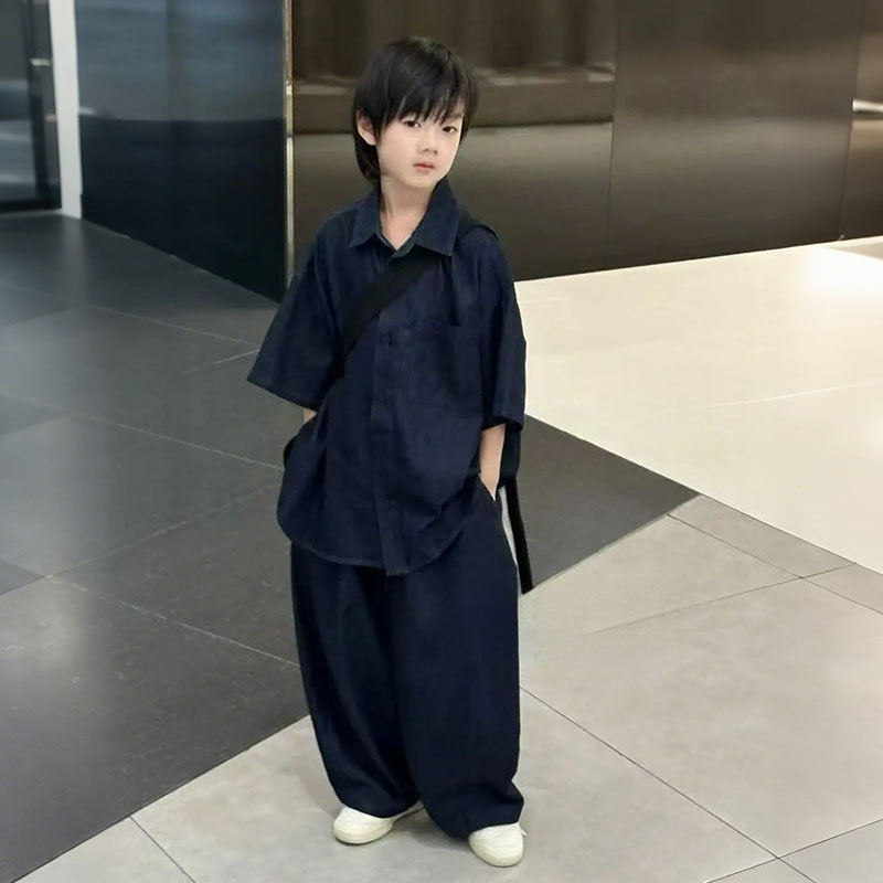 소년 세트 어린이 반팔 셔츠 바지 데님 2025 년 여름 새 소녀 블루 얇은 투피스 유행 세트