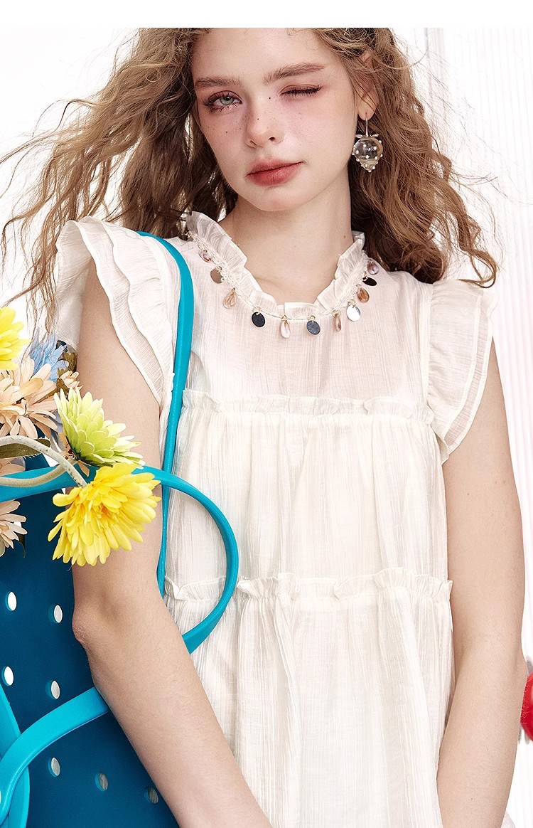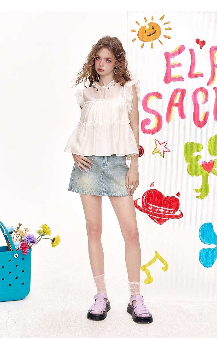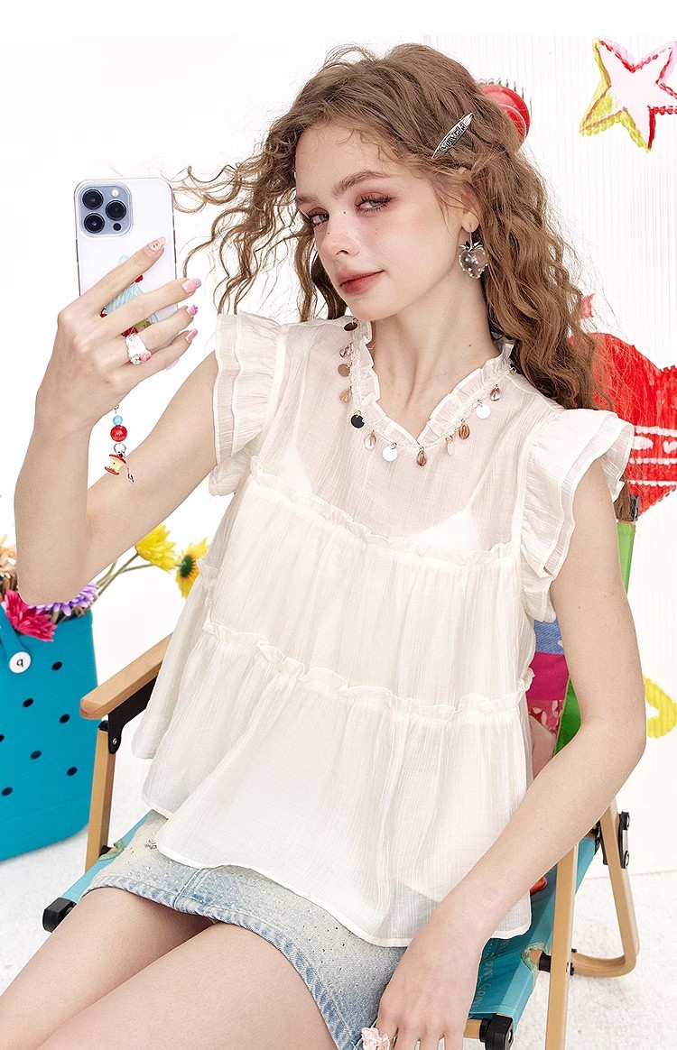 Leprechaun의 중공업 쉘 작은 비행 소매 쉬폰 셔츠 여성의 2025 년 여름 새로운 고급 우아한 탑