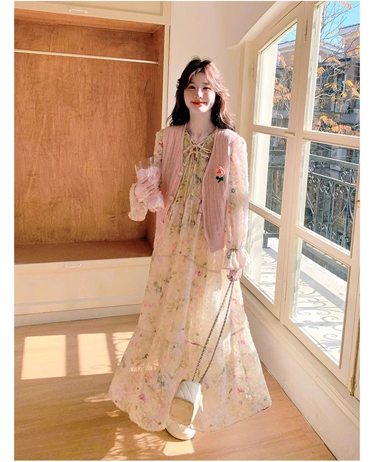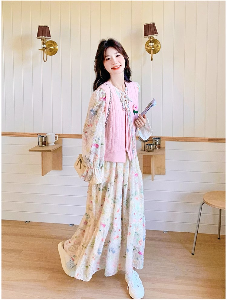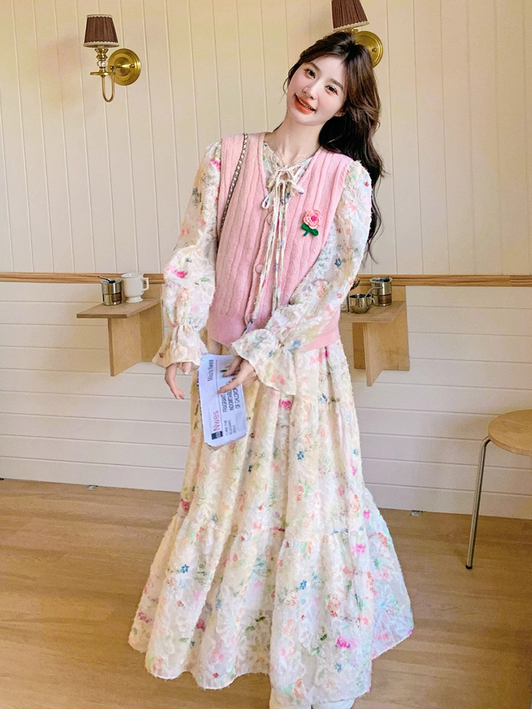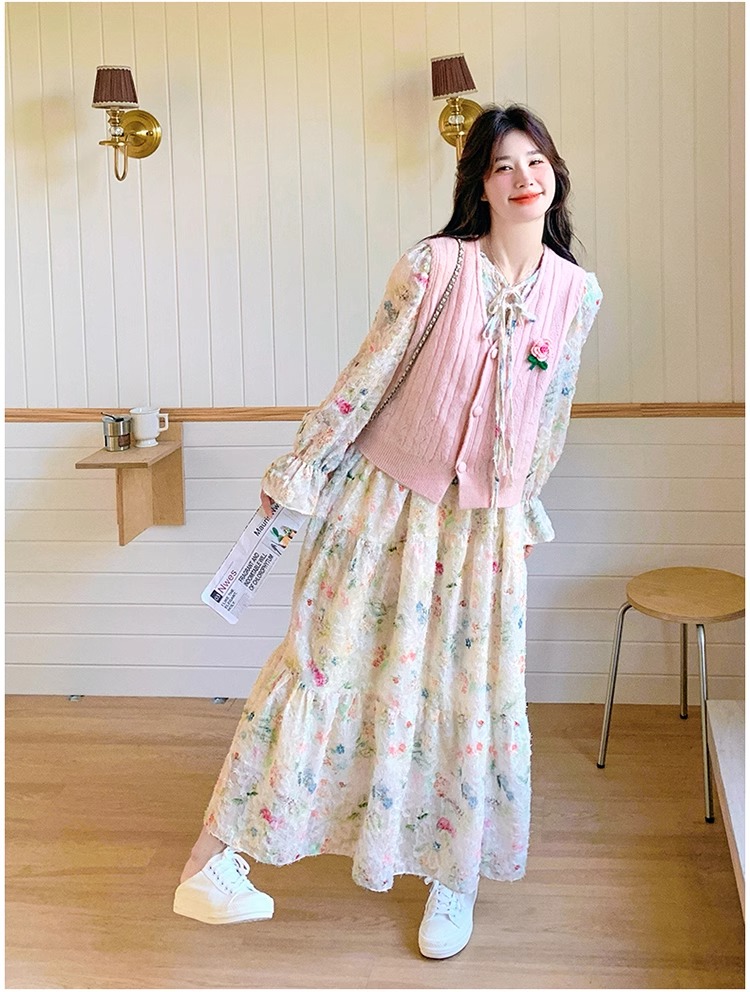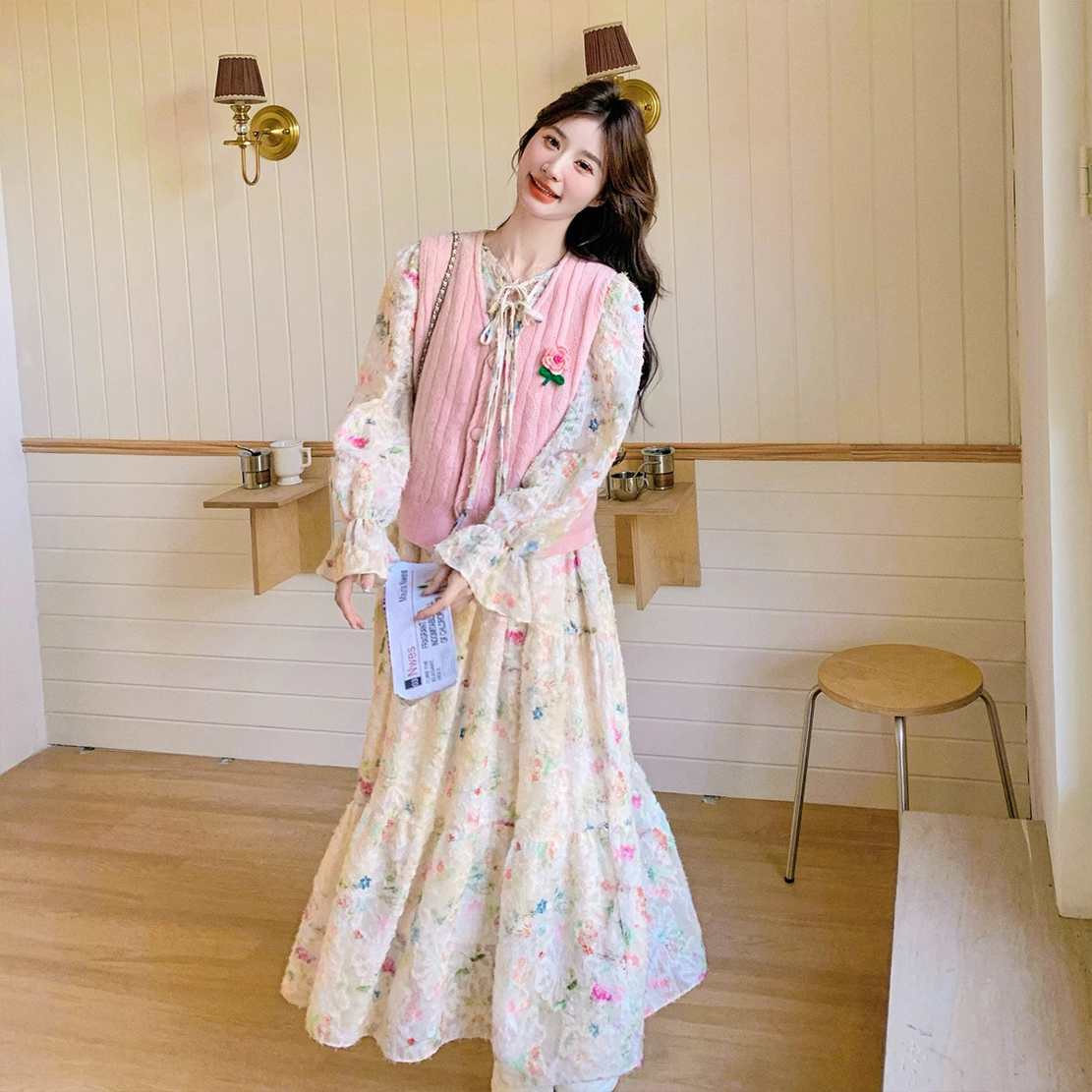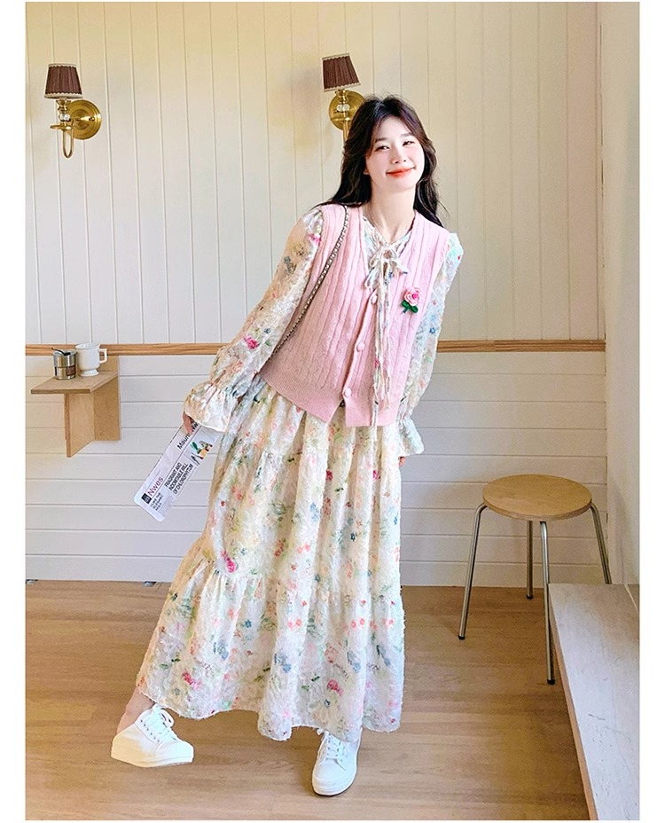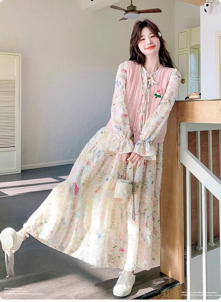 2025 슈퍼 파이어 스프링웨어 세트 여성용 달콤하고 부드러운 스타일 나이를 줄이는 슬리밍 꽃 원피스 조끼 투피스 세트