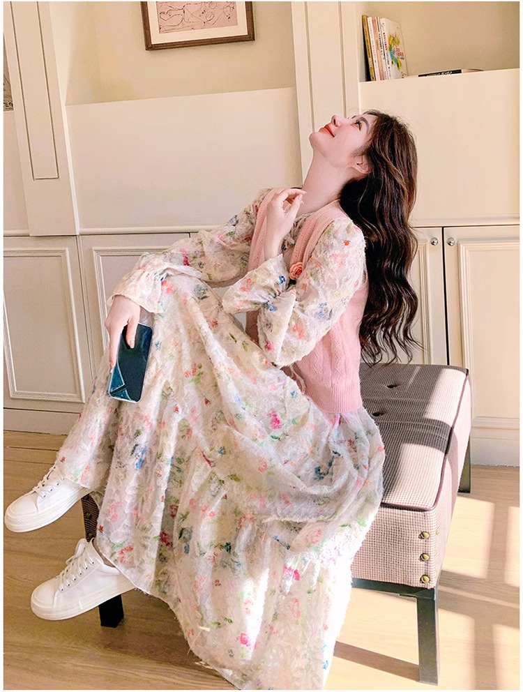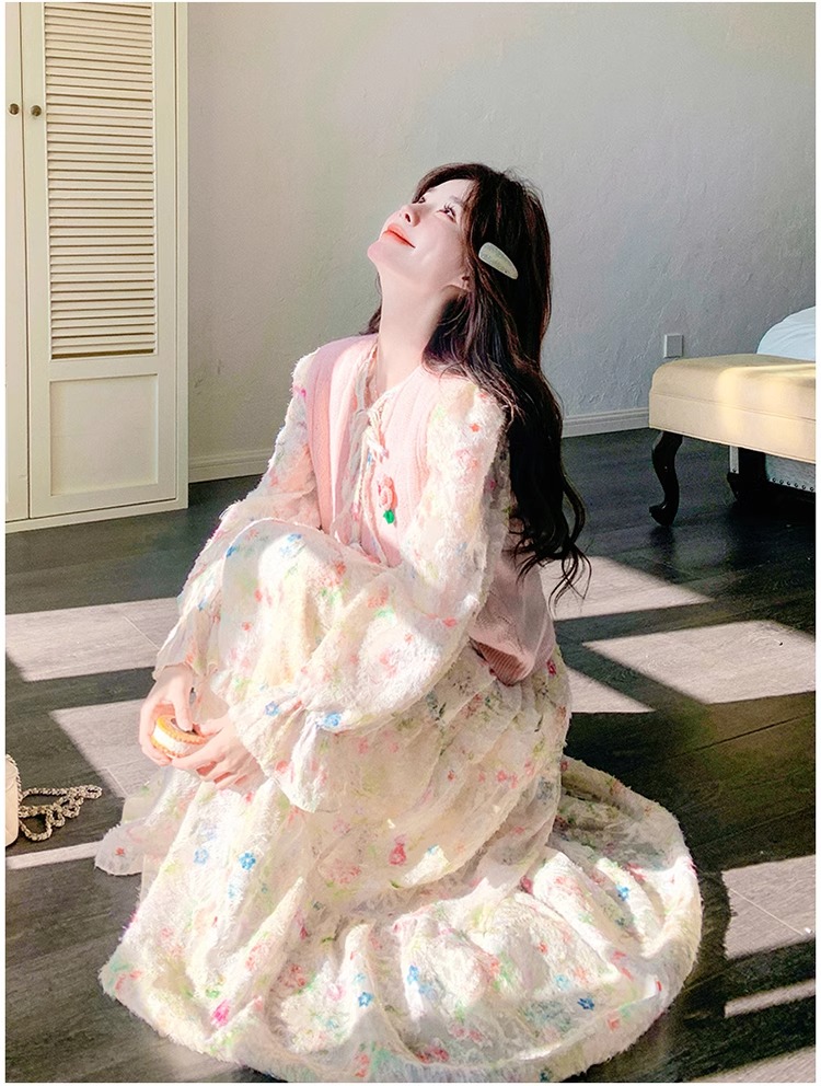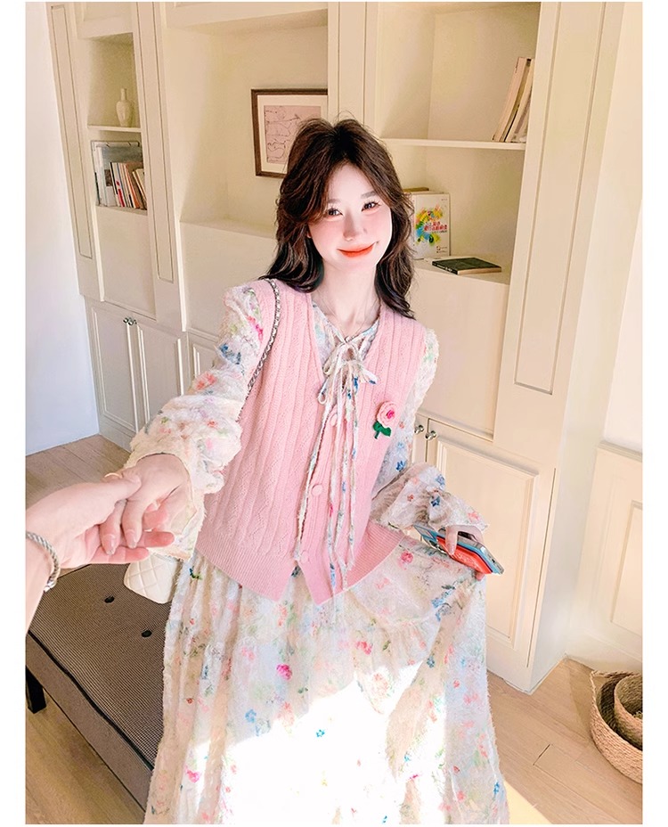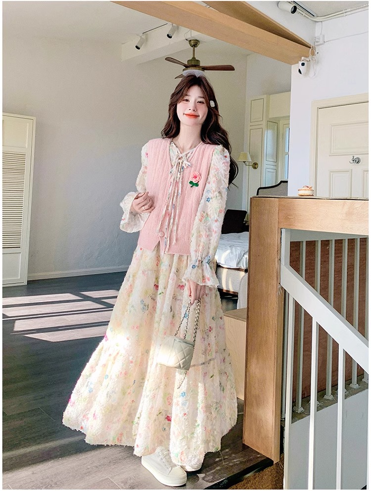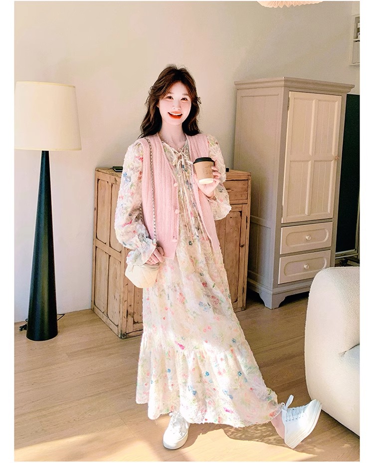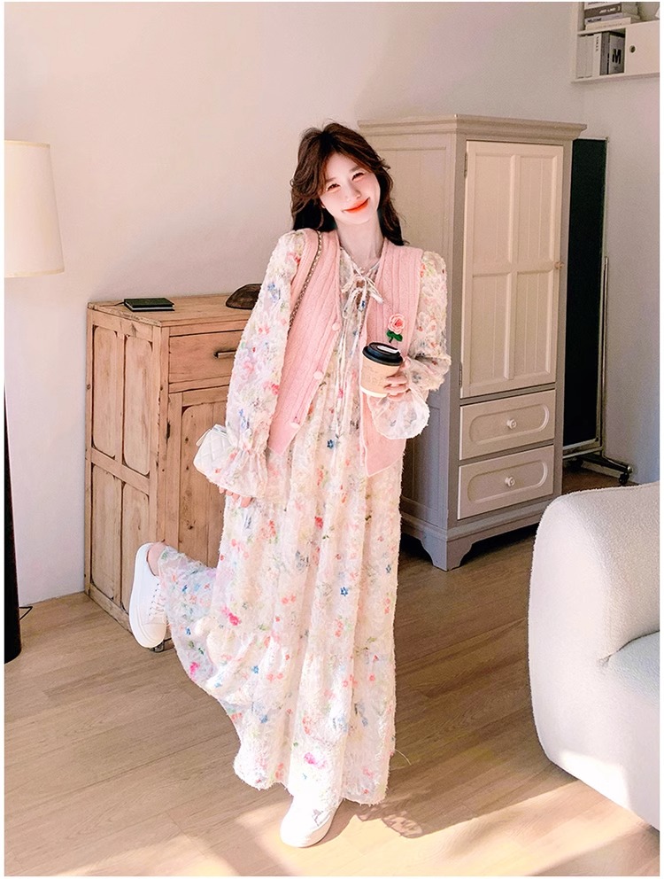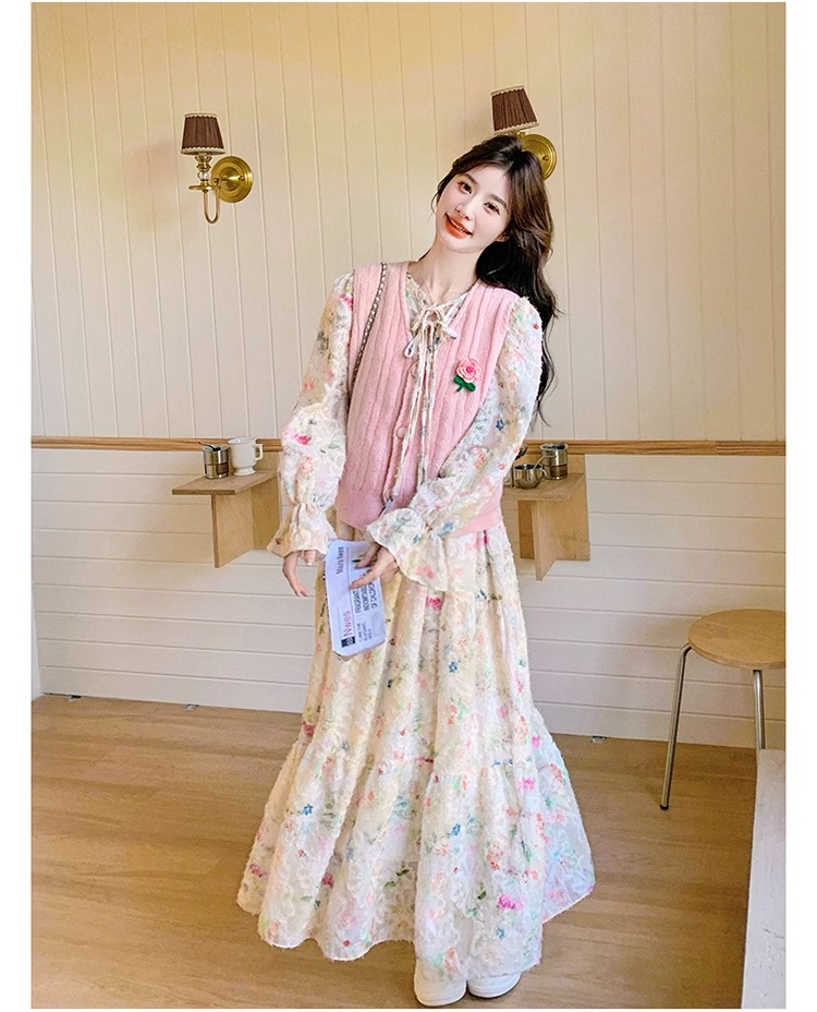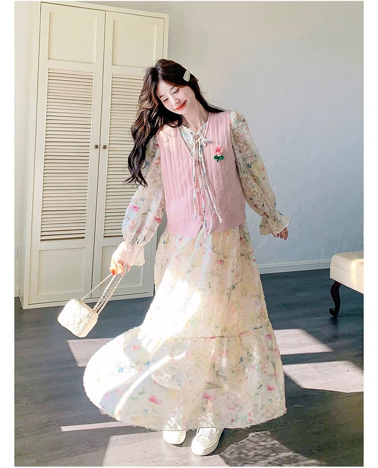 2025 슈퍼 파이어 스프링웨어 세트 여성용 달콤하고 부드러운 스타일 나이를 줄이는 슬리밍 꽃 원피스 조끼 투피스 세트
