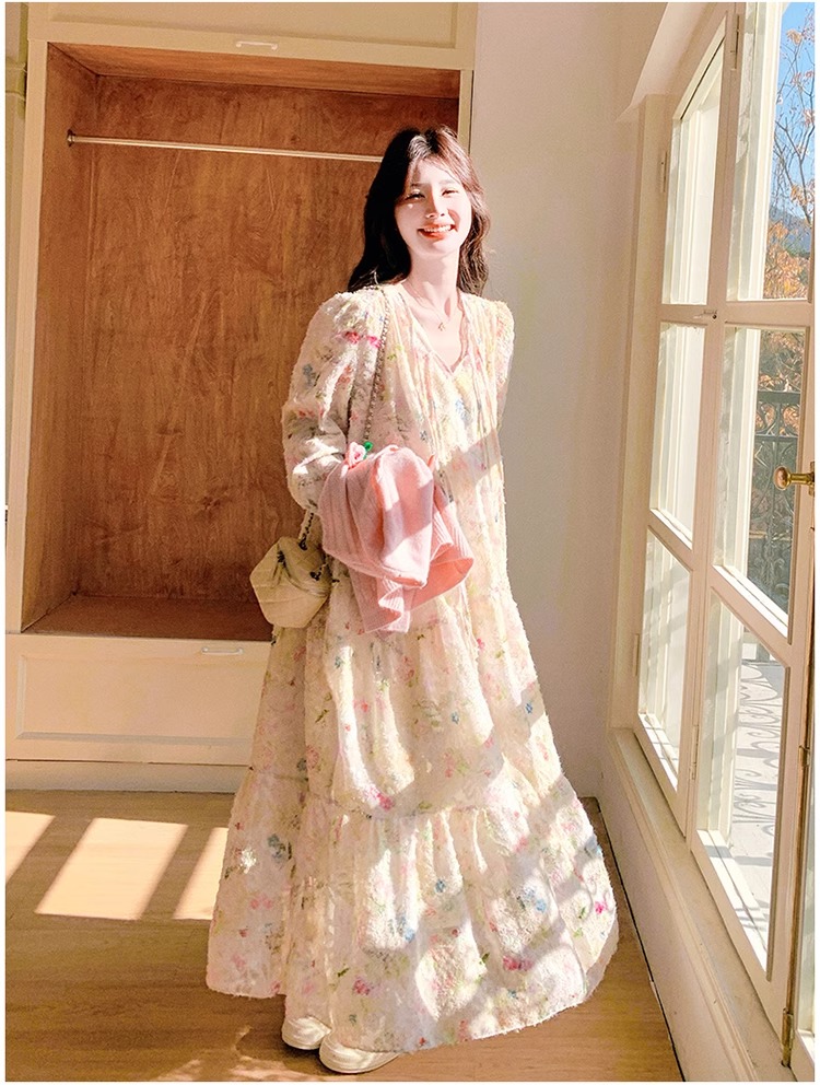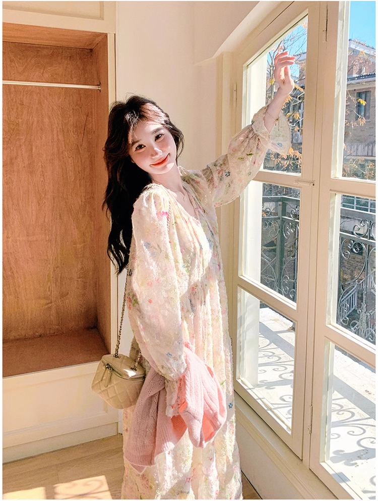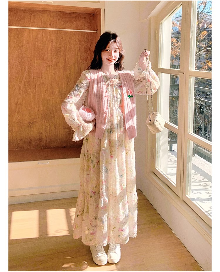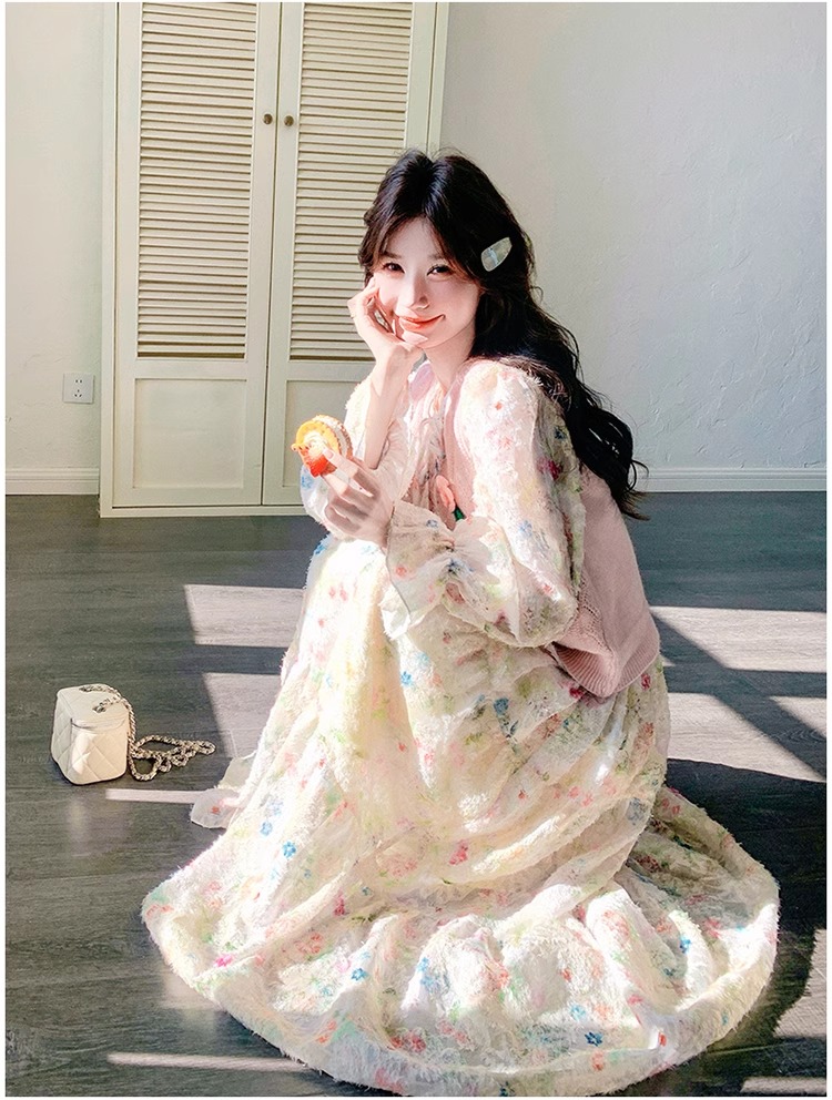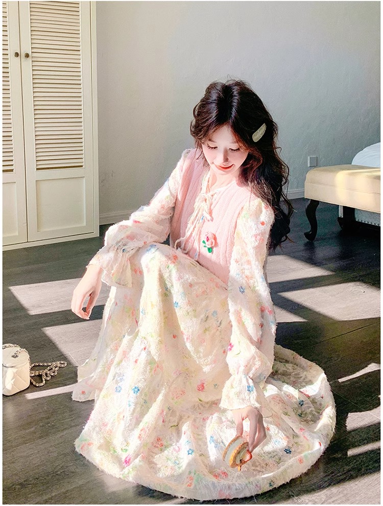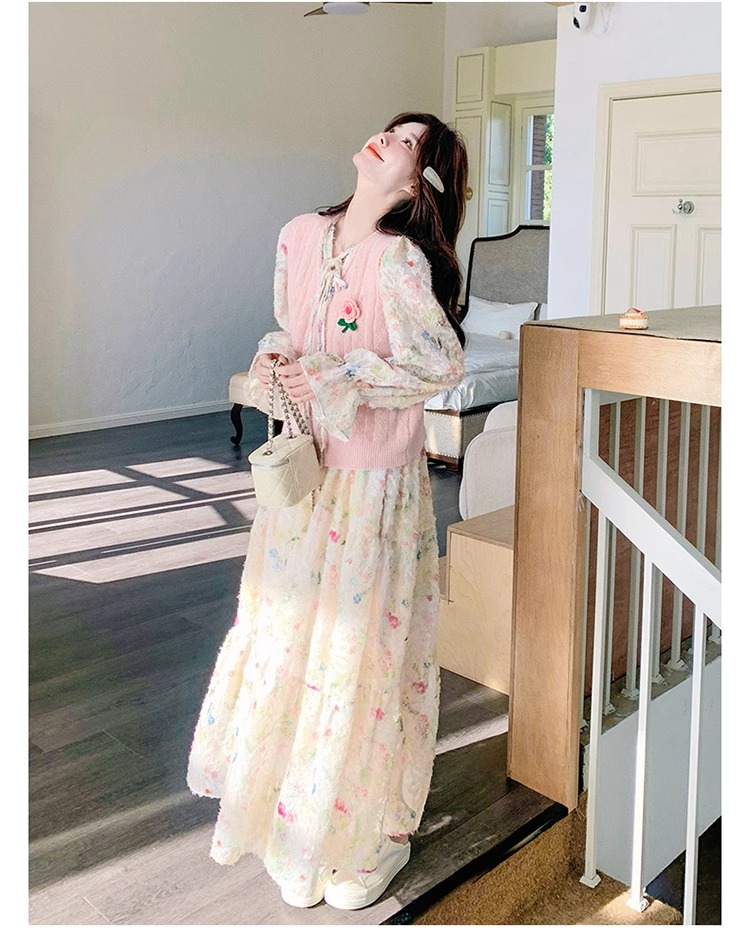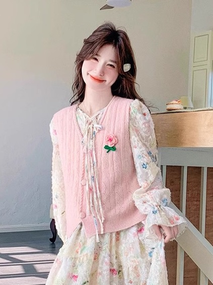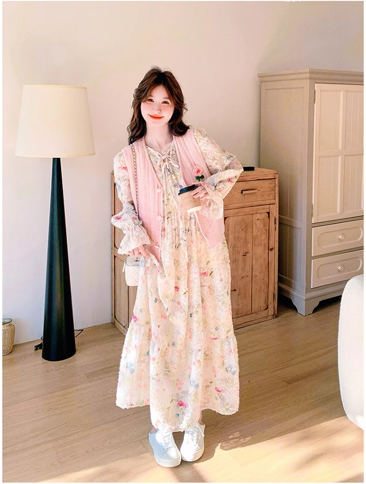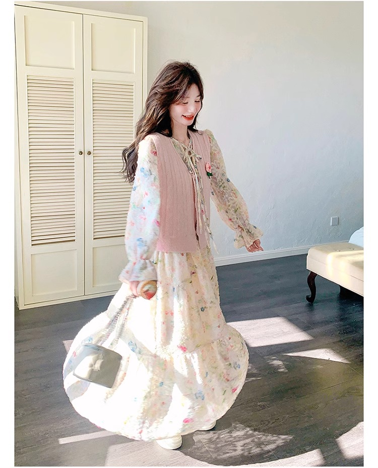 2025 슈퍼 파이어 스프링웨어 세트 여성용 달콤하고 부드러운 스타일 나이를 줄이는 슬리밍 꽃 원피스 조끼 투피스 세트