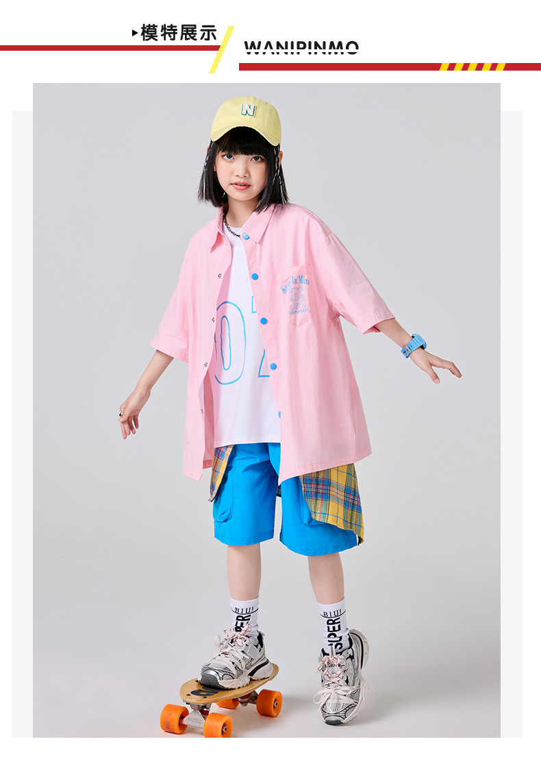 • J517 핑크 셔츠 + F08 파란색 반바지 + 노란색 체크 무늬 거들