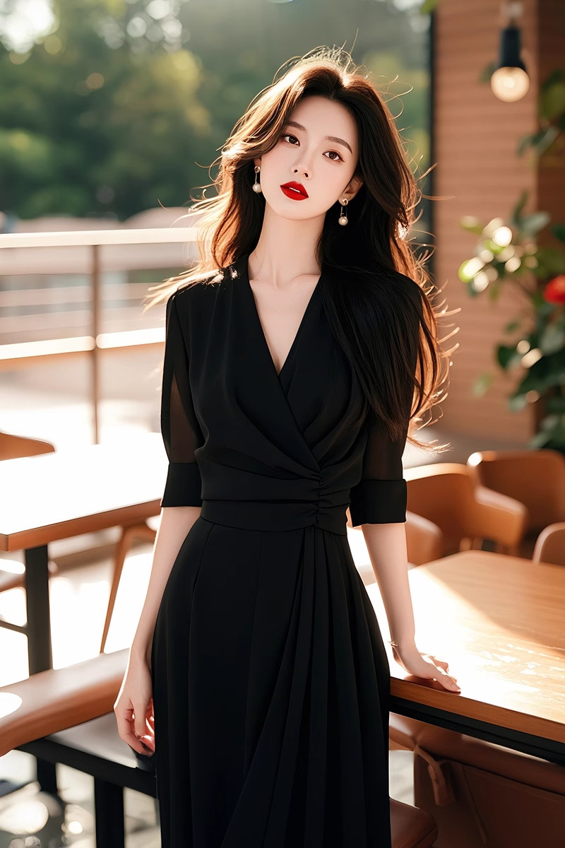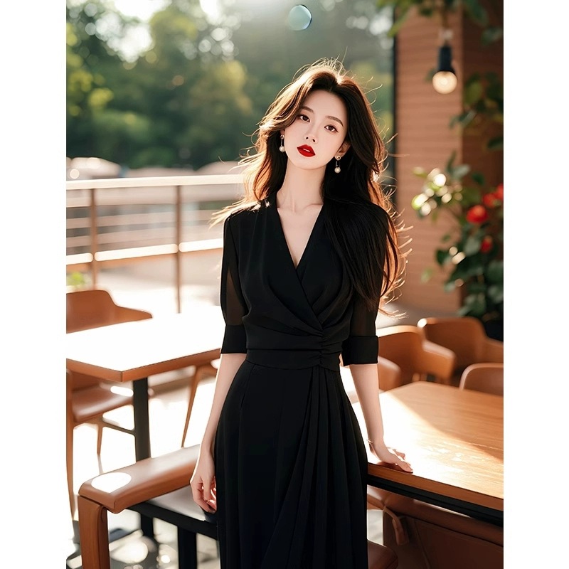 가벼운 럭셔리 하이 엔드 스타일 통근 주름 허리 슬리밍 헵번 스타일 작은 블랙 원피스 프랑스 스타일 블랙 원피스 여성 여름