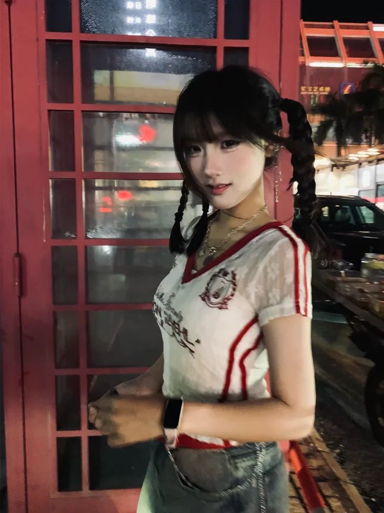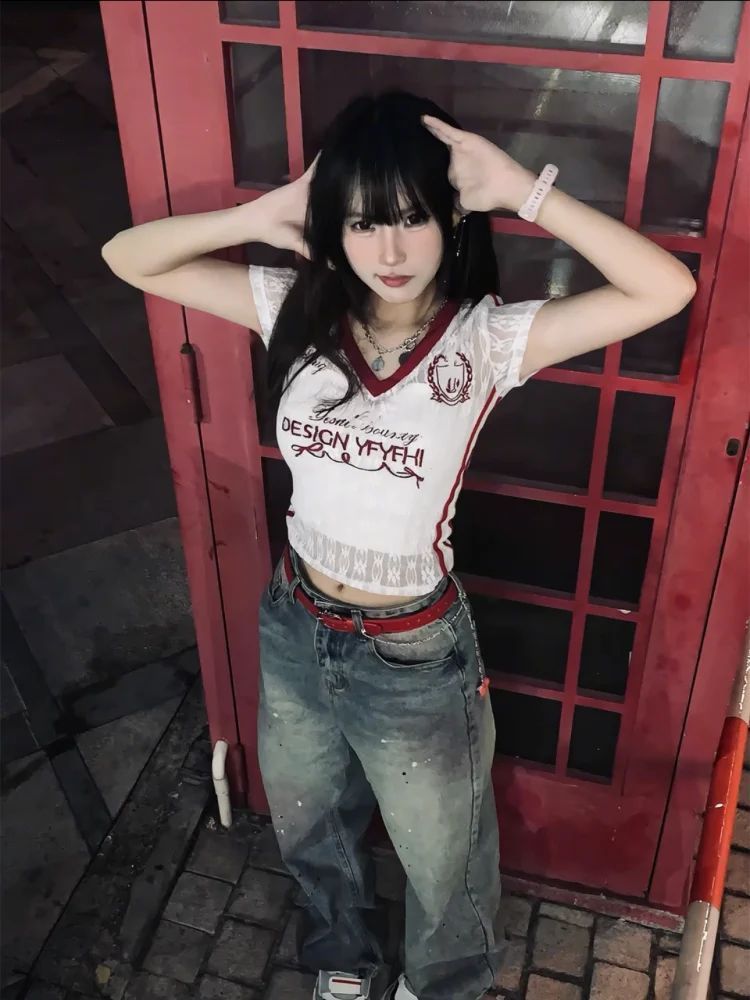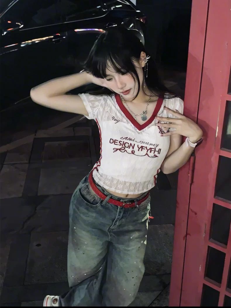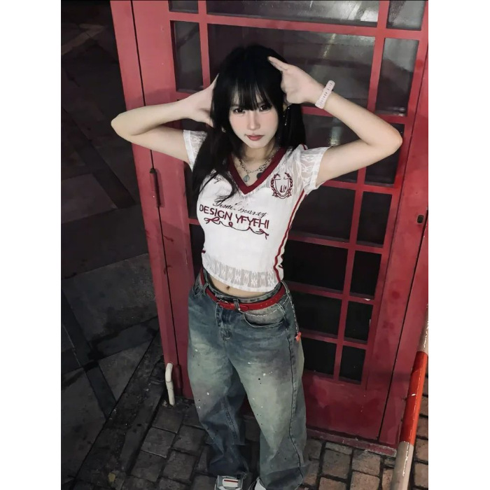 미국식 Y2K 스포츠 볼 세트 V 넥 마이크로 투명 레이스 자수 티셔츠 여성 여름 반팔 슬림 핏 슬리밍 라글란 탑스토어 가기