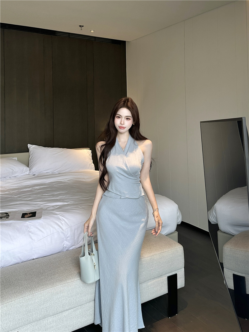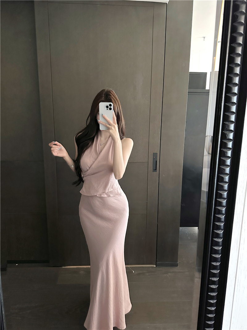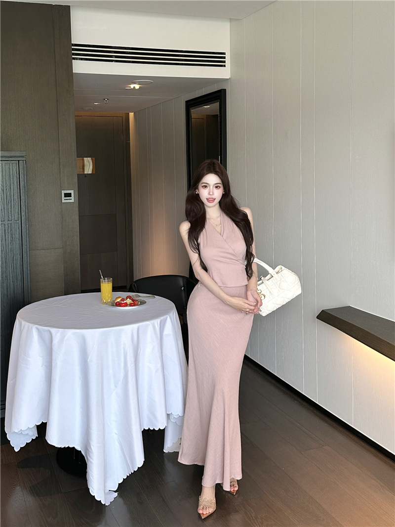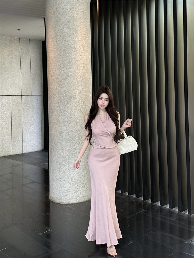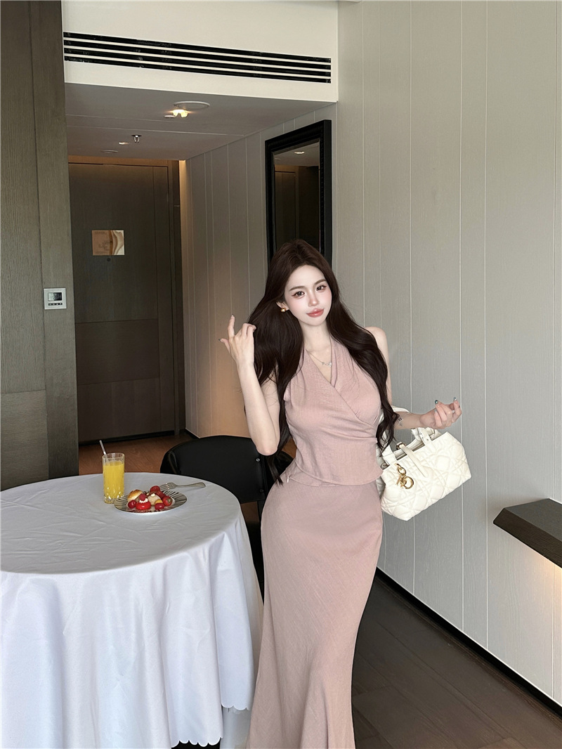 세트 여성 여름 투피스 여름 프랑스 스타일 우아한 V 넥 민소매 탑 슬림핏 슬리밍 스파이스 힙 피쉬 테일 스커트스토어 가기