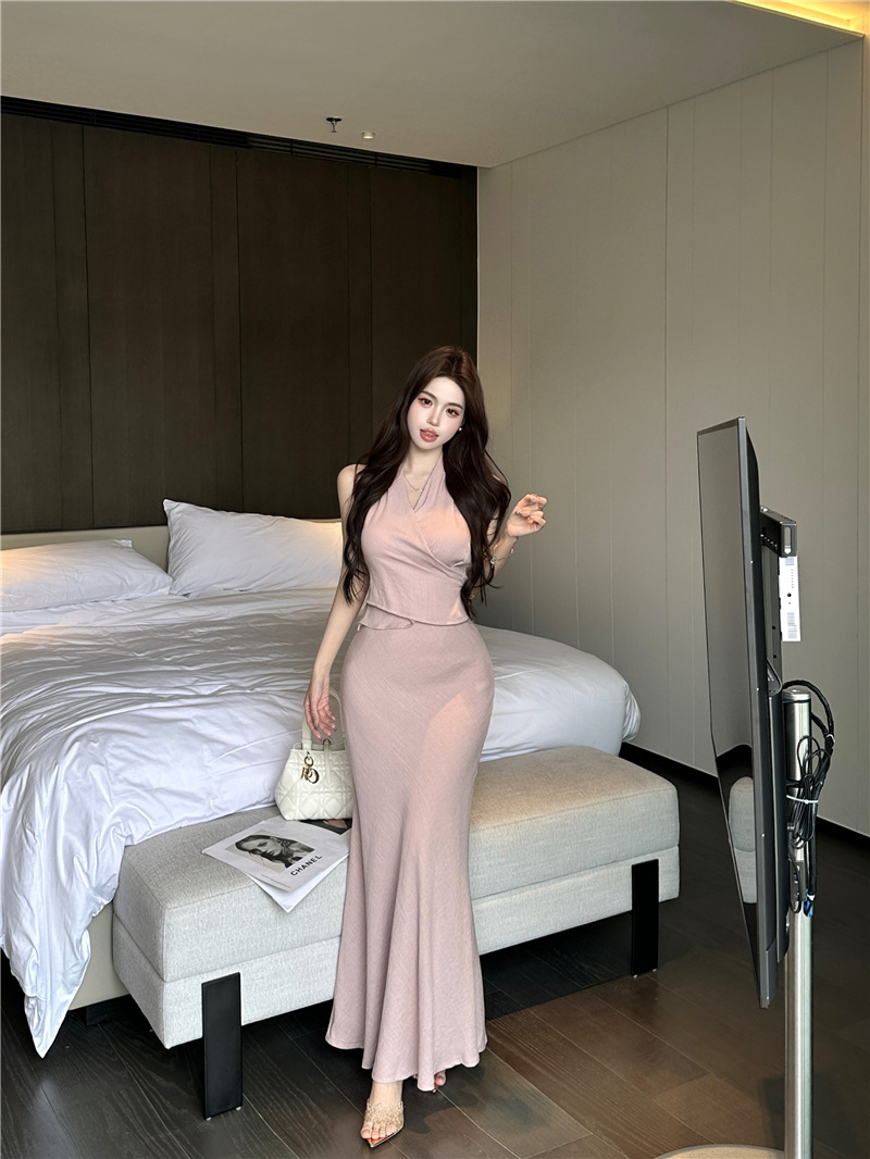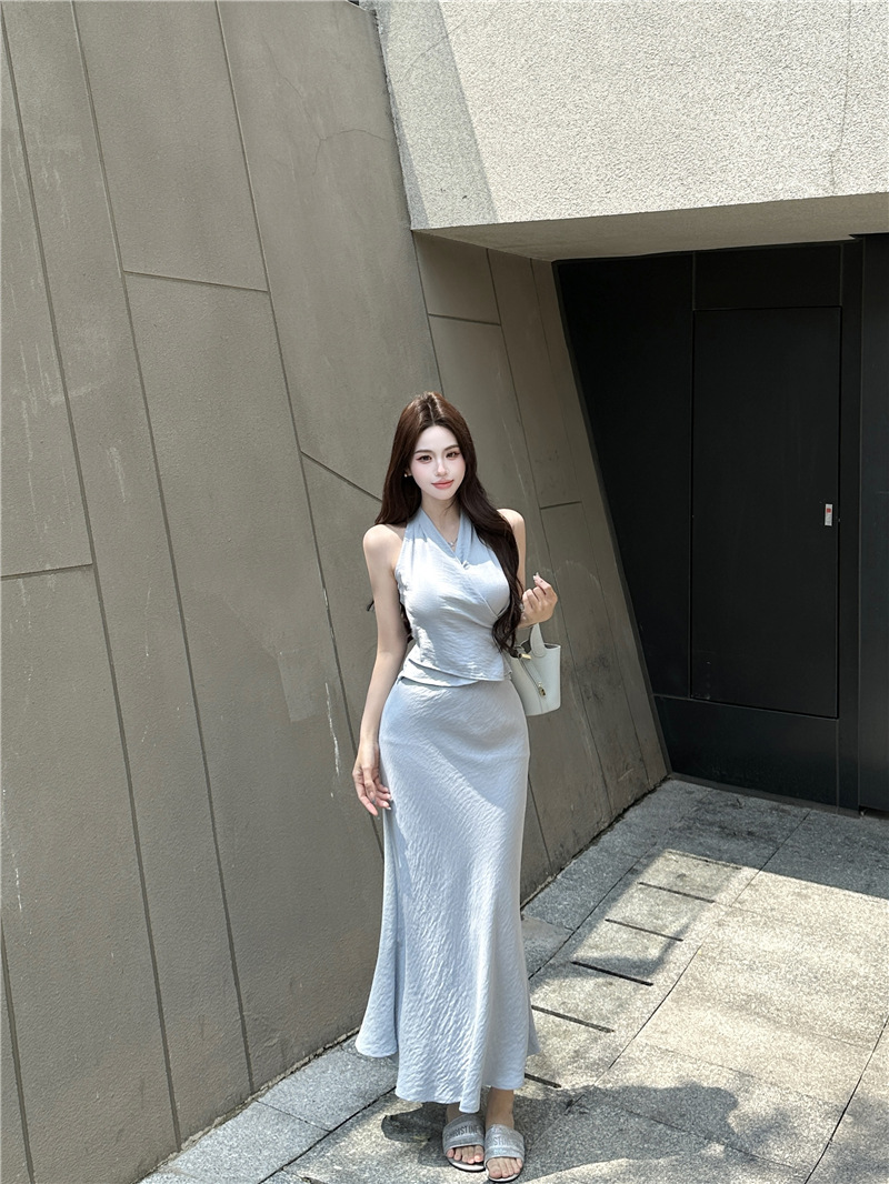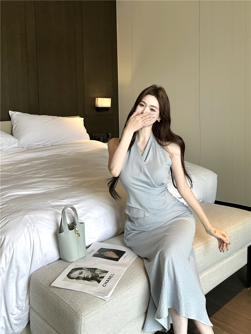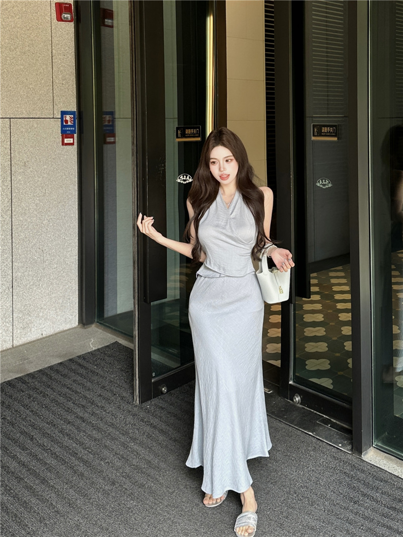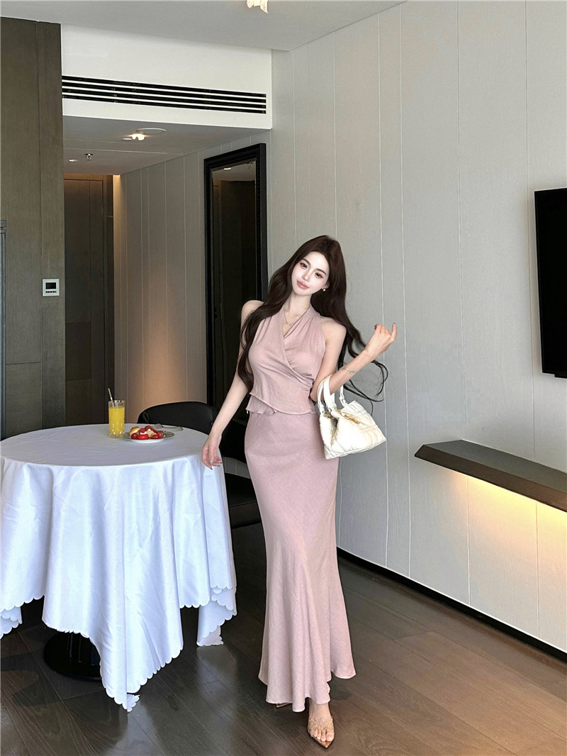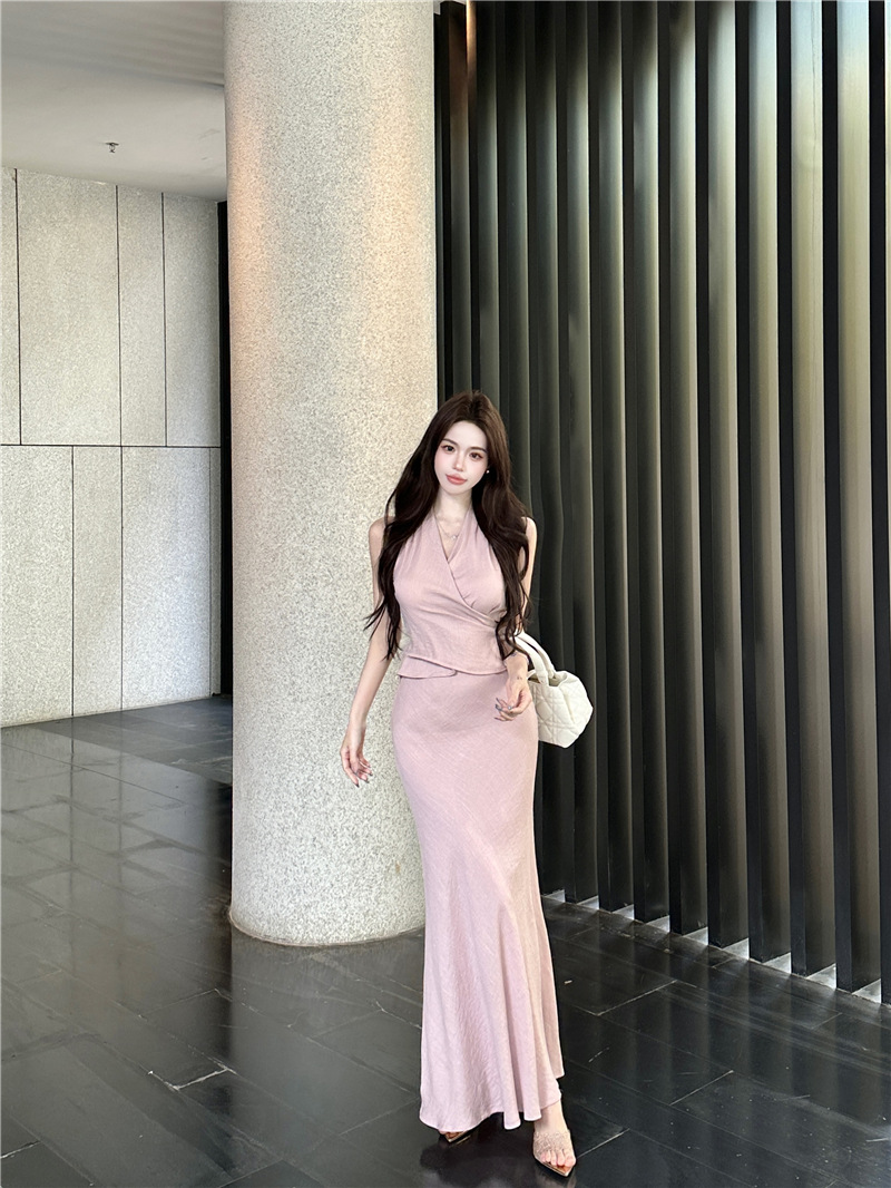세트 여성 여름 투피스 여름 프랑스 스타일 우아한 V 넥 민소매 탑 슬림핏 슬리밍 스파이스 힙 피쉬 테일 스커트스토어 가기