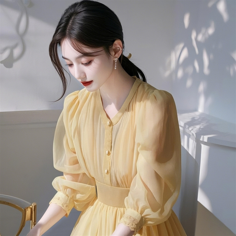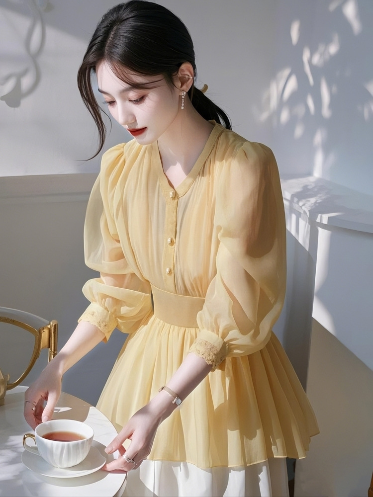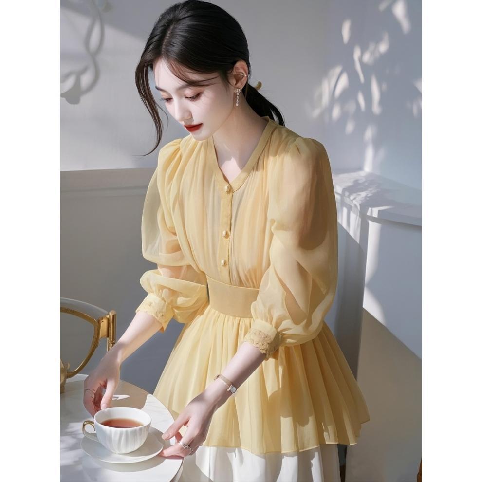 2025 슈퍼 핫 옐로우 쉬폰 셔츠 여성 하이 엔드 라이트 럭셔리 연령 감소 외국 스타일 독특하고 아름다운 허리 탑 봄스토어 가기