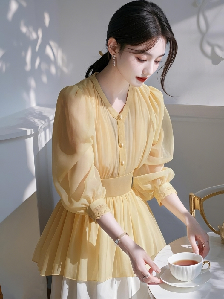 2025 슈퍼 핫 옐로우 쉬폰 셔츠 여성 하이 엔드 라이트 럭셔리 연령 감소 외국 스타일 독특하고 아름다운 허리 탑 봄