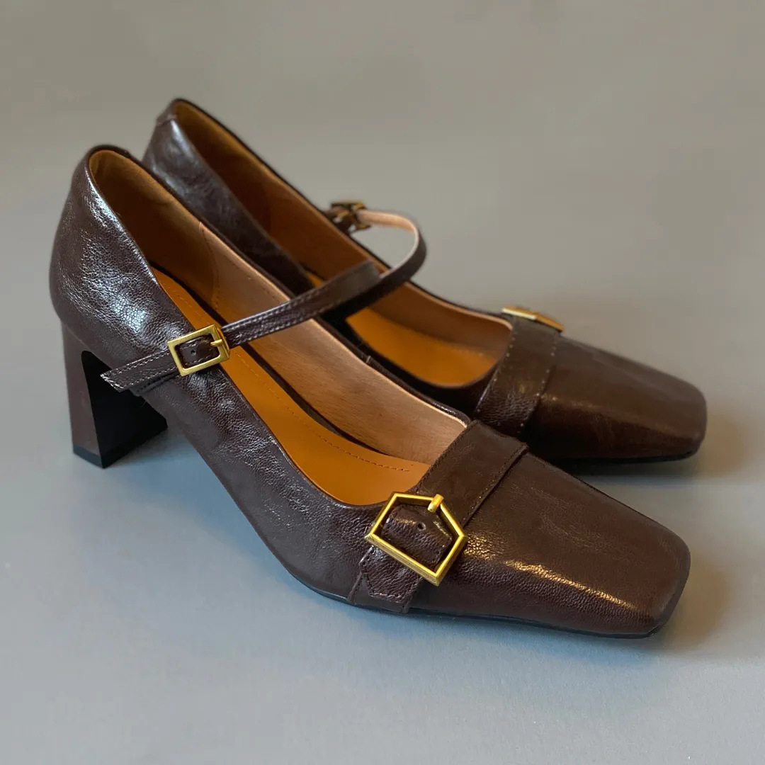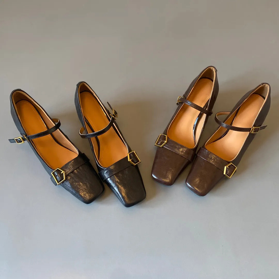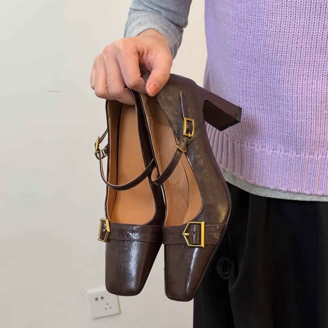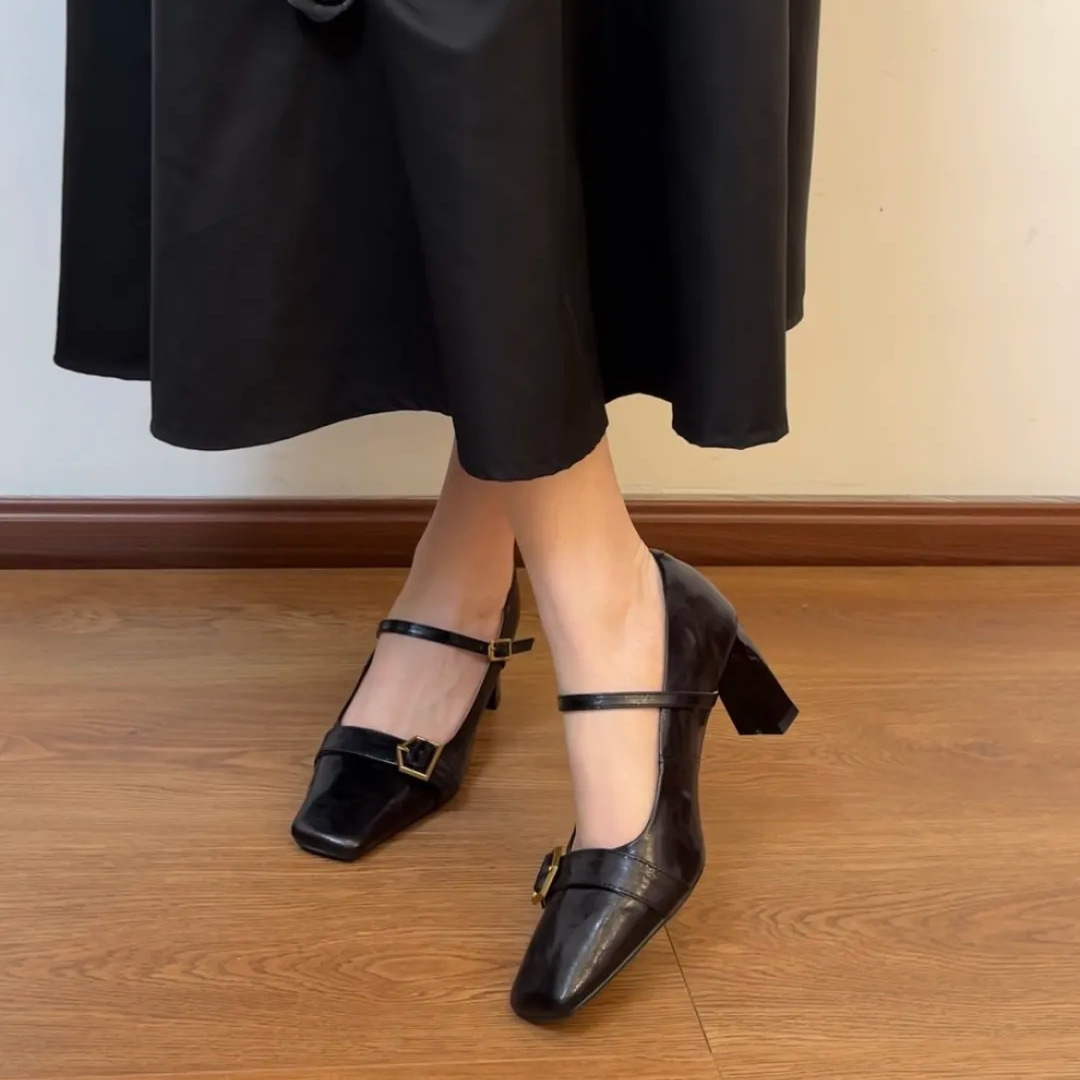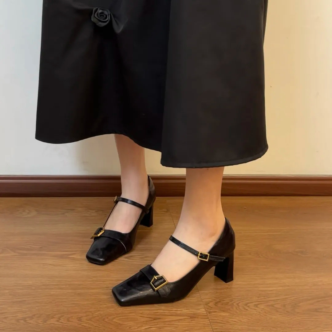 2025 신상 벨트 버클 두꺼운 굽 단화 메리제인 슈즈 스퀘어토 하이힐 프렌치 레트로 여성용 우아한 스타일