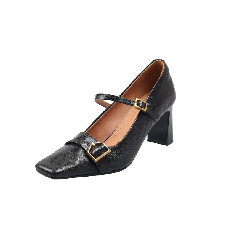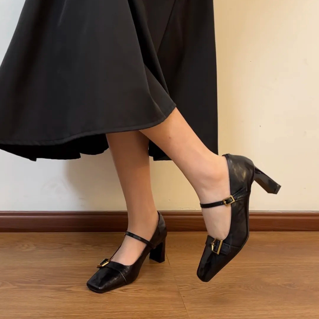 2025 신상 벨트 버클 두꺼운 굽 단화 메리제인 슈즈 스퀘어토 하이힐 프렌치 레트로 여성용 우아한 스타일스토어 가기