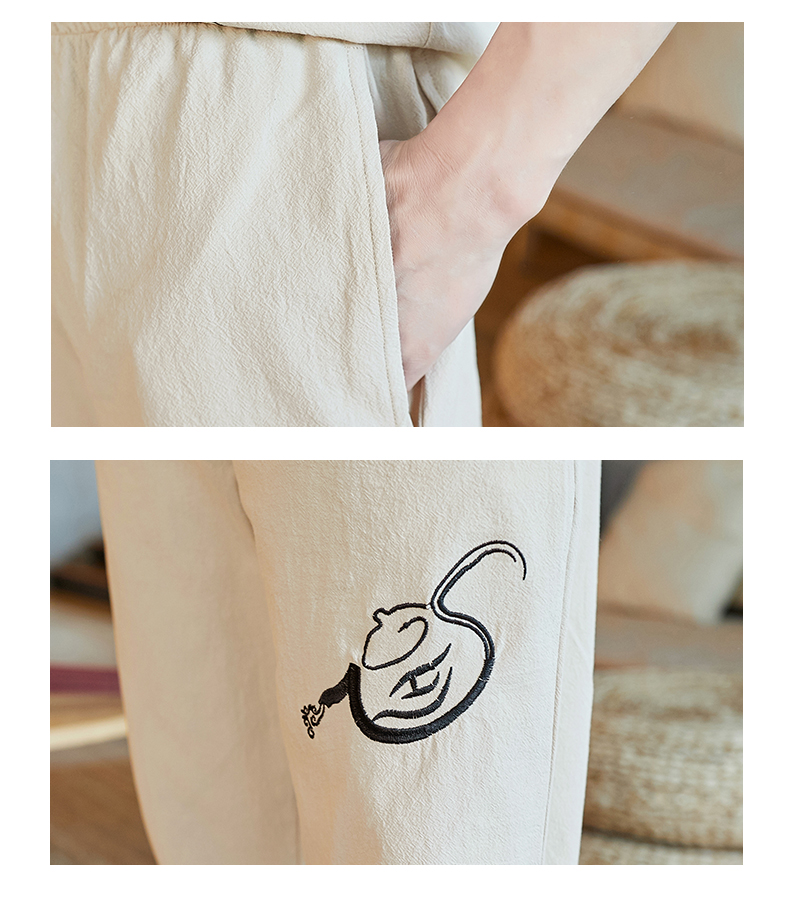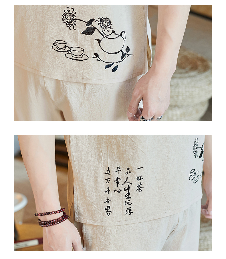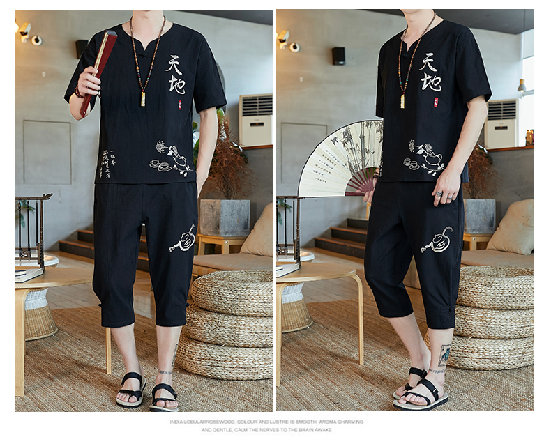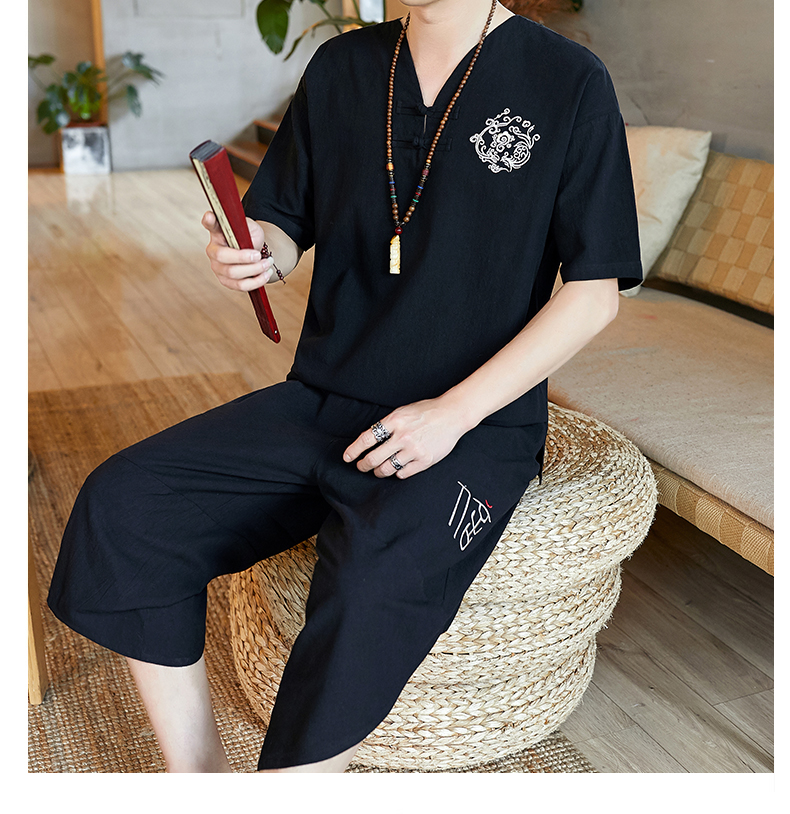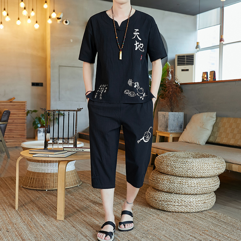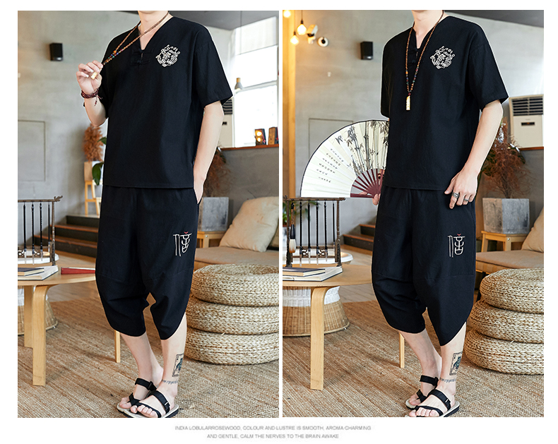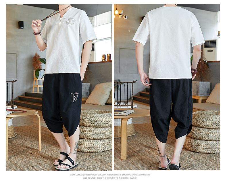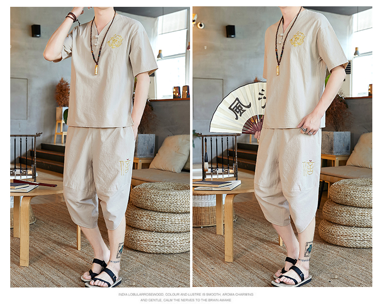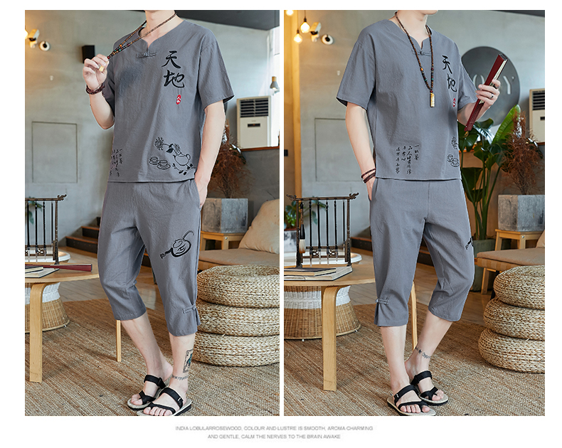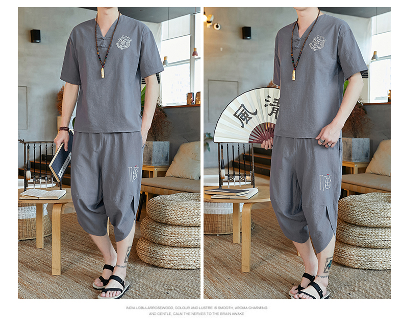 중국 스타일 잠옷 남성 여름 면 및 린넨 반팔 크롭 팬츠 루즈하고 얇은 스타일은 남성용 홈웨어 슈트 외부에 착용 가능
