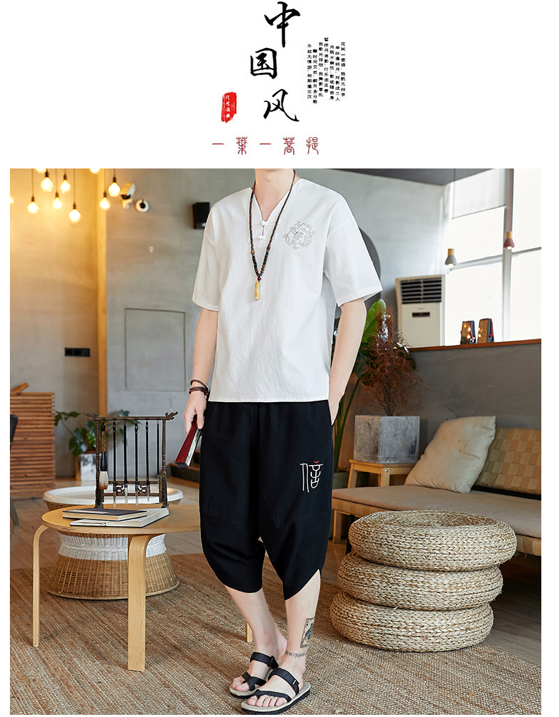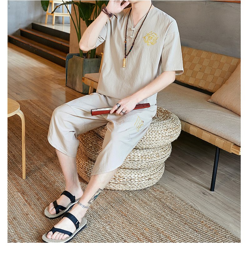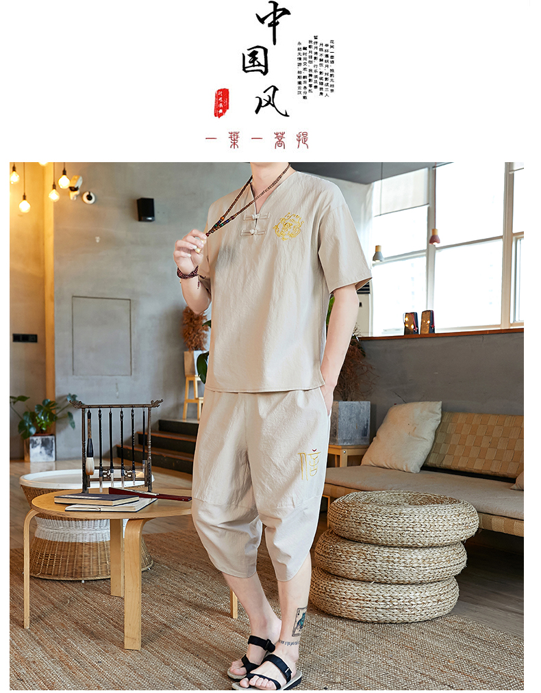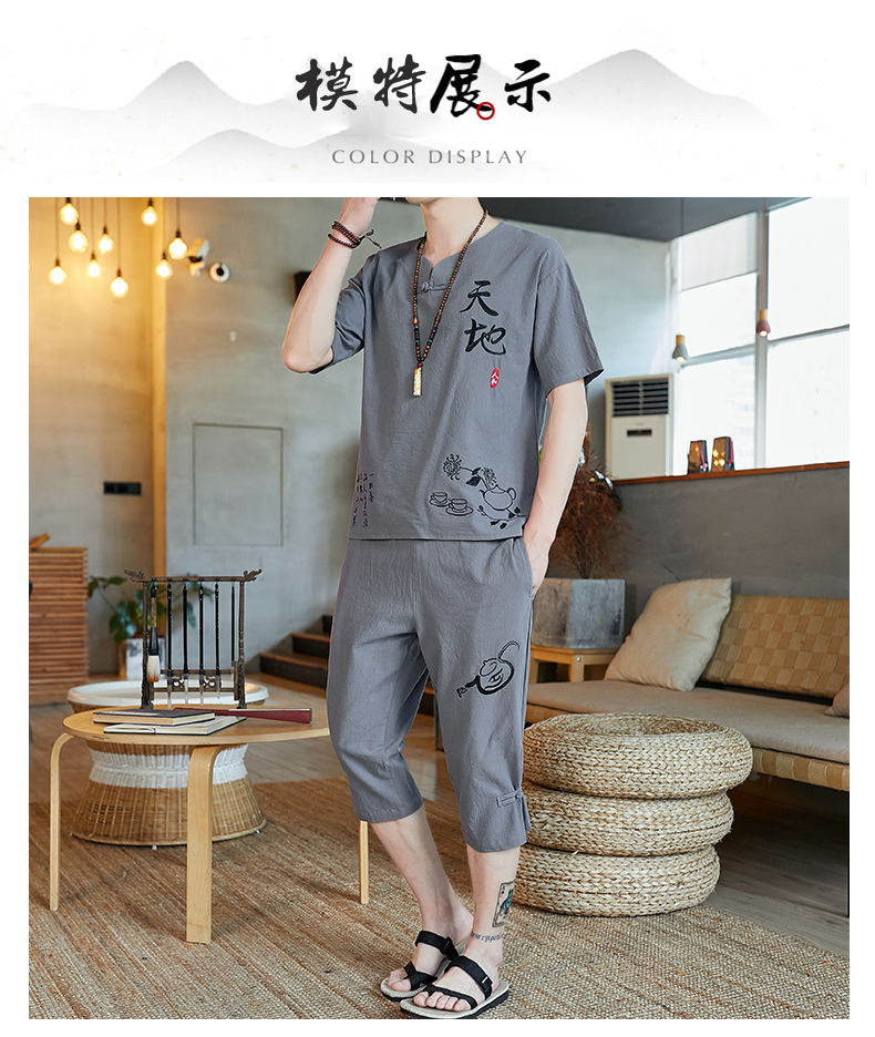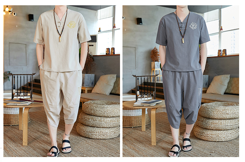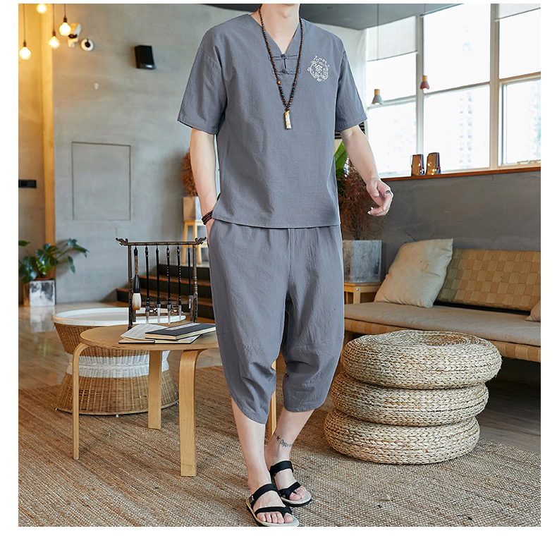 중국 스타일 잠옷 남성 여름 면 및 린넨 반팔 크롭 팬츠 루즈하고 얇은 스타일은 남성용 홈웨어 슈트 외부에 착용 가능스토어 가기