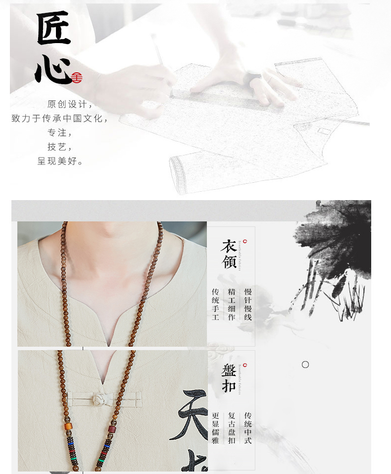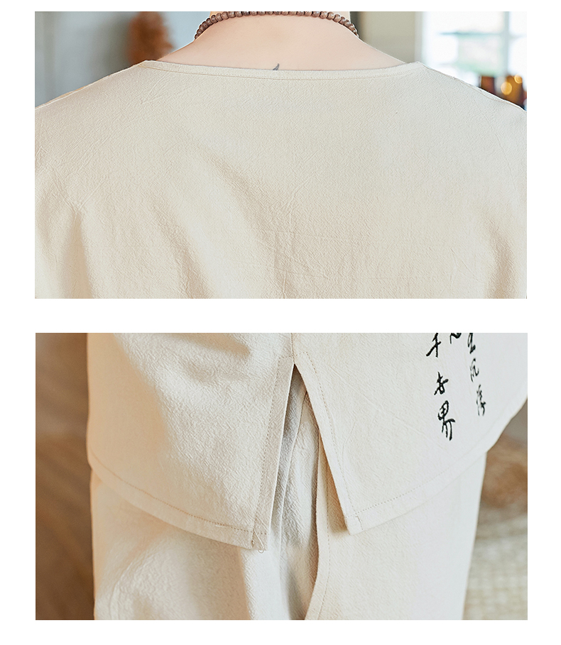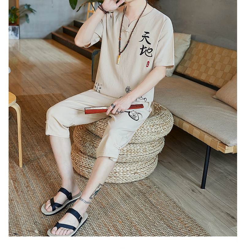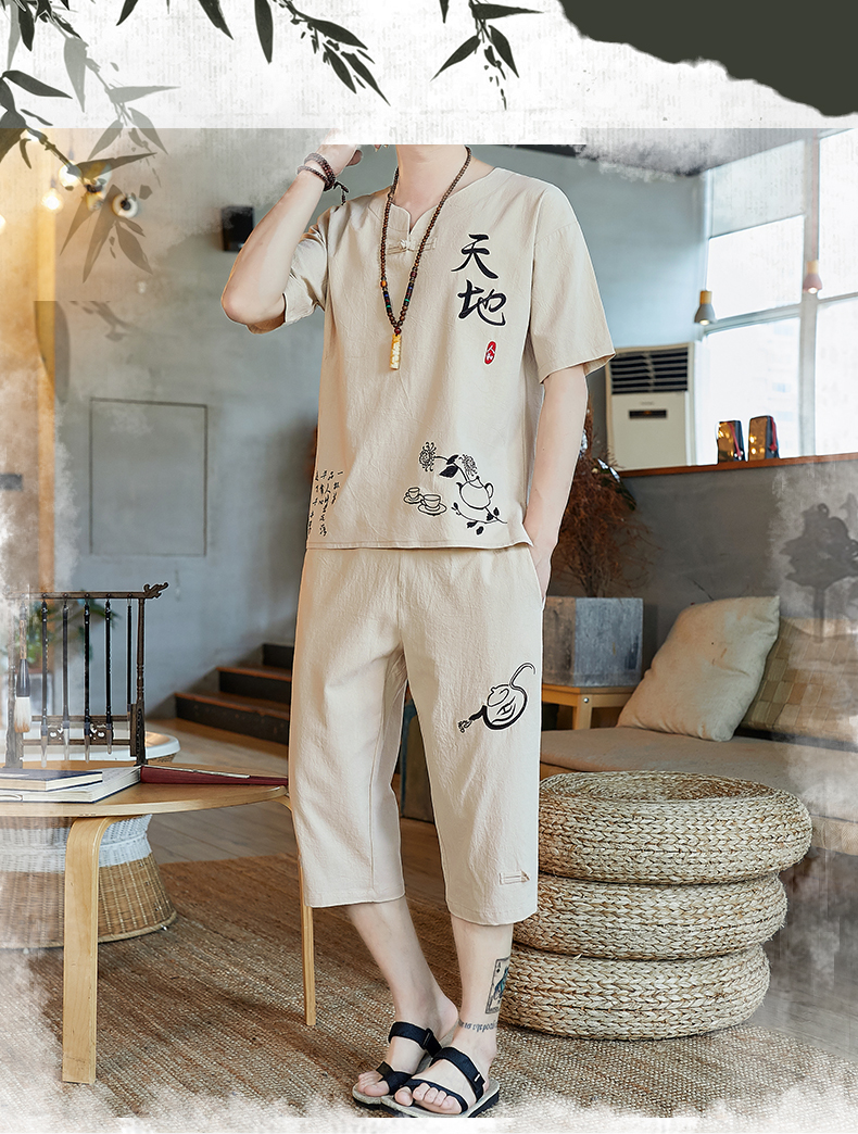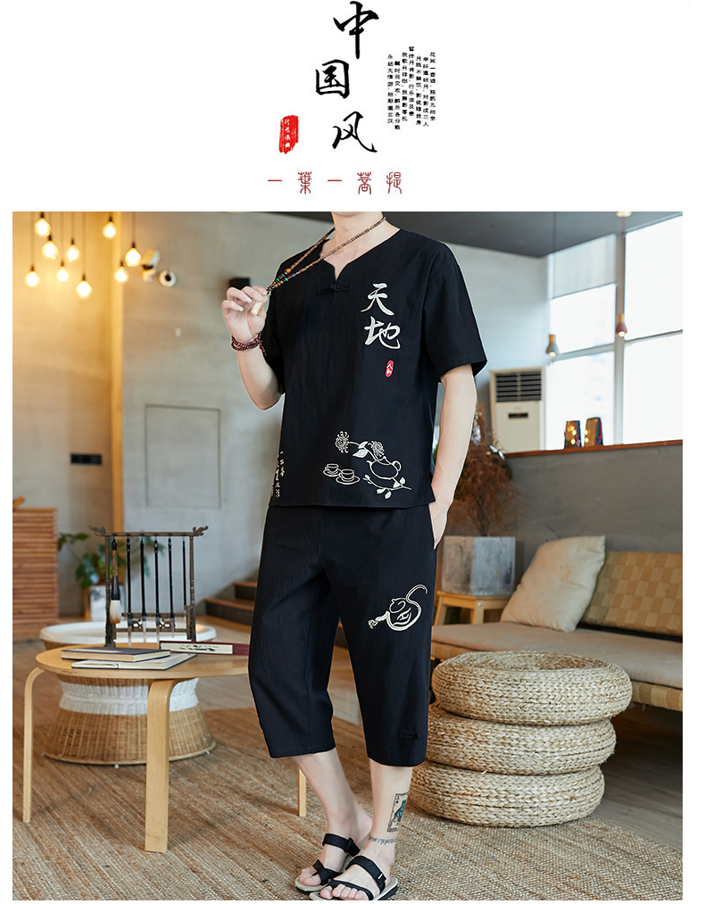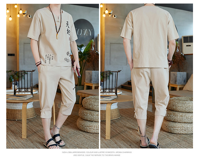 중국 스타일 잠옷 남성 여름 면 및 린넨 반팔 크롭 팬츠 루즈하고 얇은 스타일은 남성용 홈웨어 슈트 외부에 착용 가능스토어 가기
