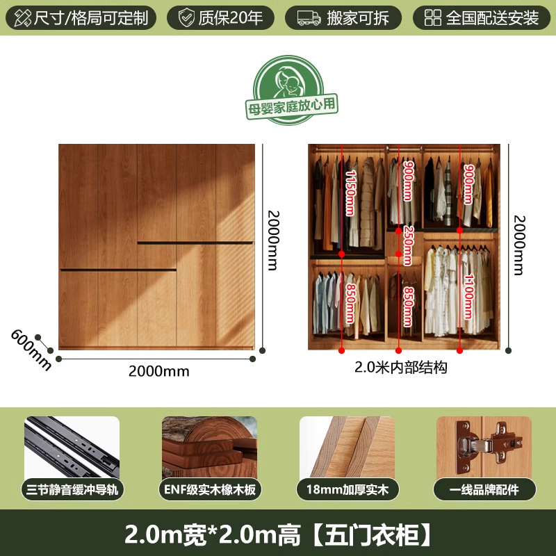 • [길이 2.0m*높이 2.0m] 5도어 옷장 [올 원목]