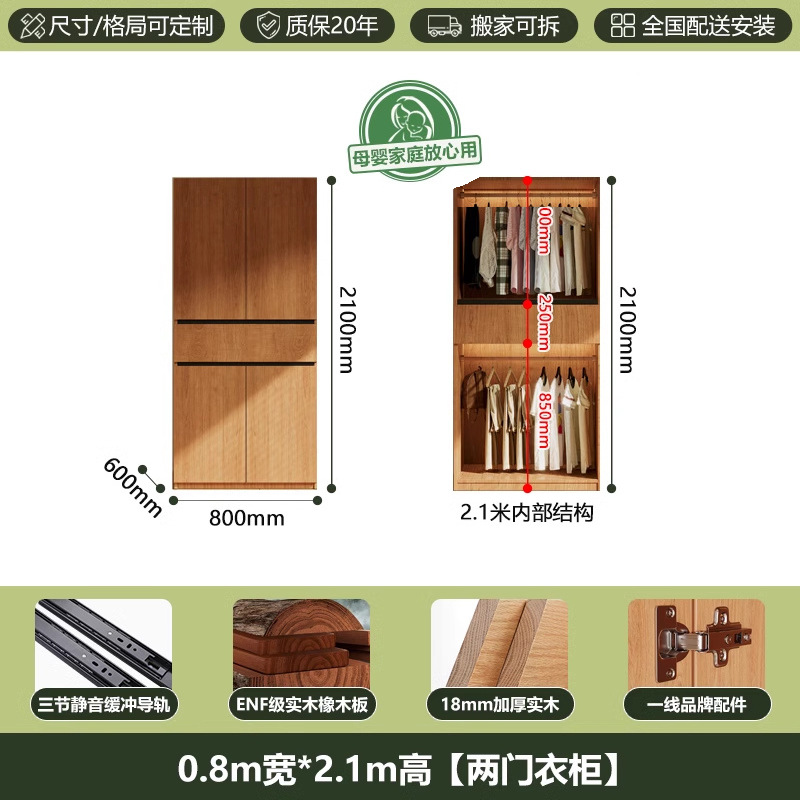 • [길이 0.8m*높이 2.1m] 2도어 옷장 [올 원목]