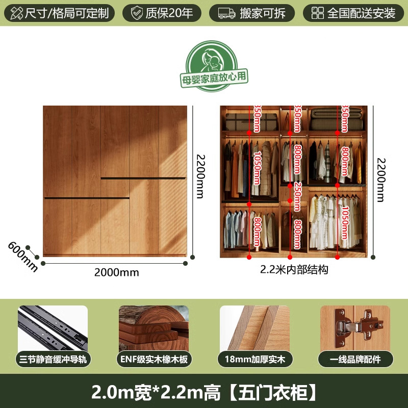 • [길이 2.0m*높이 2.2m] 5도어 옷장 [올 원목]