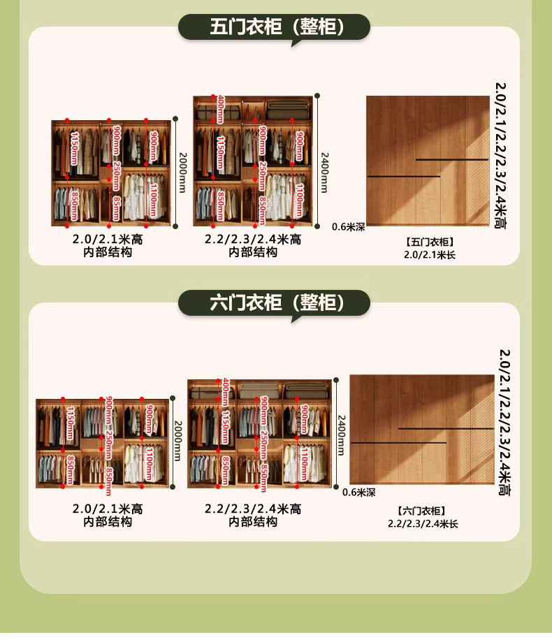 • [길이 2.4m*높이 2.1m] 6도어 옷장 [올 원목]