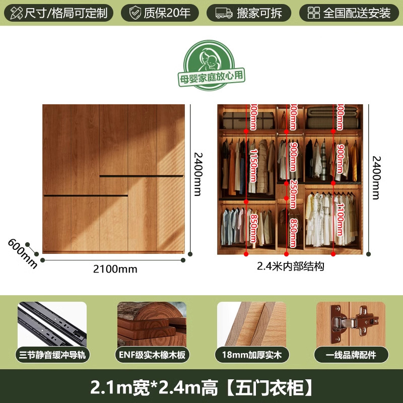 • [길이 2.0m*높이 2.4m] 5도어 옷장 [올 원목]
