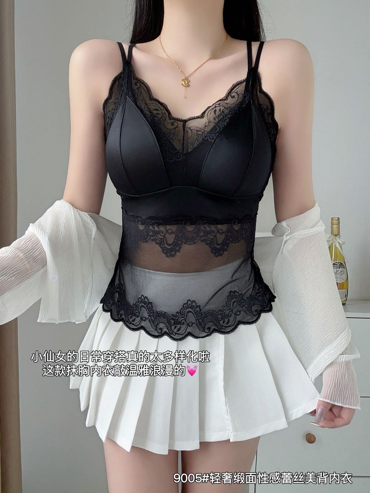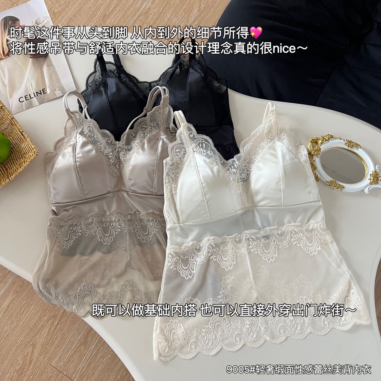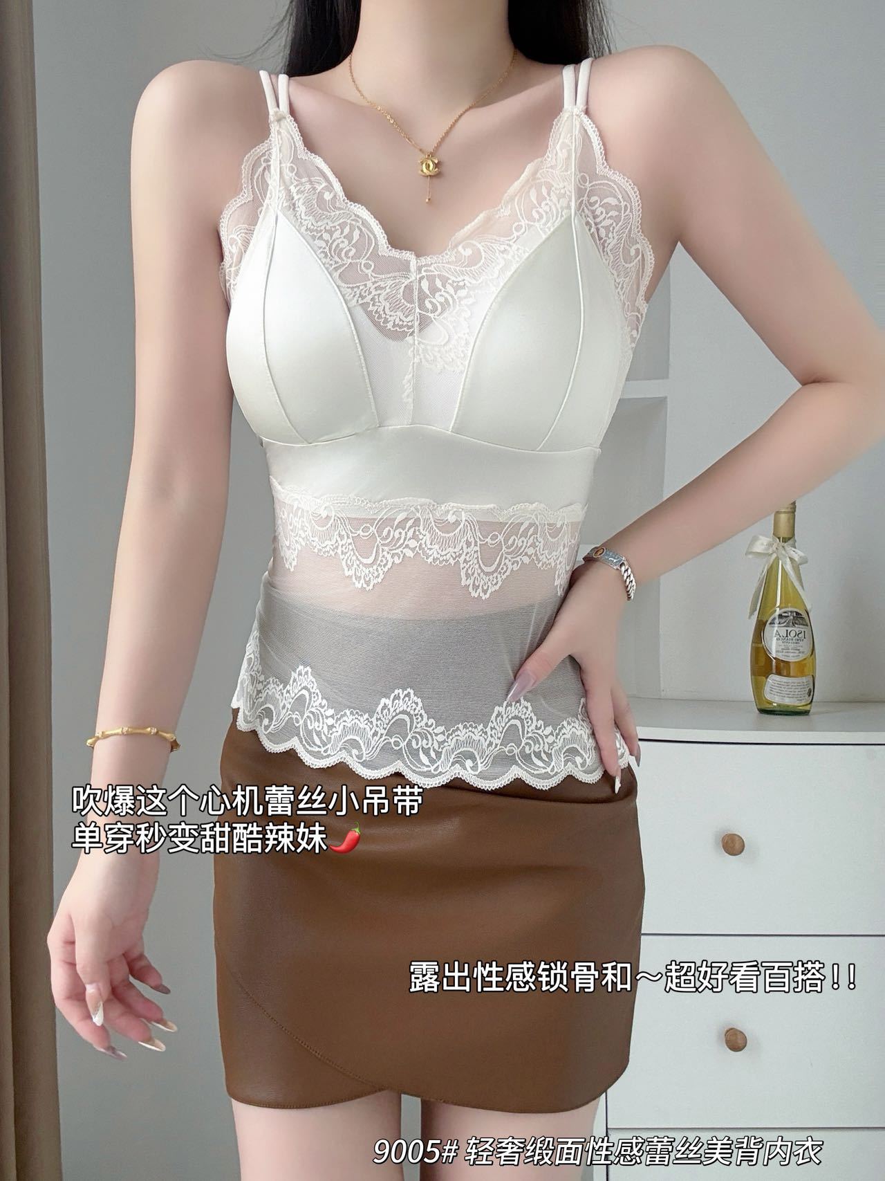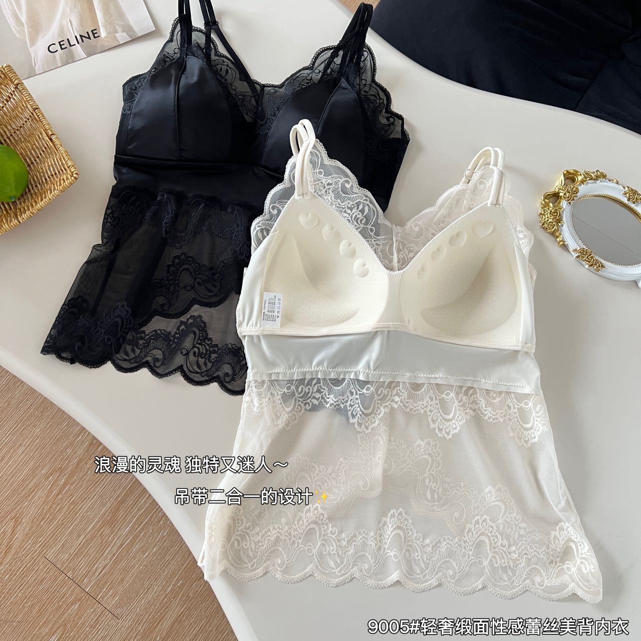 가슴 패드와 바닥 셔츠가 내장된 여름 여성용 가볍고 고급스러운 새틴 섹시한 레이스 아름다운 등 서스펜더