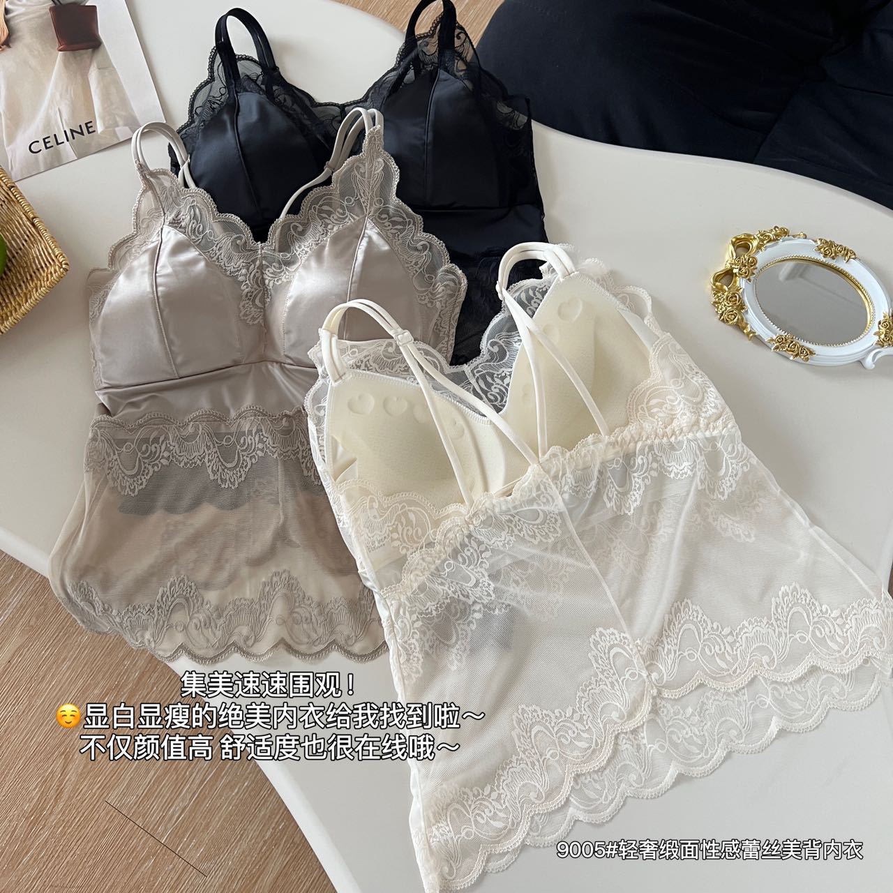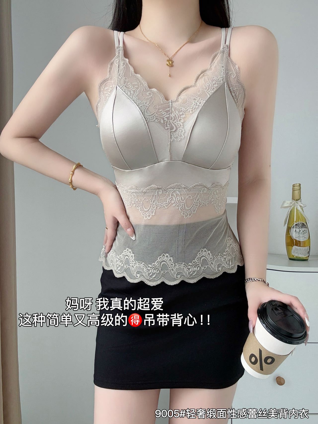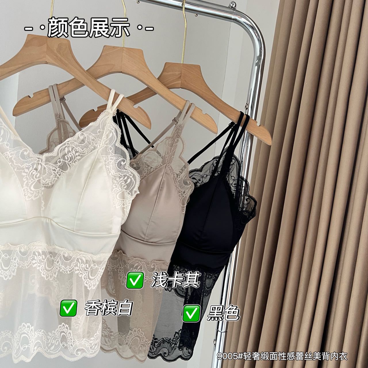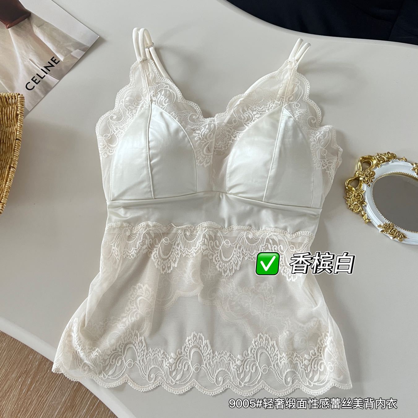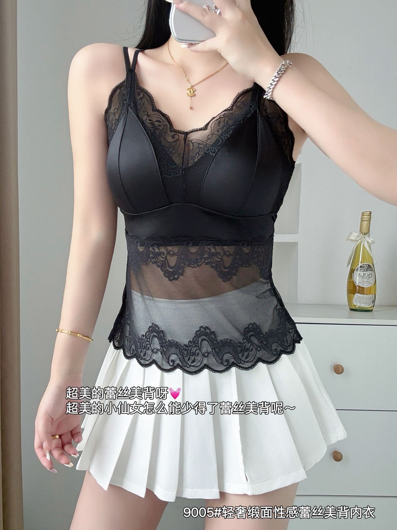 가슴 패드와 바닥 셔츠가 내장된 여름 여성용 가볍고 고급스러운 새틴 섹시한 레이스 아름다운 등 서스펜더