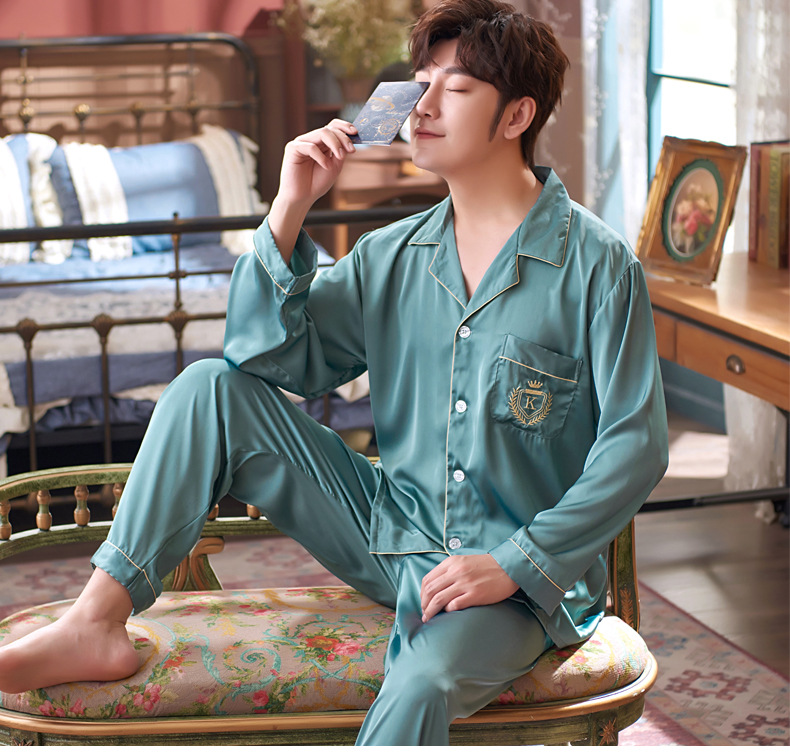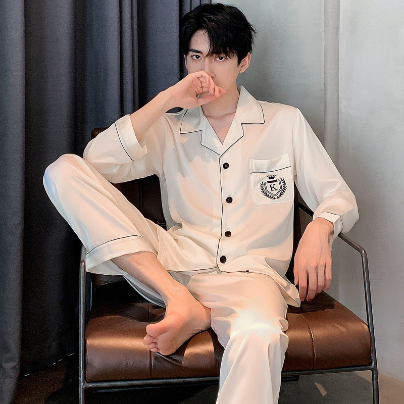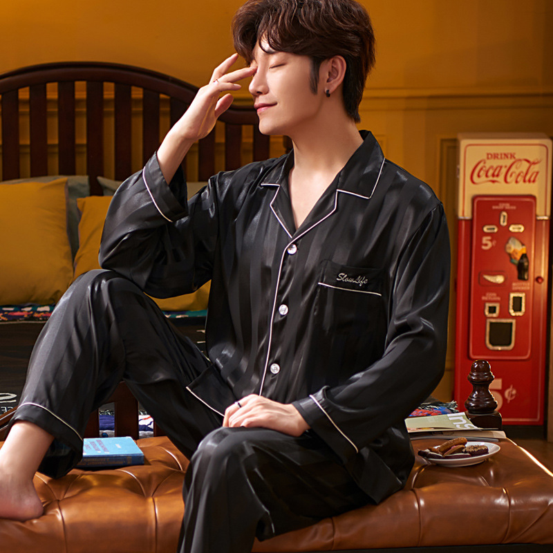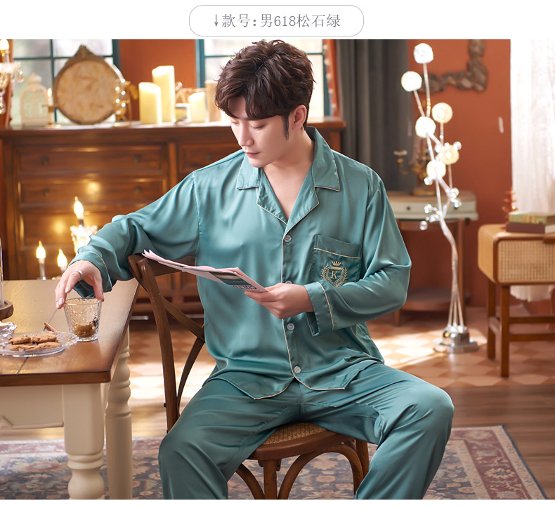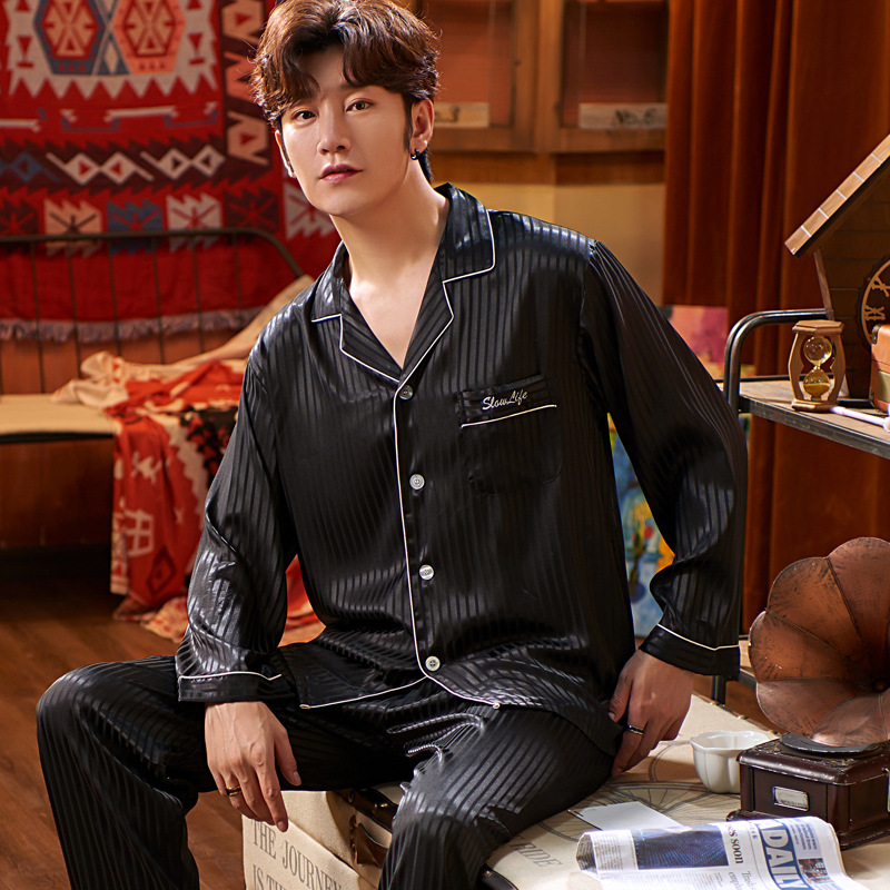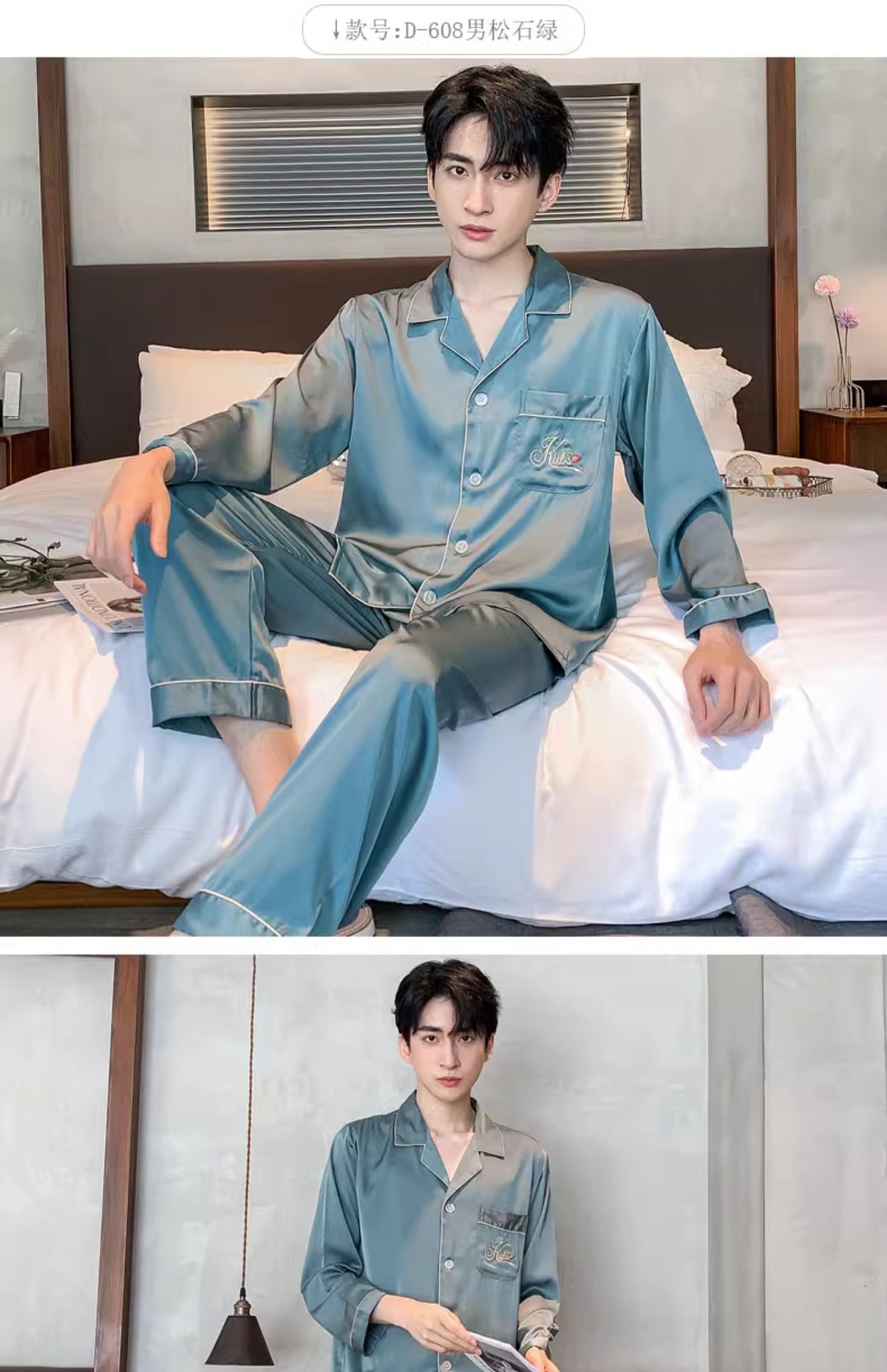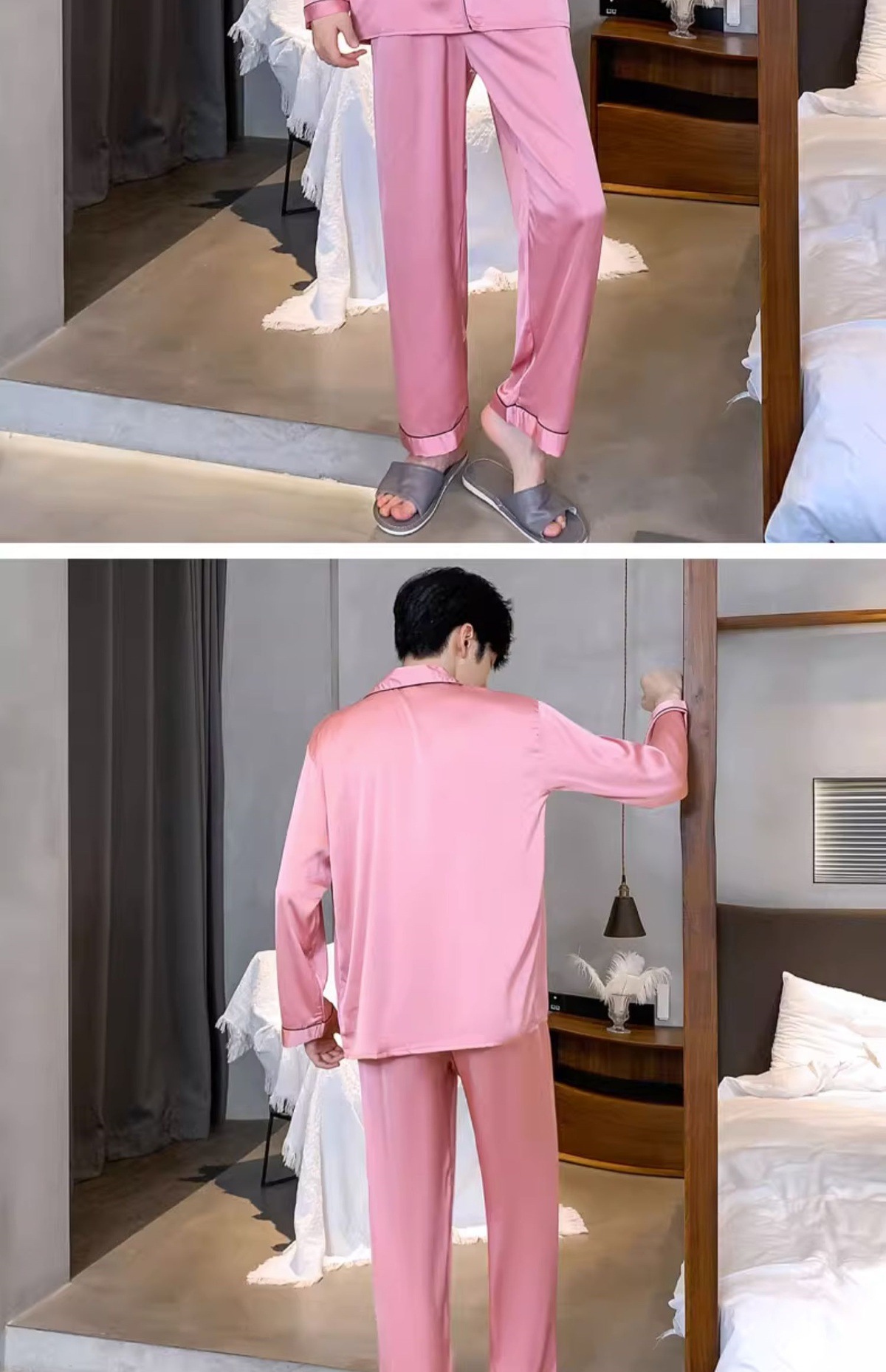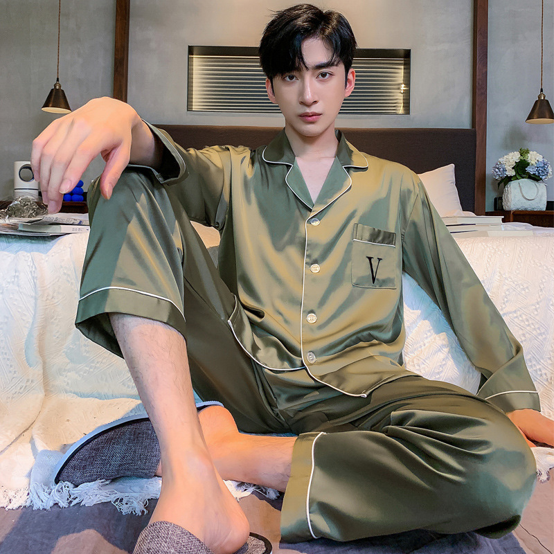 남성용 아이스 실크 잠옷 봄, 가을 긴팔 카디건 시뮬레이션 실크 얇은 2025 새로운 간단한 가정 의류 여름스토어 가기