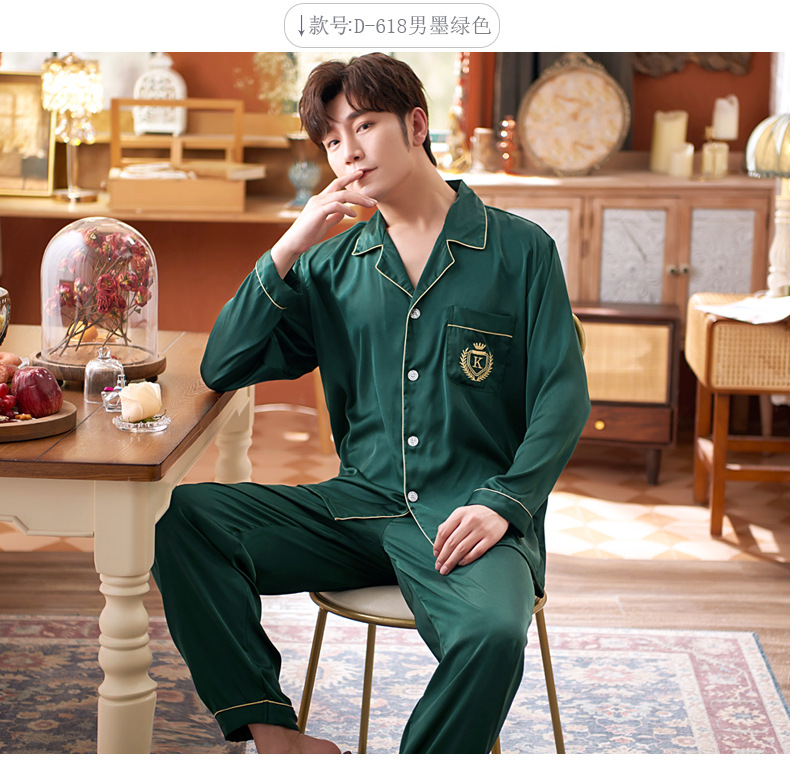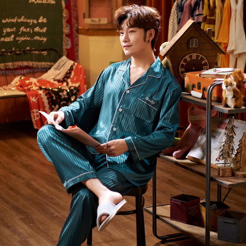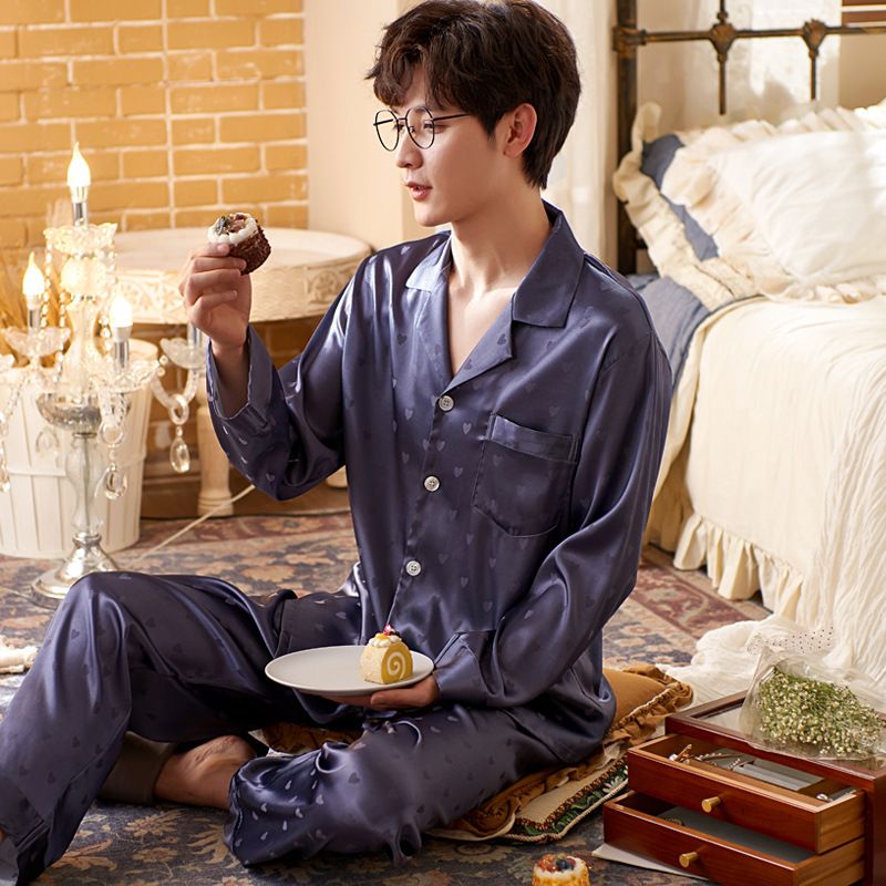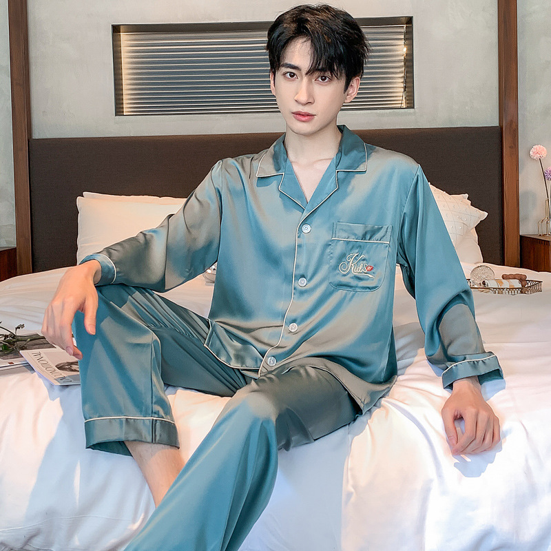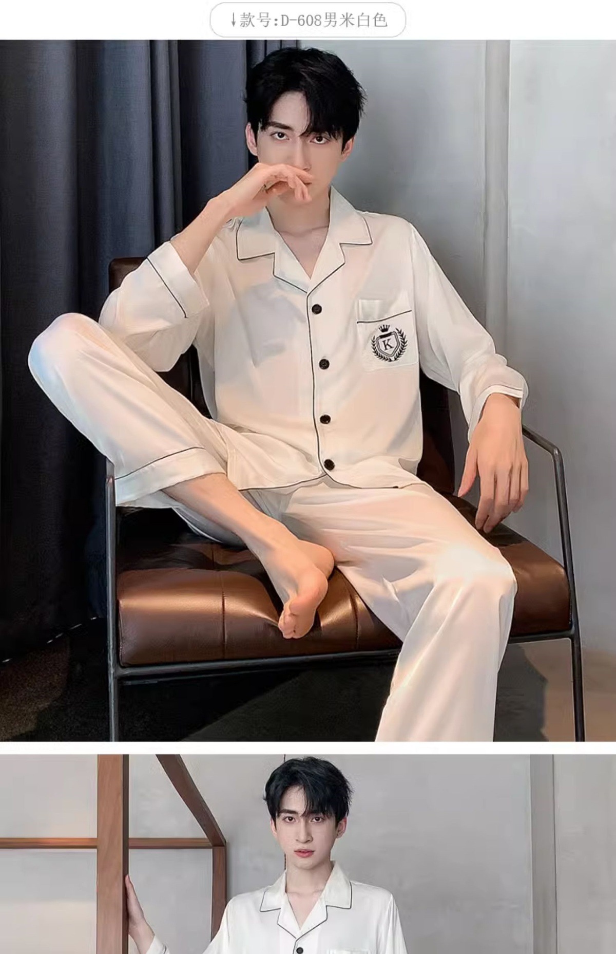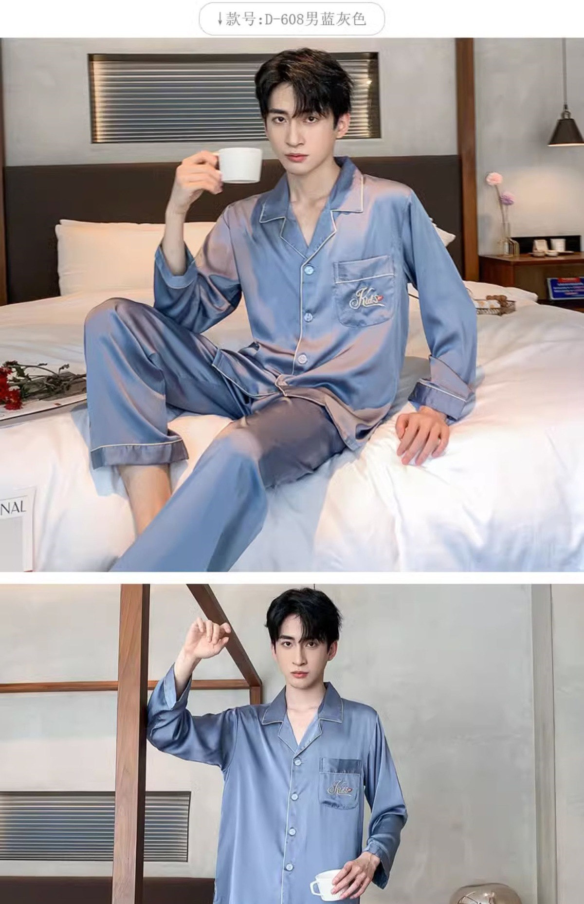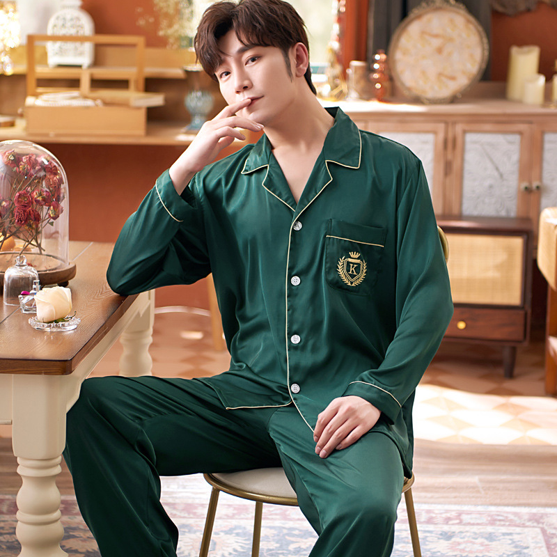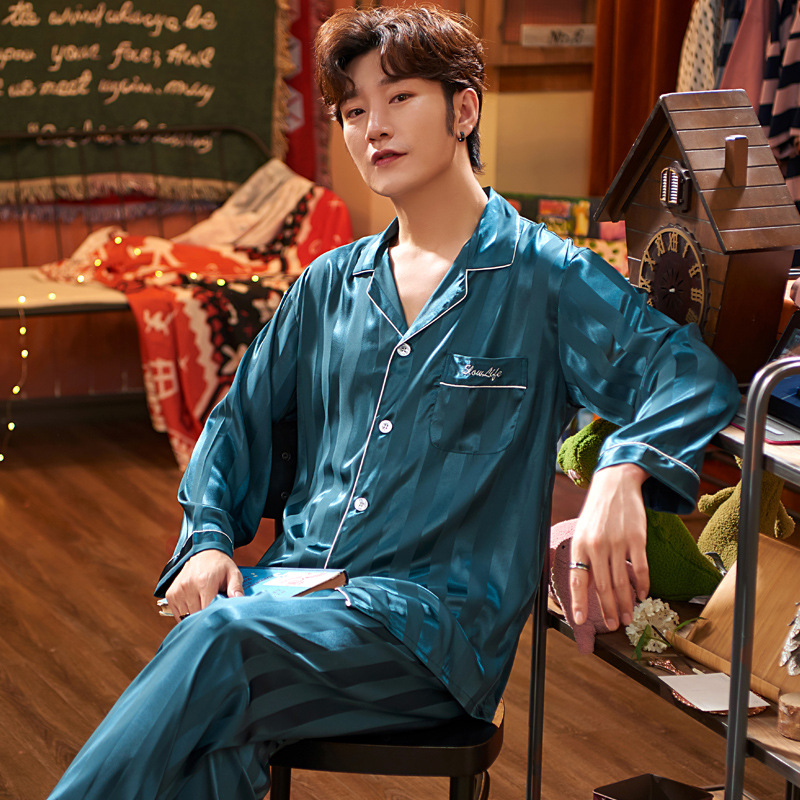 남성용 아이스 실크 잠옷 봄, 가을 긴팔 카디건 시뮬레이션 실크 얇은 2025 새로운 간단한 가정 의류 여름스토어 가기