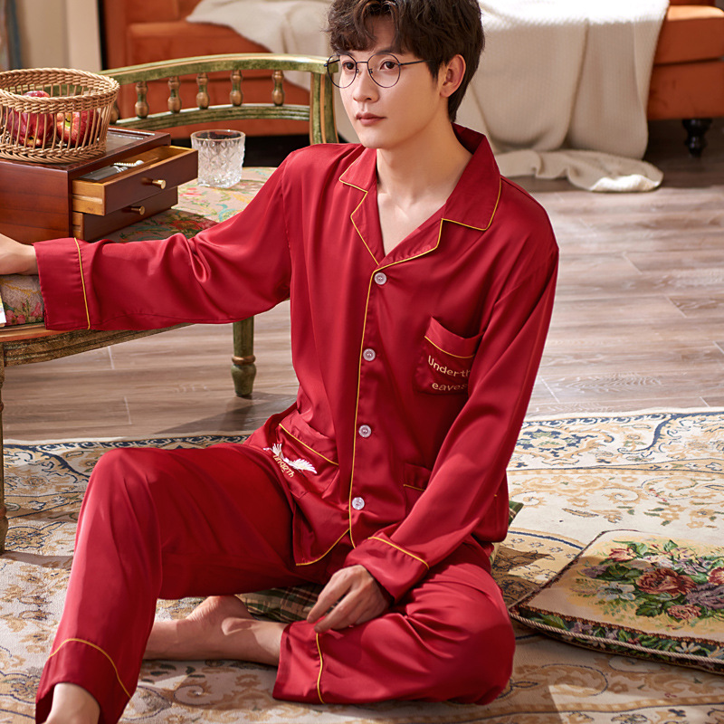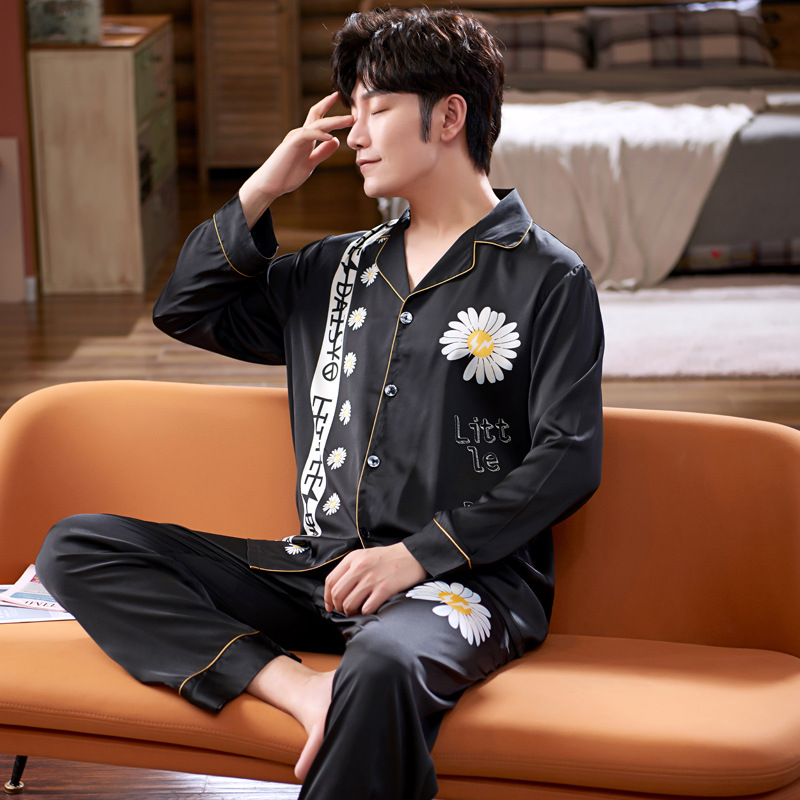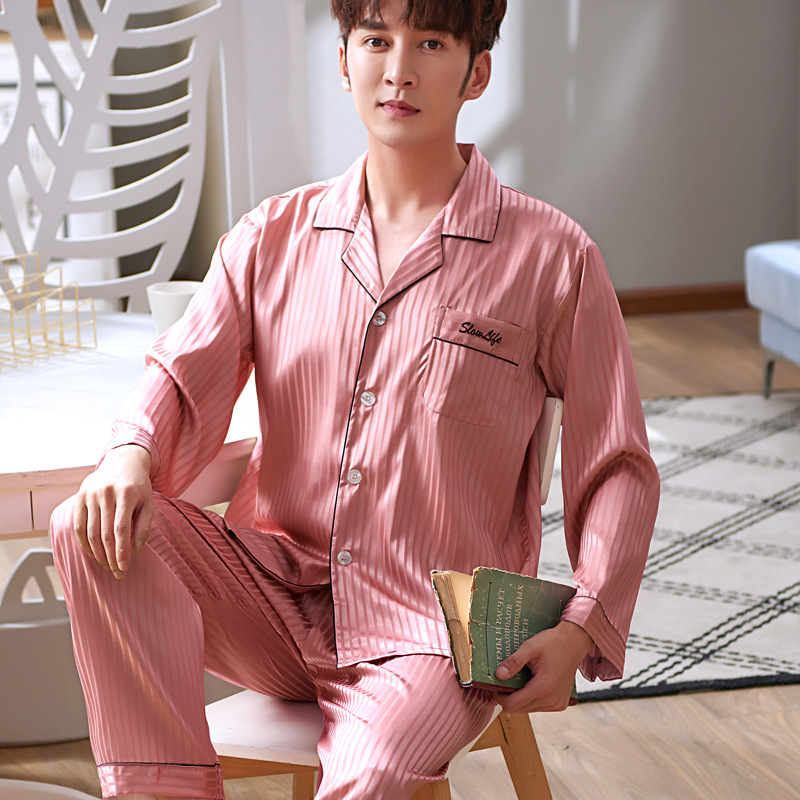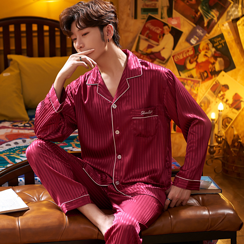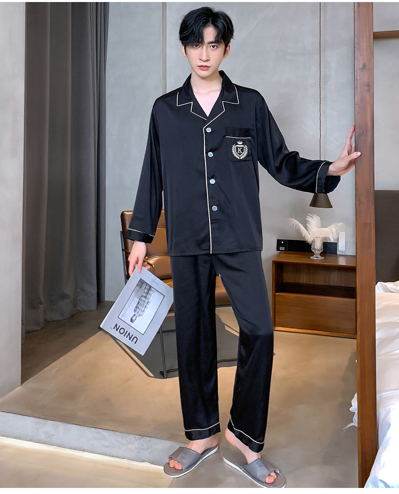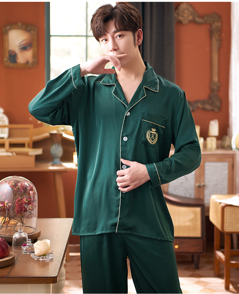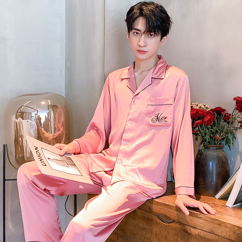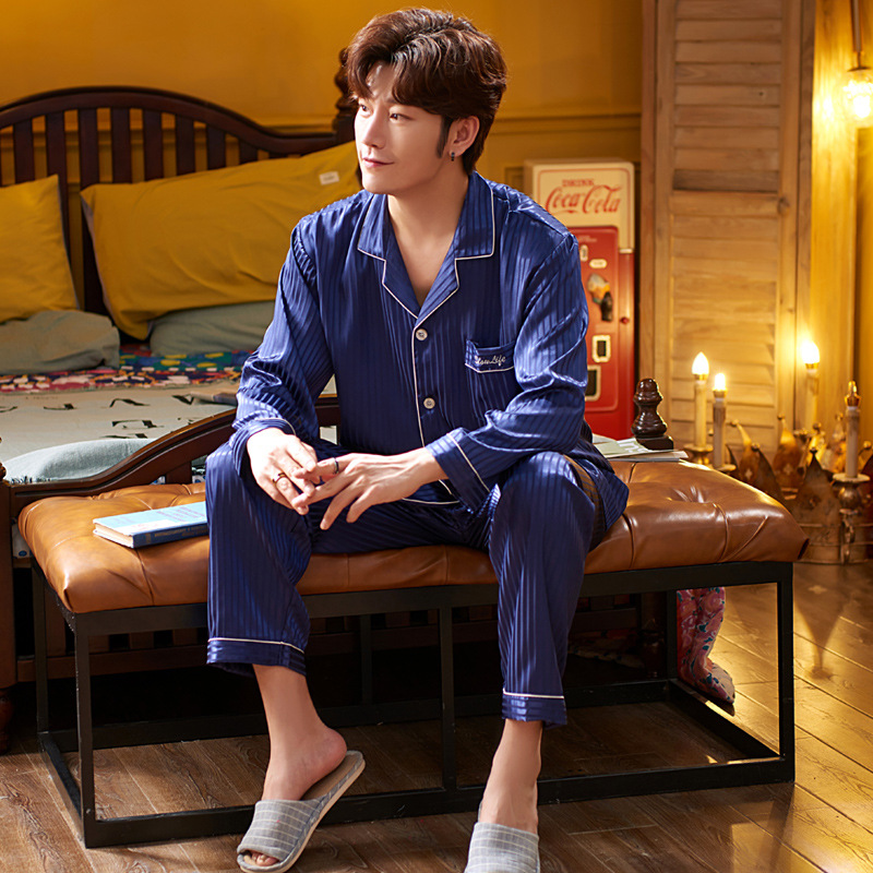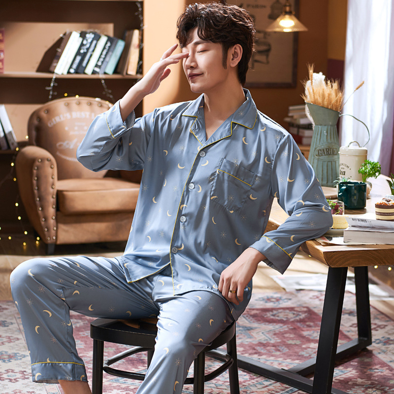 남성용 아이스 실크 잠옷 봄, 가을 긴팔 카디건 시뮬레이션 실크 얇은 2025 새로운 간단한 가정 의류 여름스토어 가기