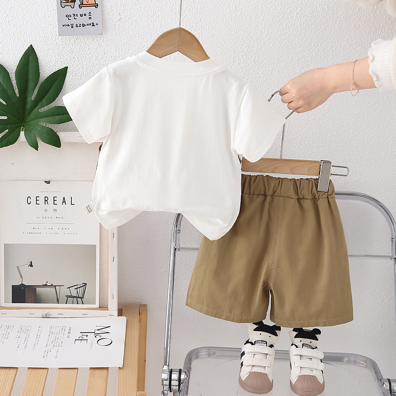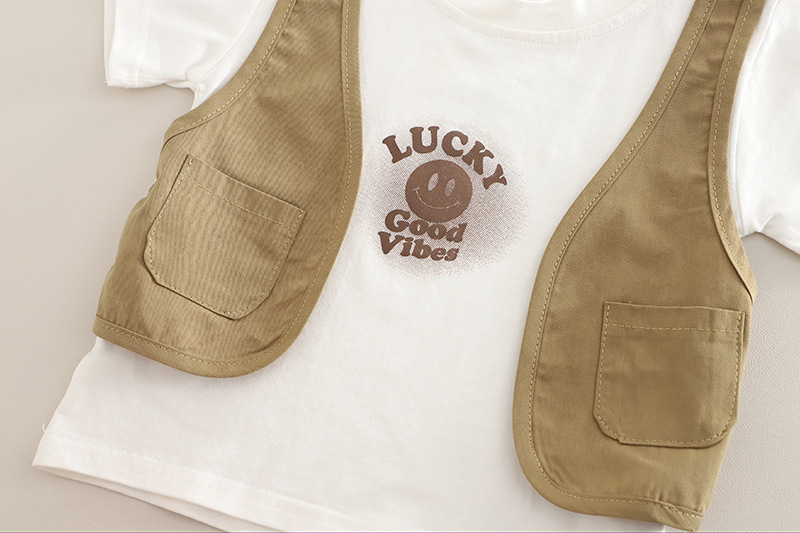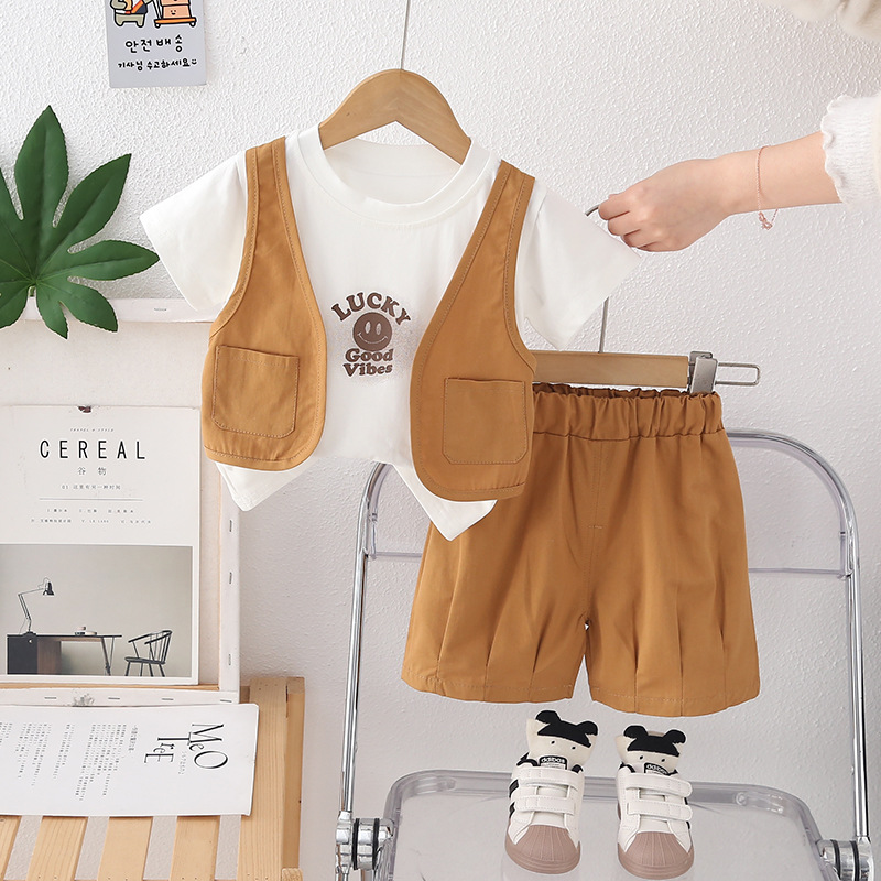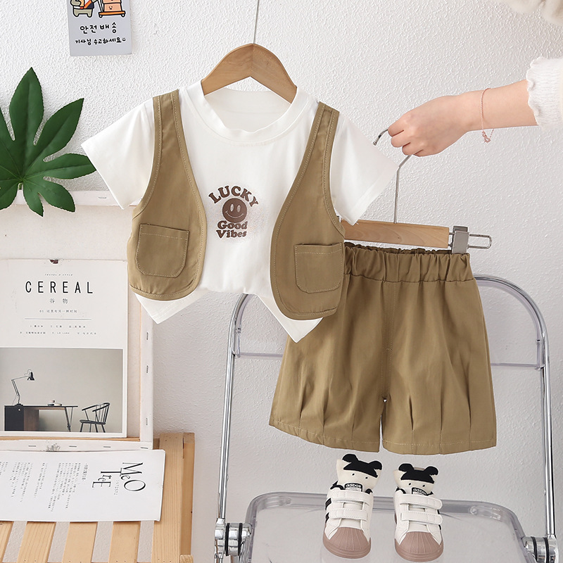 소년 여름 반팔 양복 여름 옷 2025 새로운 스타일 어린이 스타일 아기 가짜 조끼 여름 옷 투피스 세트