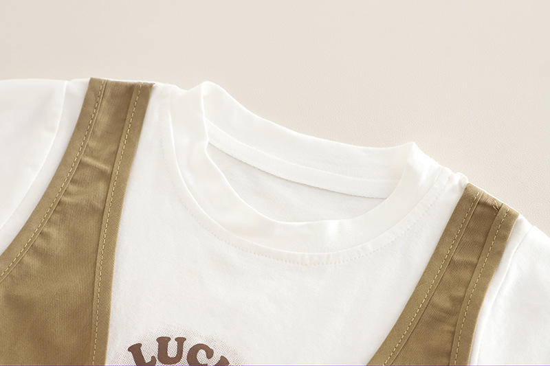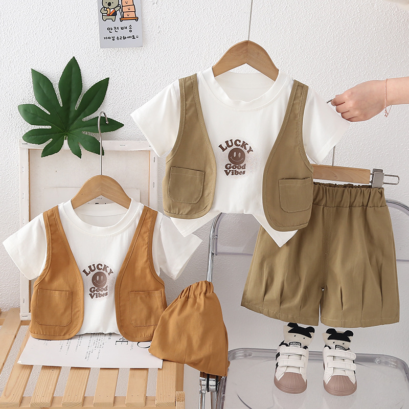 소년 여름 반팔 양복 여름 옷 2025 새로운 스타일 어린이 스타일 아기 가짜 조끼 여름 옷 투피스 세트스토어 가기