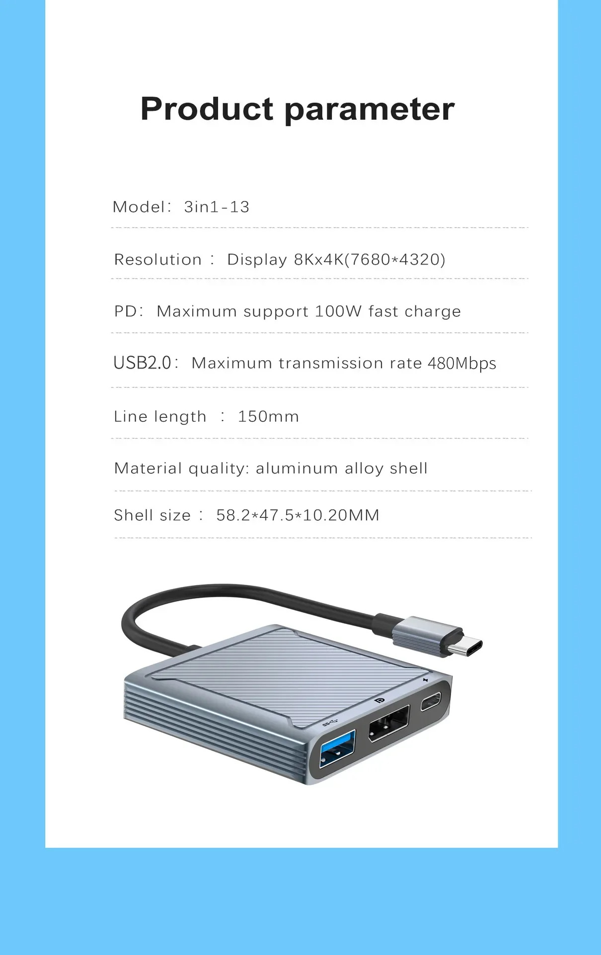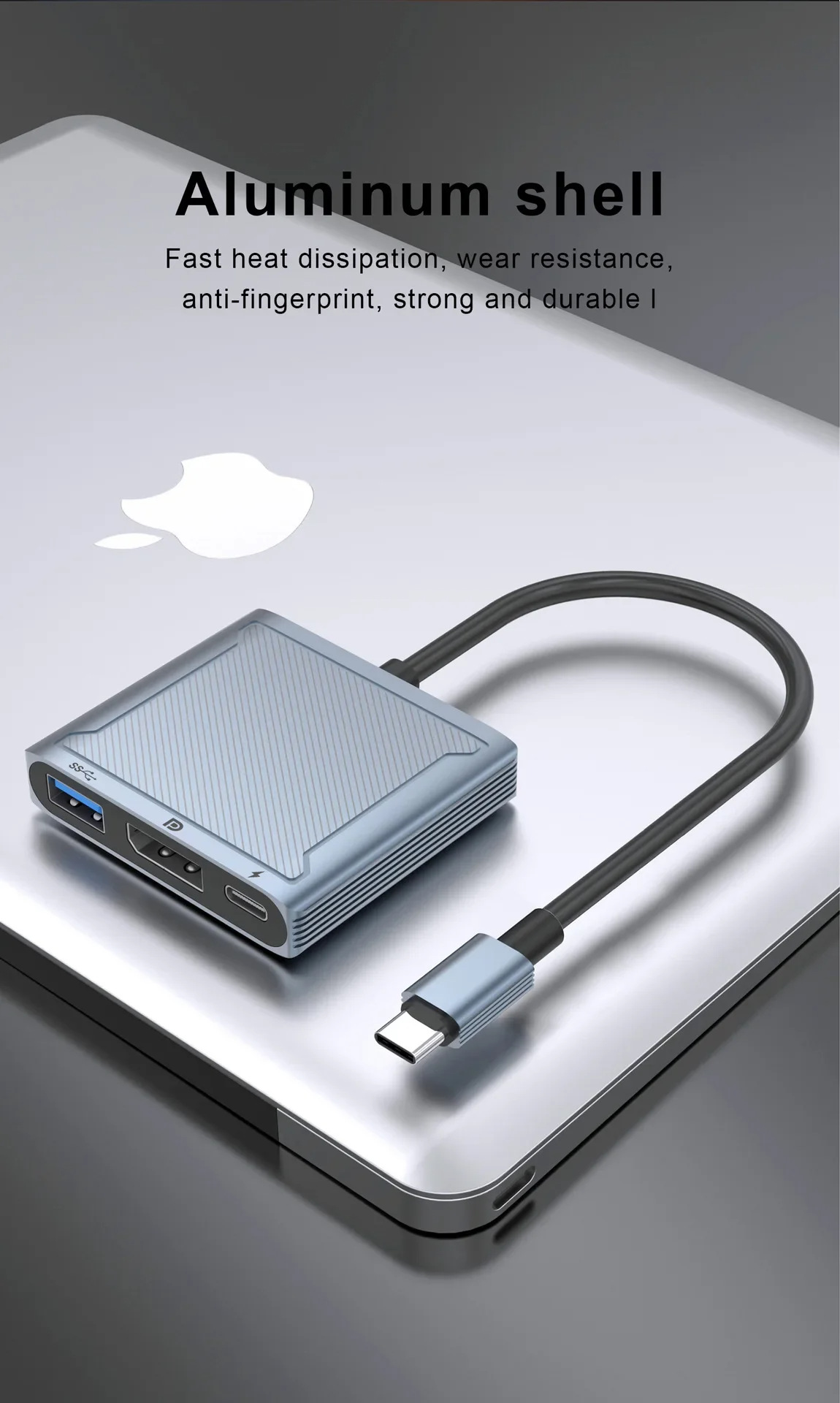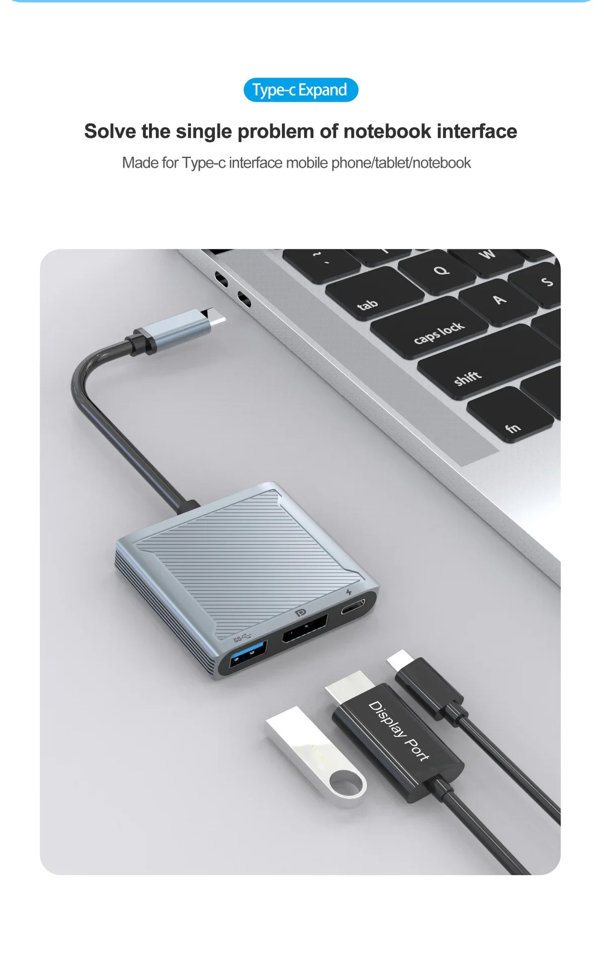 1. 三合一多端口 USB C 集线器:将 USB Type-C(兼容 Thunderbolt3/4)端口扩展为 USB 3.0 端口、8K DP 输出端口和 USB-C 充电端口。三个端口可以同时工作。