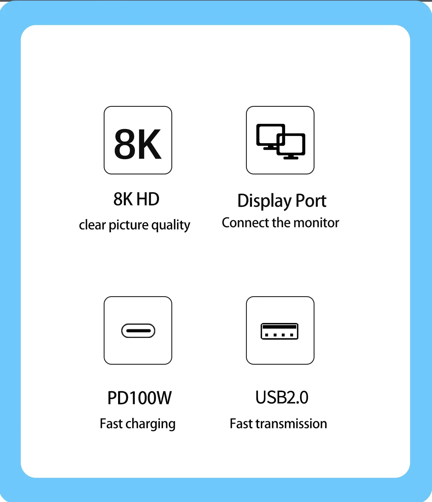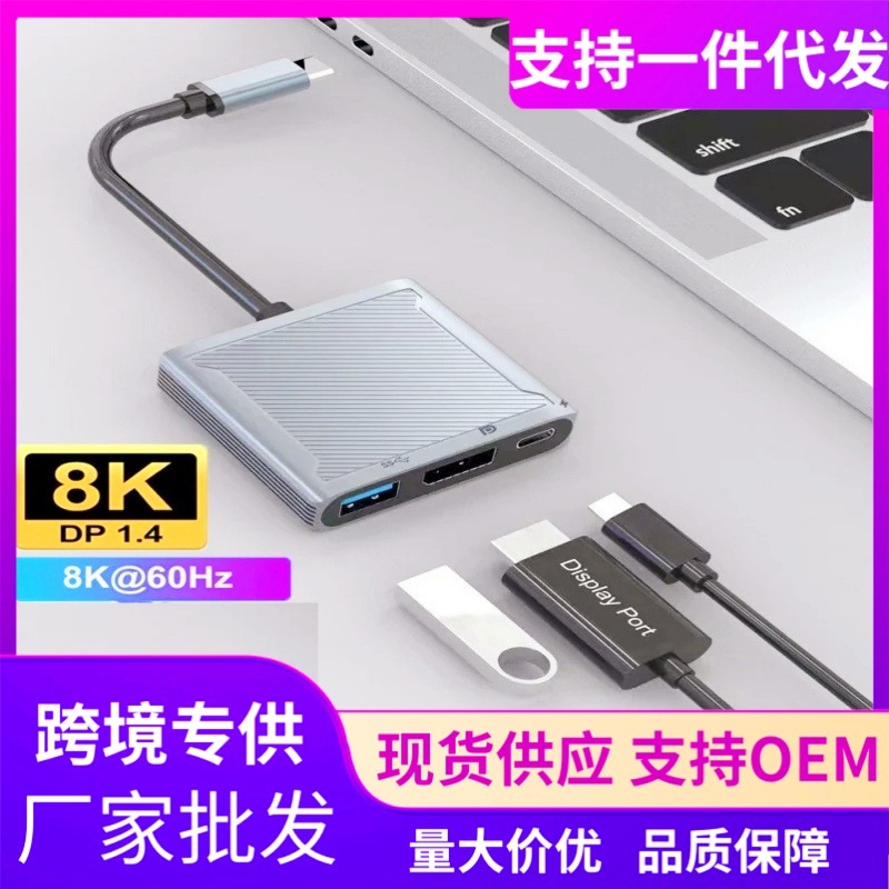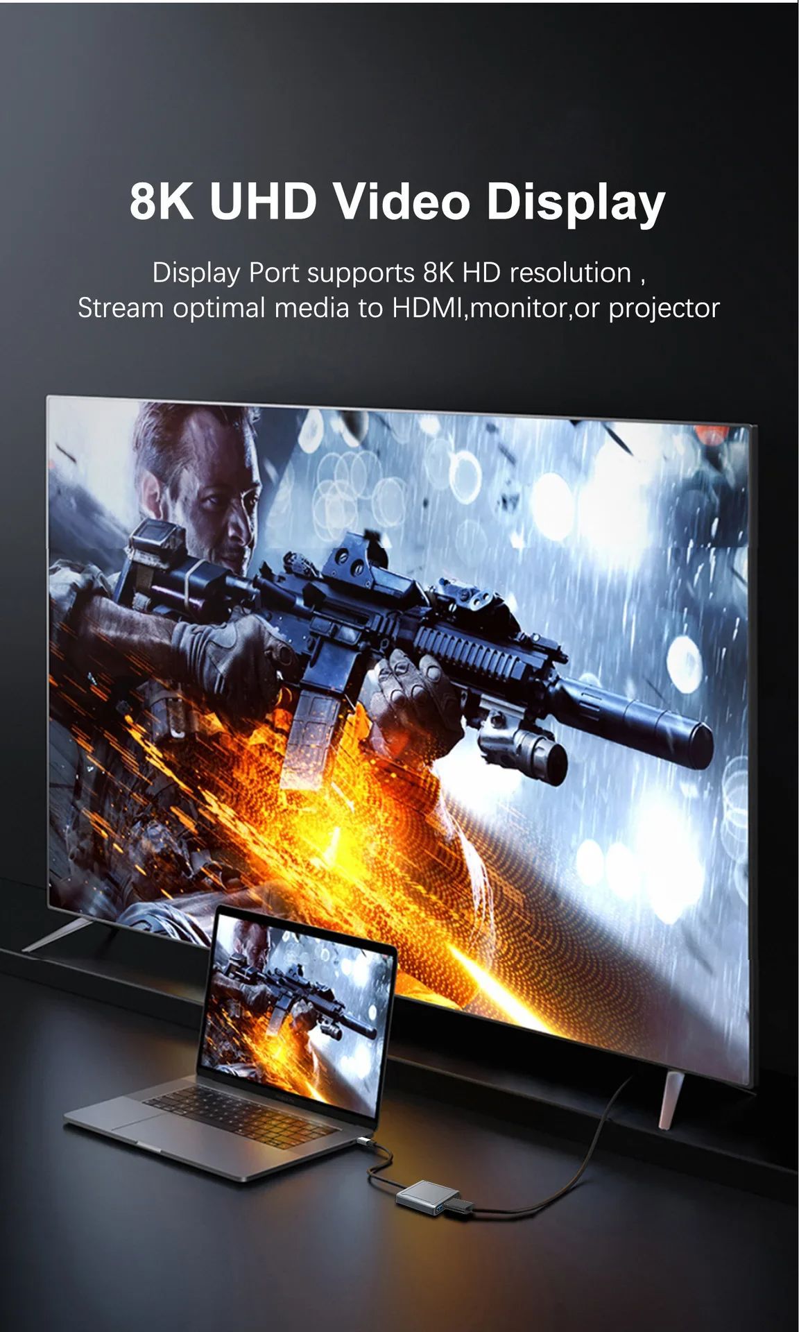 3. 8K 视频 USB-C 转 DP 适配器:使用 USB C 集线器的 DP 端口镜像或扩展屏幕,并以 8k 30 Hz 或全高清 4k60 将 4K 超高清视频直接传输到高清电视、显示机或投影仪。