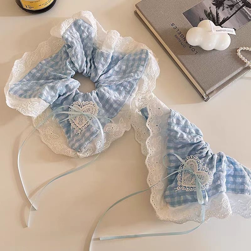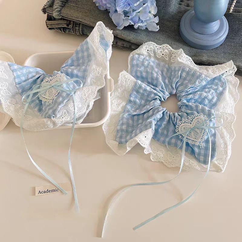 바다 소금 거품 ~ 푸른 격자 무늬 활 레이스 스퀘어 스카프 큰 장내 머리 반지 여성 한국식 대형 헤드 라인 헤어 액세서리 여름스토어 가기