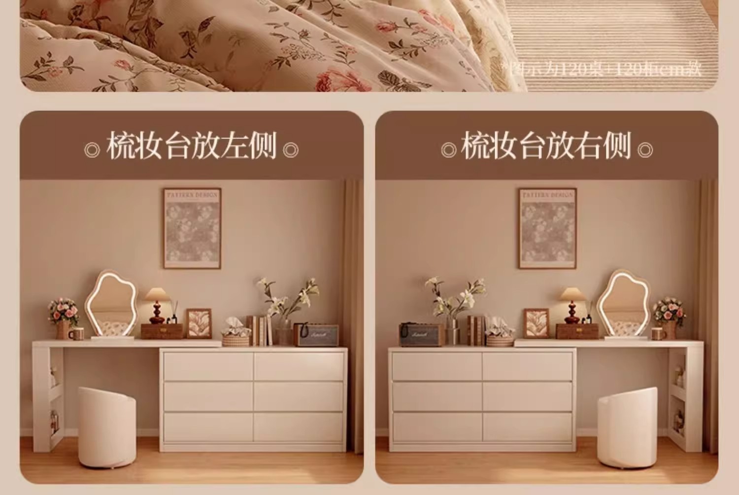 • [수납공간 + 구름거울 + 가죽스툴 조합] 1.2m 테이블 + 0.8m 3단 서랍장