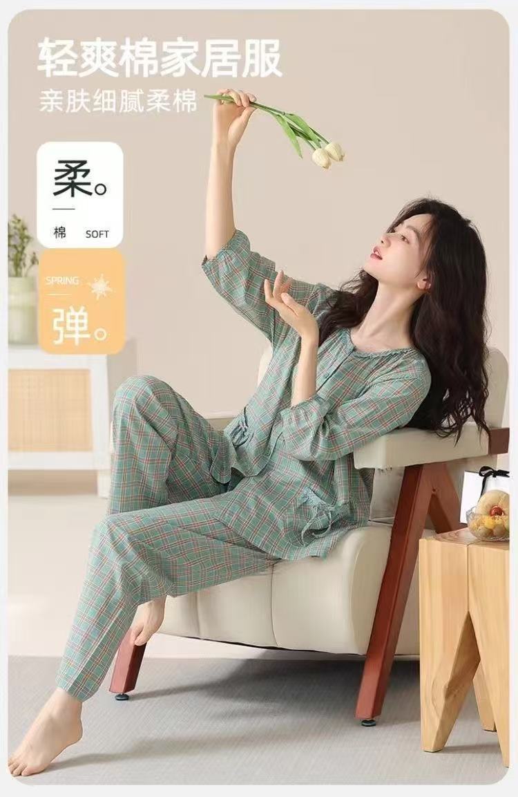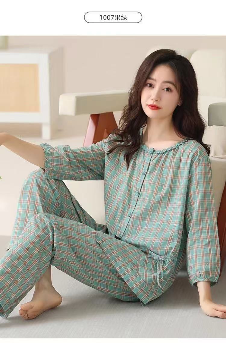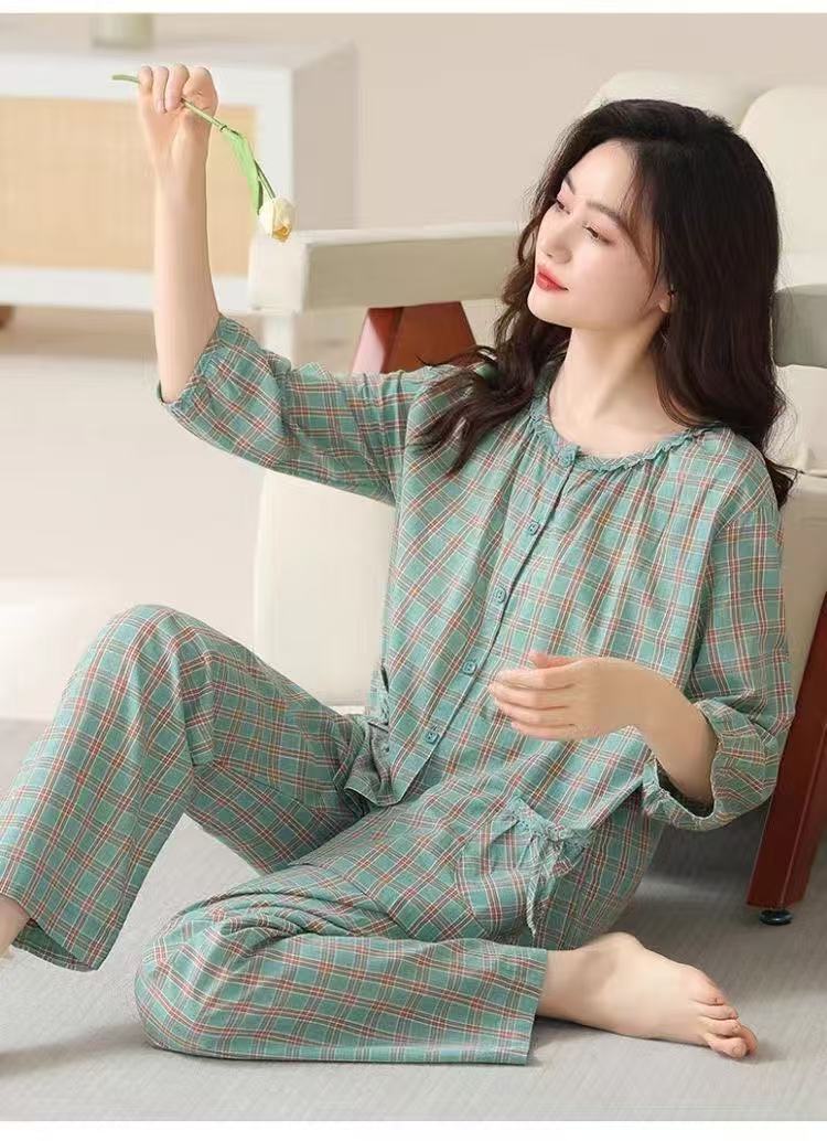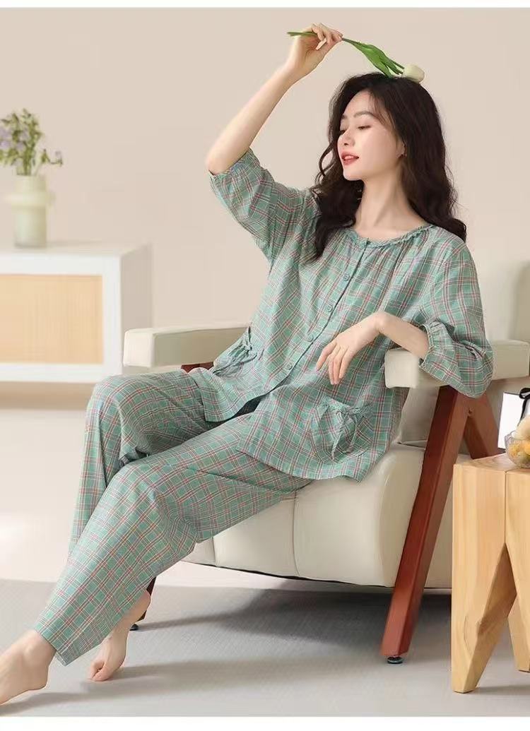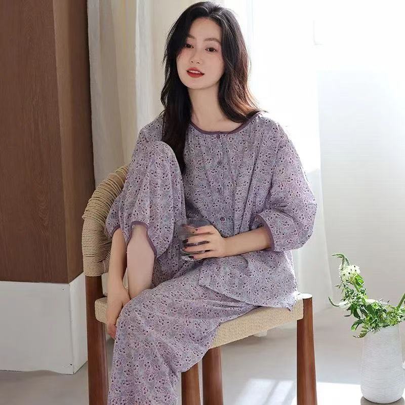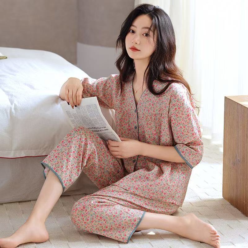 여성용 여름 파자마 세트, 거즈 면 소재, 7부 소매, 9부 바지, 얇은 여름용, 외출복으로도 착용 가능