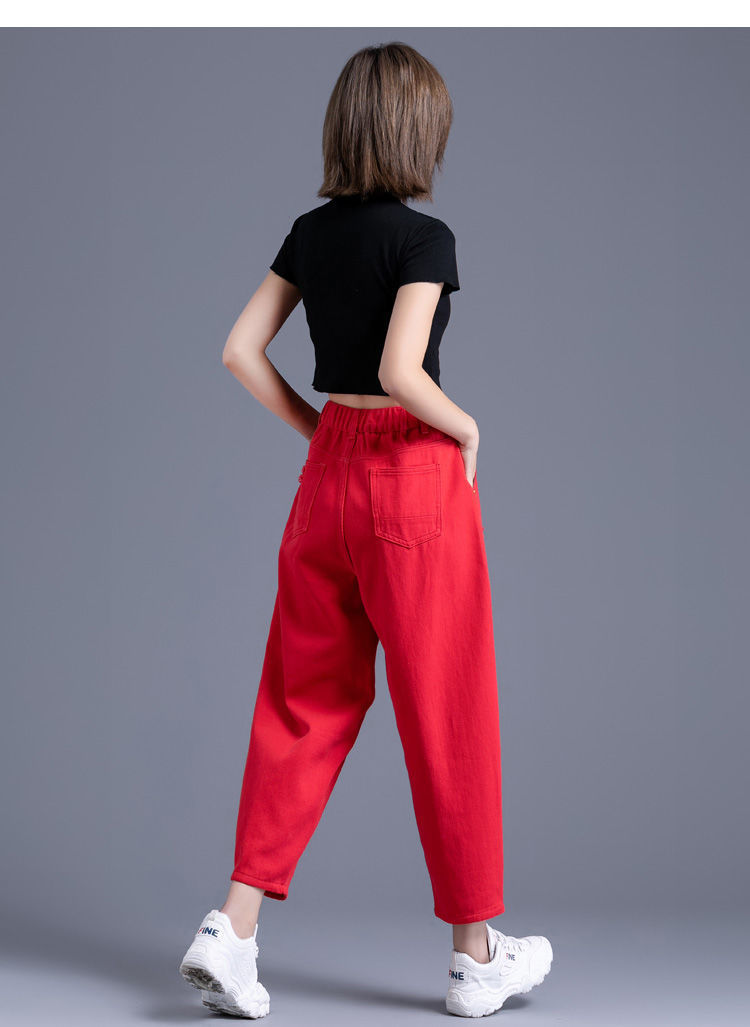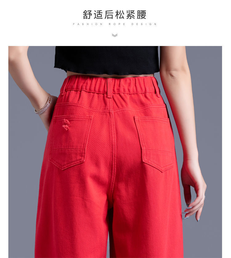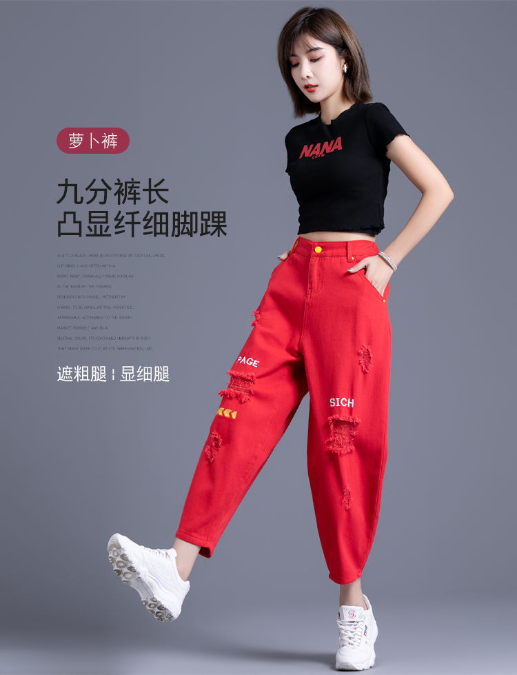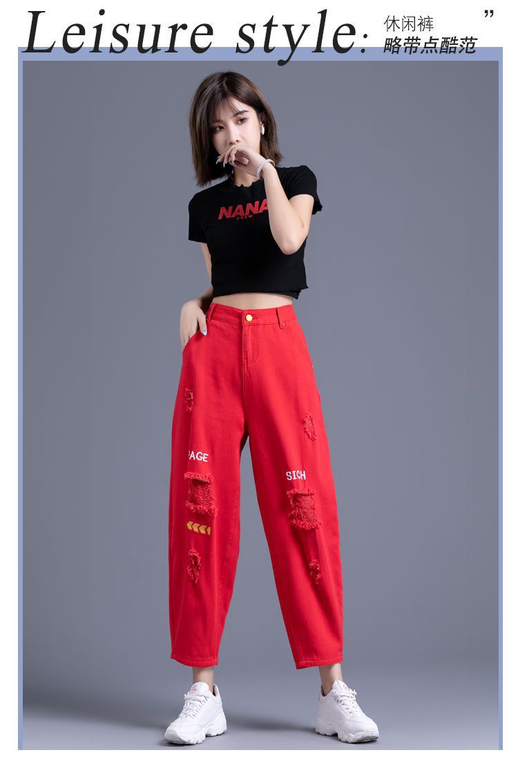 여성용 자수 찢어진 청바지 새로운 스타일 스트레이트 루즈 봄, 가을 하이 웨이스트 빅 레드 팬츠 아빠 바지 9부 바지스토어 가기