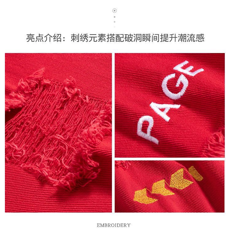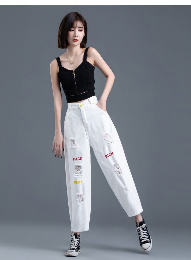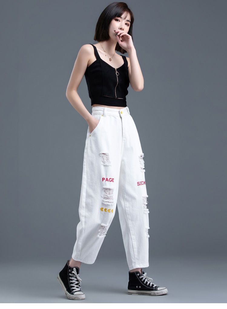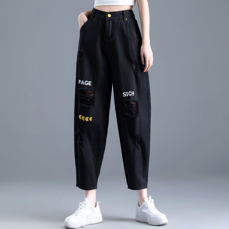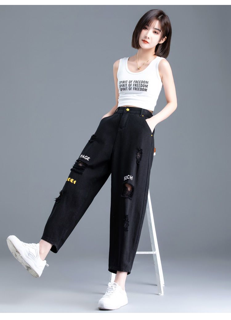 여성용 자수 찢어진 청바지 새로운 스타일 스트레이트 루즈 봄, 가을 하이 웨이스트 빅 레드 팬츠 아빠 바지 9부 바지스토어 가기
