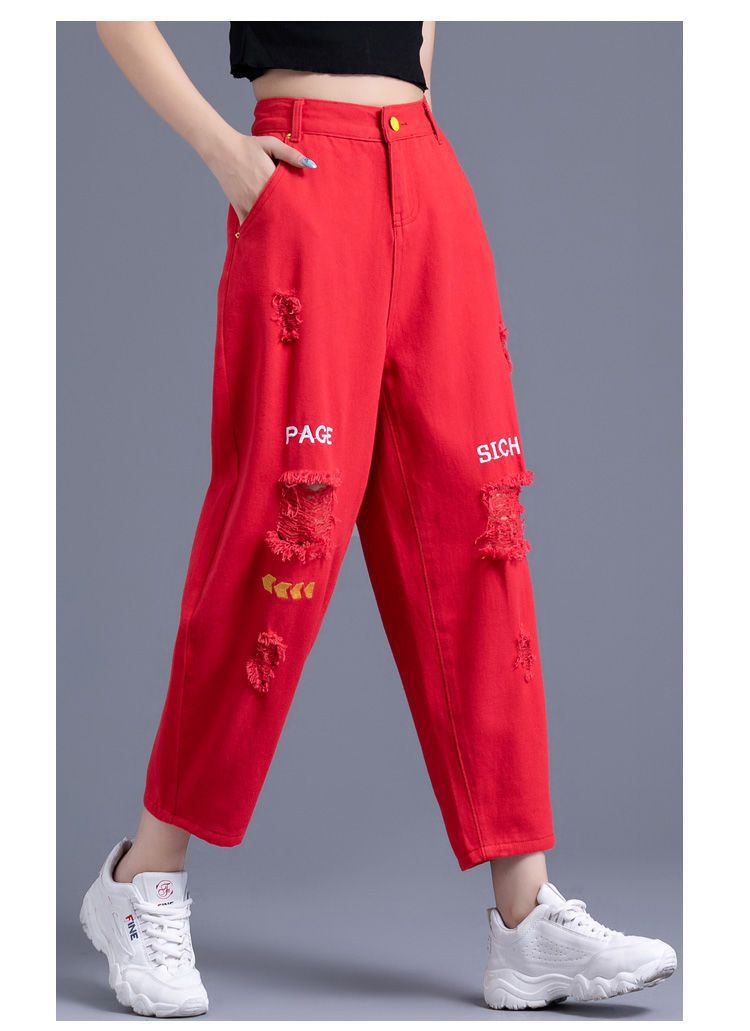 여성용 자수 찢어진 청바지 새로운 스타일 스트레이트 루즈 봄, 가을 하이 웨이스트 빅 레드 팬츠 아빠 바지 9부 바지