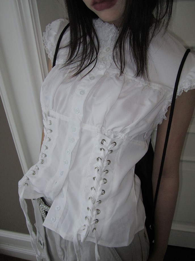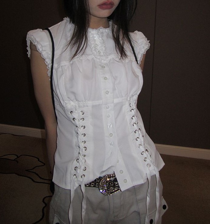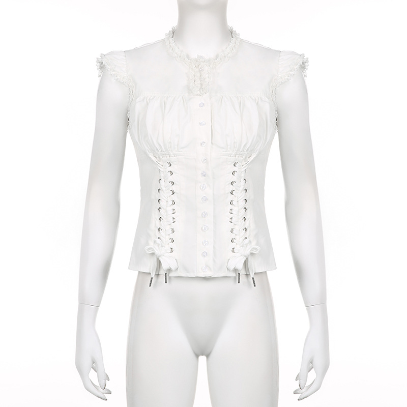 Y2k 유럽과 미국의 복고풍 레이스 허리 스트랩 작은 플라잉 슬리브 브레스트 셔츠 여성 달콤한 기질 틈새 디자인 조끼