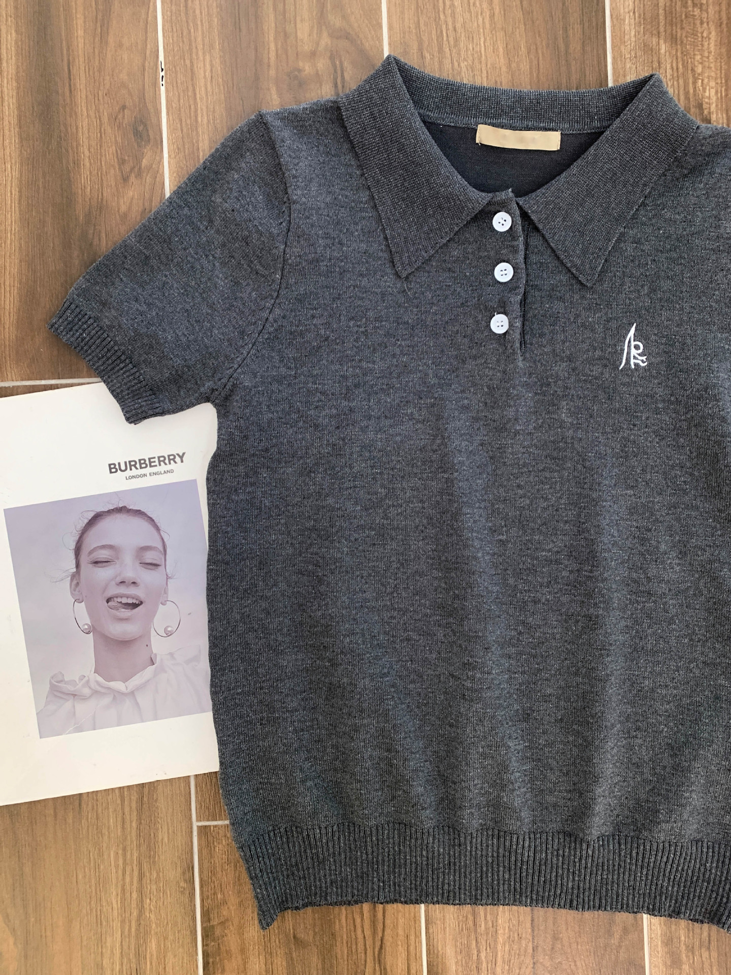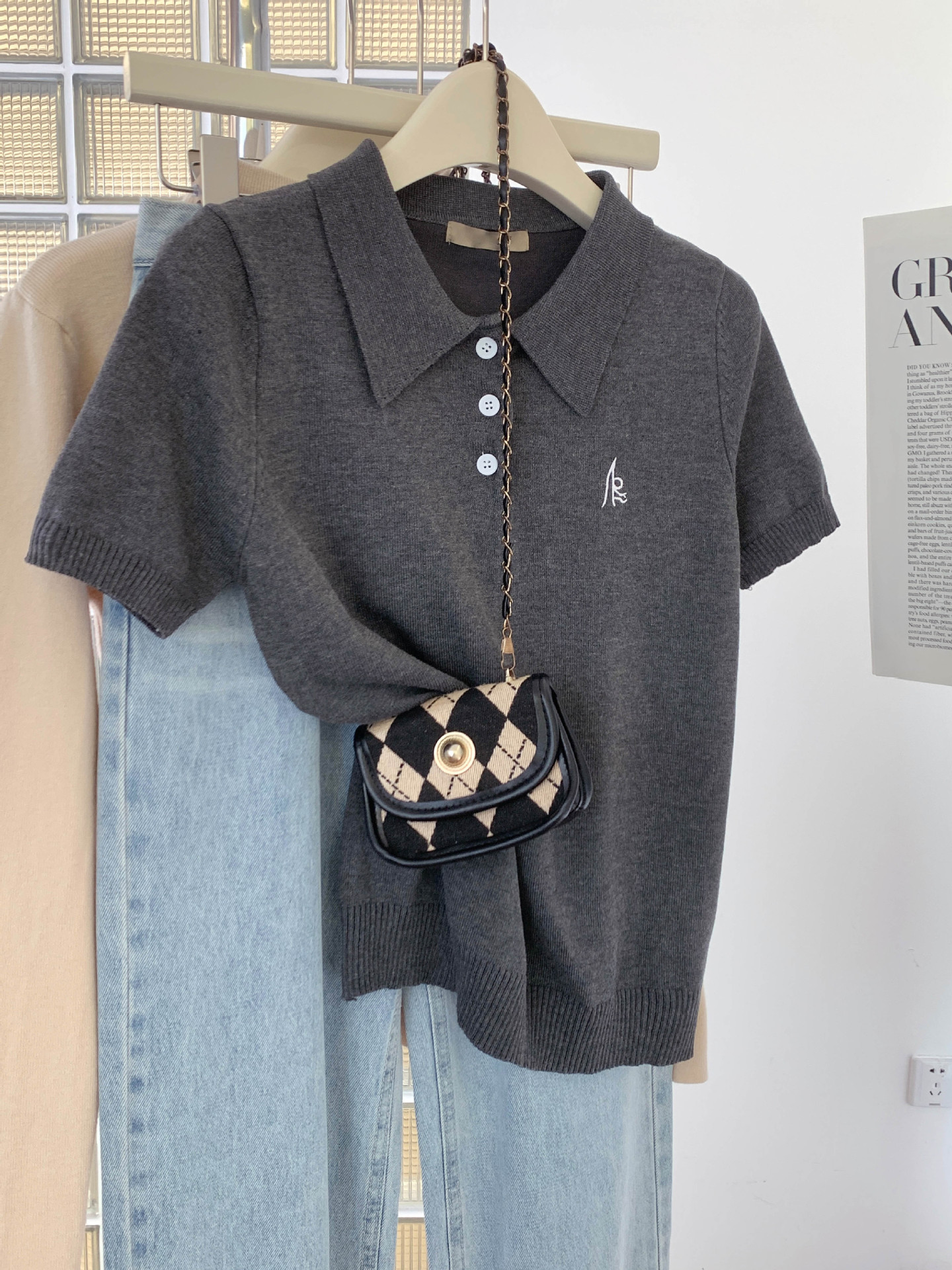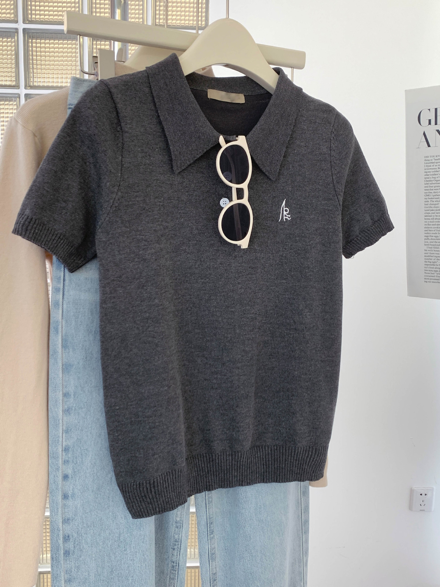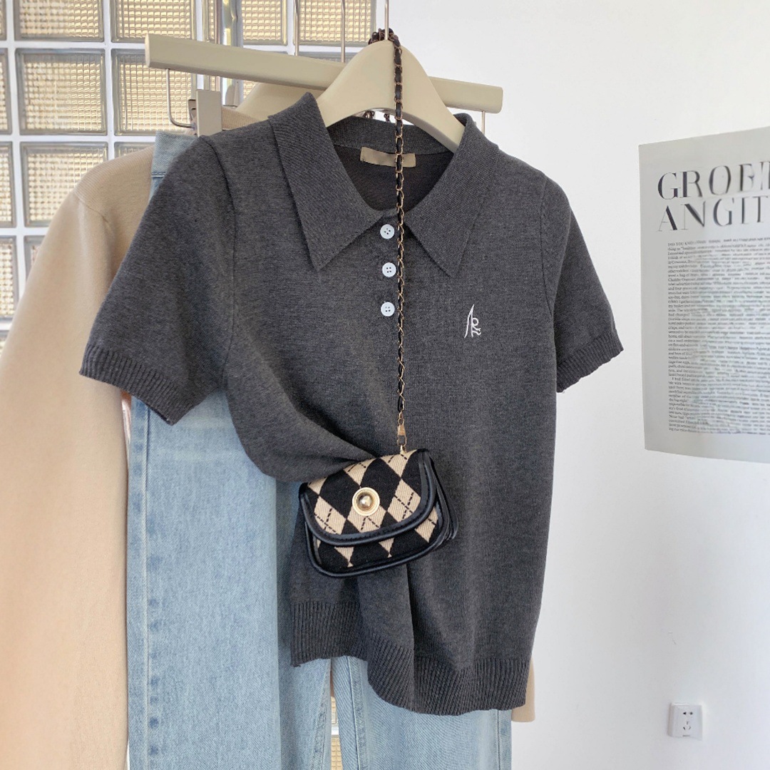 회색 폴로 셔츠 엘 수 놓은 얇은 아이스 실크 니트 어깨 반팔 티셔츠 여성용 2025 년 여름 탑 작은 셔츠스토어 가기