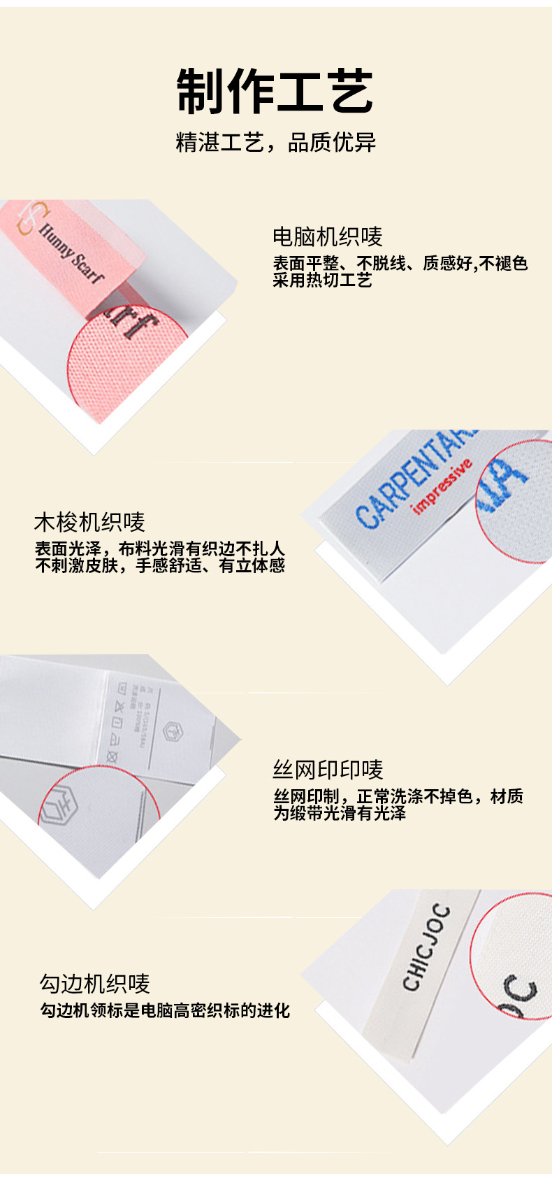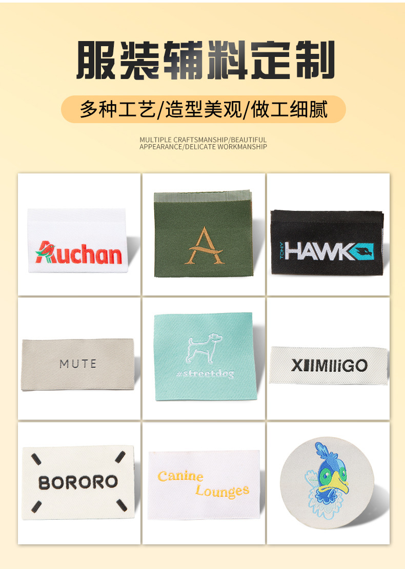 의류, 신발 및 모자용 직조 라벨, 직조 라벨, 워시 라벨, 홈 텍스타일 액세서리, 가방, 남성 및 여성 자수 아동복 천 라벨, 로고 인쇄 가능