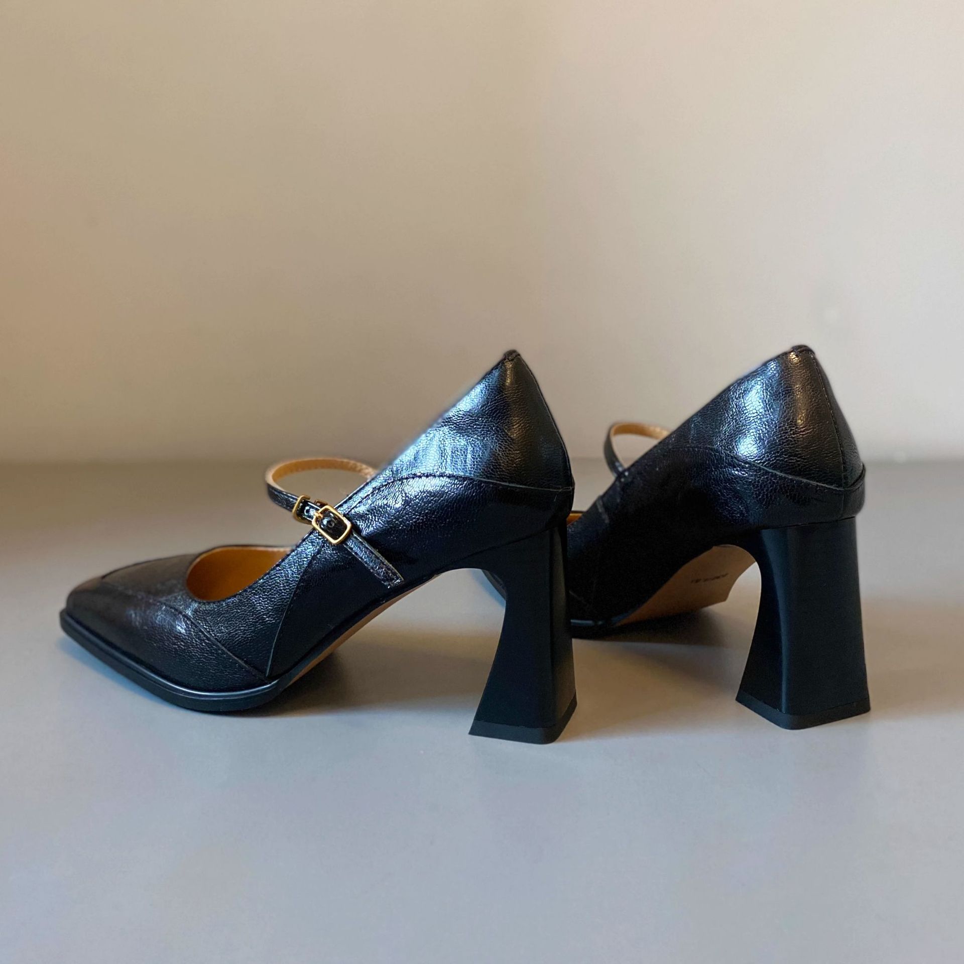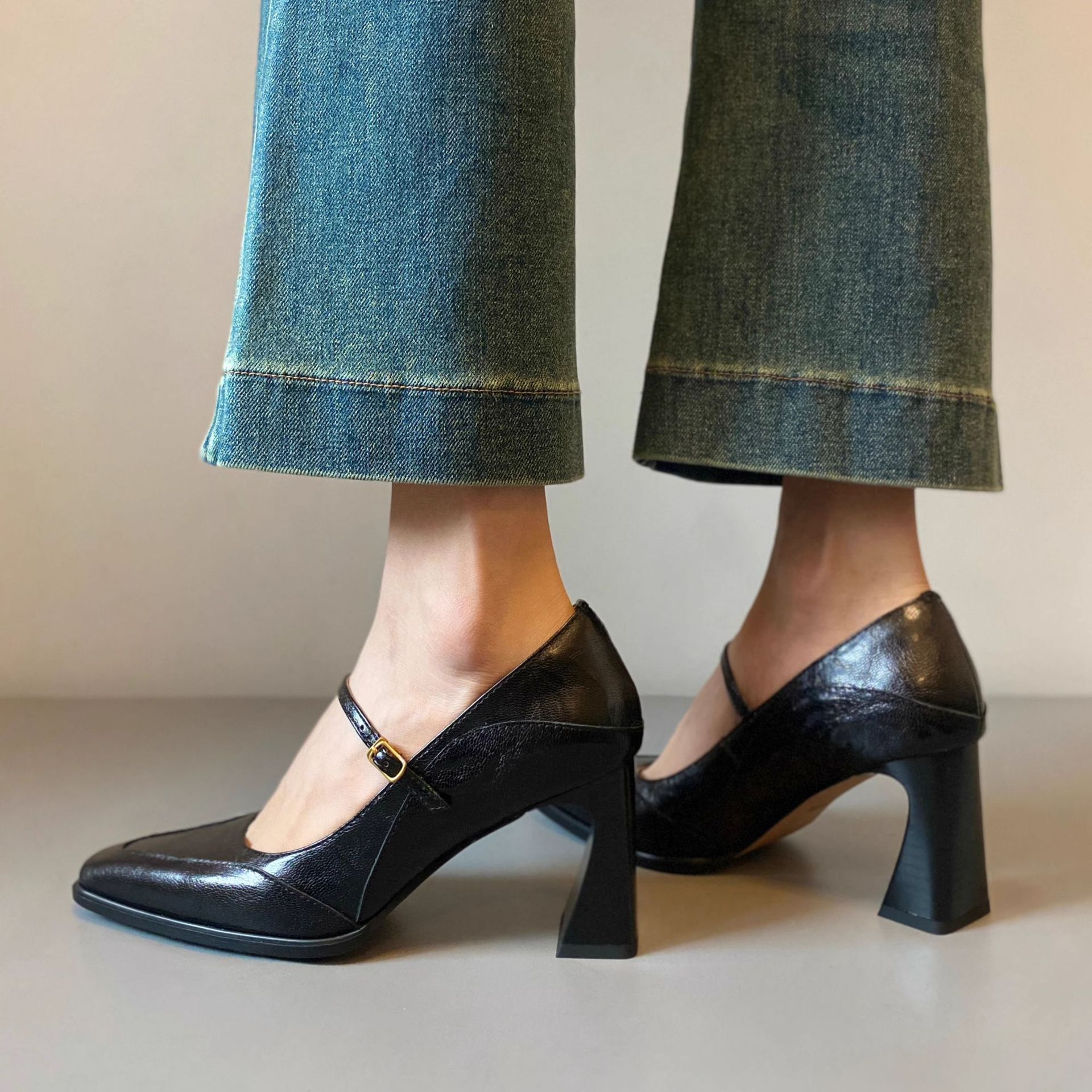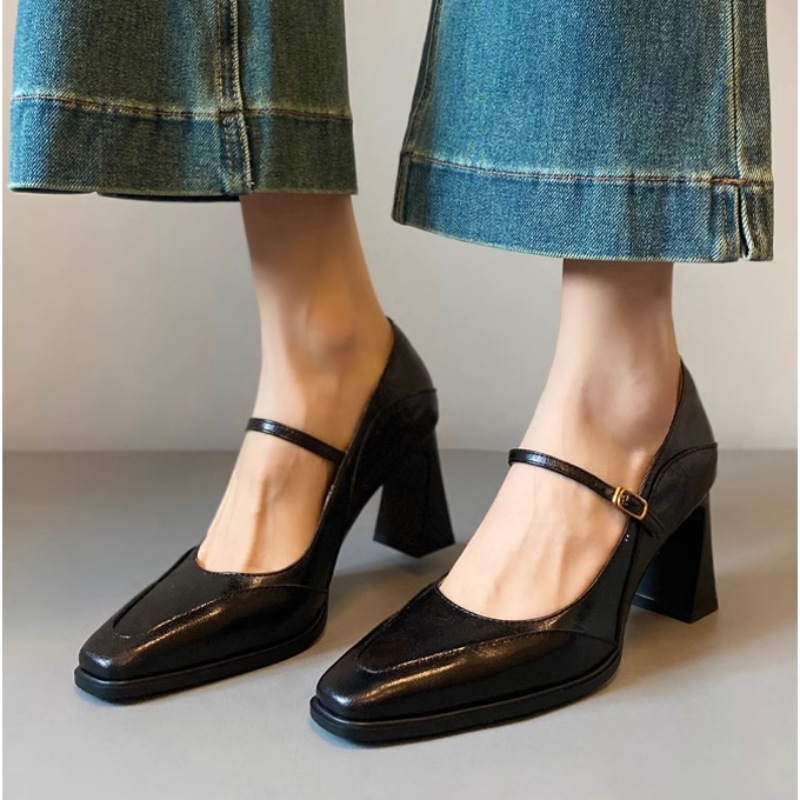 여성을위한 정품 가죽 프렌치 하이힐 메리 제인 슈즈 블랙 2025 봄 신작 원라인 버클 스트랩 두꺼운 굽 스퀘어 토 펌프스 슈즈스토어 가기