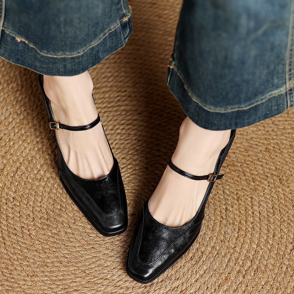 여성을위한 정품 가죽 프렌치 하이힐 메리 제인 슈즈 블랙 2025 봄 신작 원라인 버클 스트랩 두꺼운 굽 스퀘어 토 펌프스 슈즈