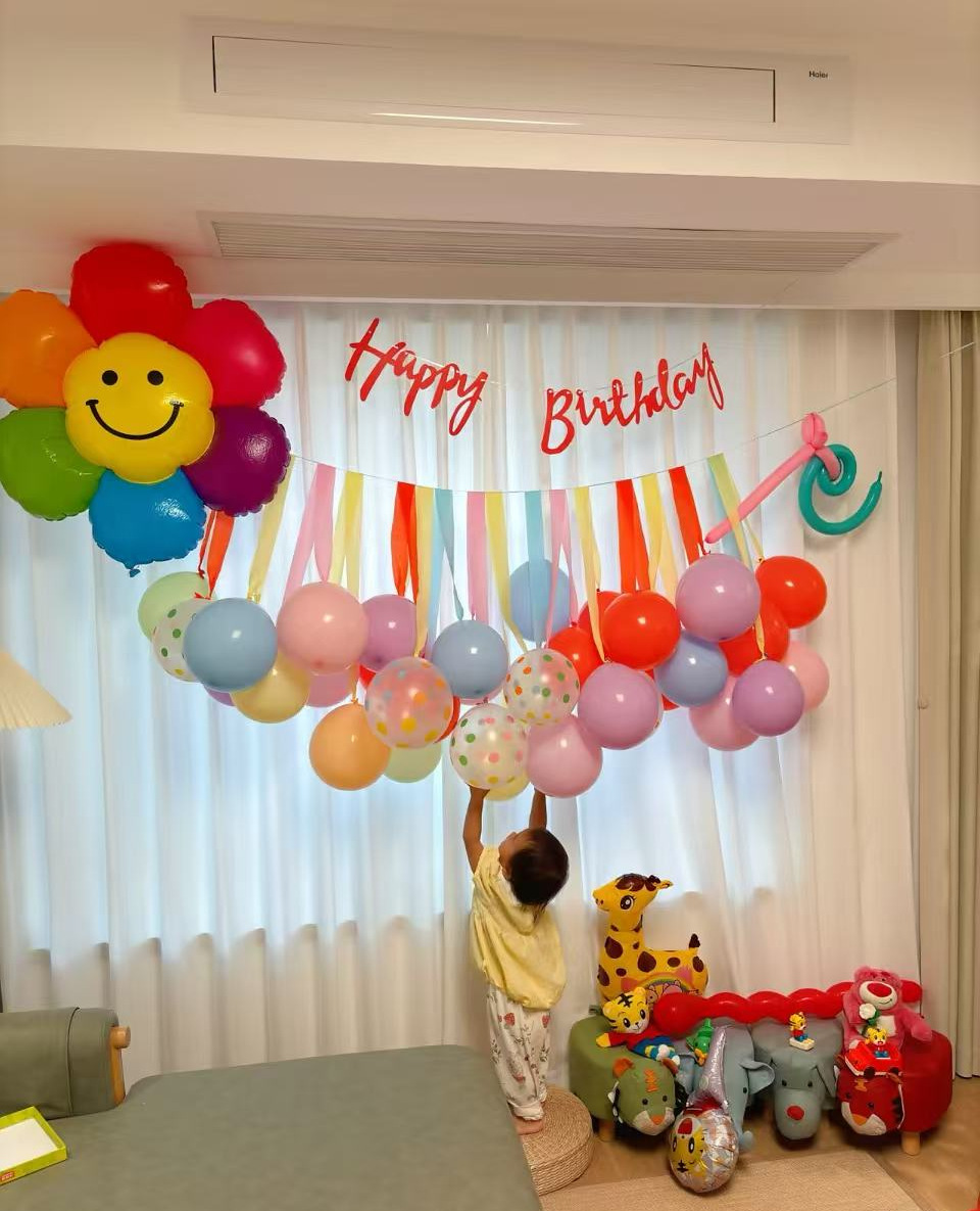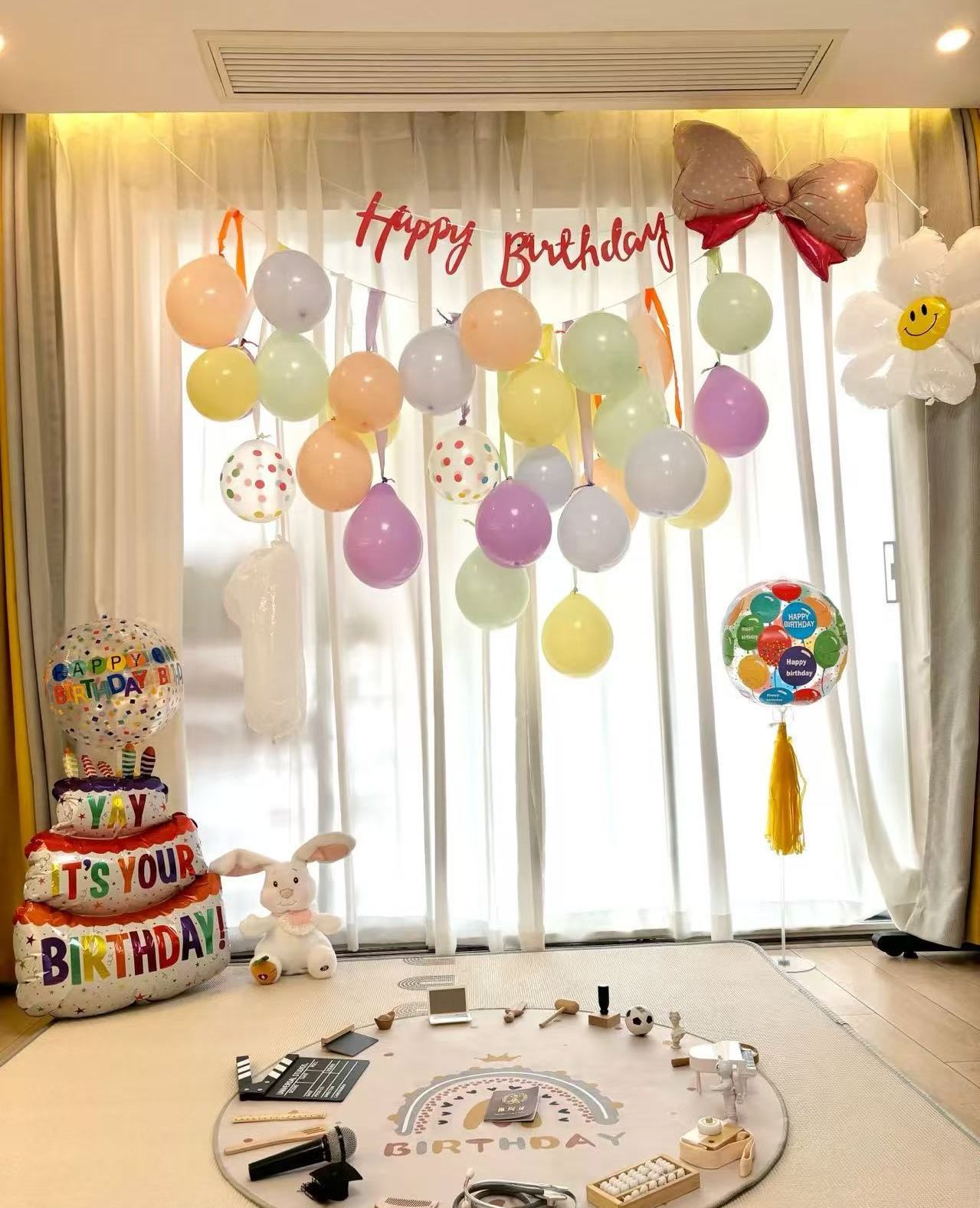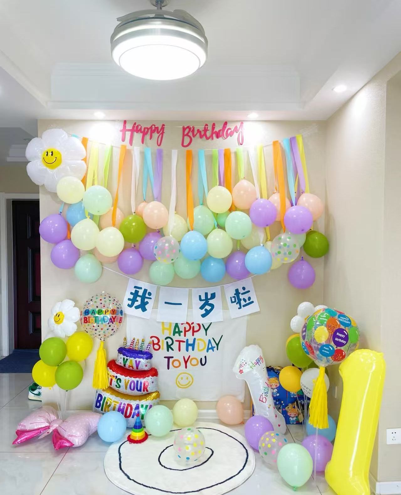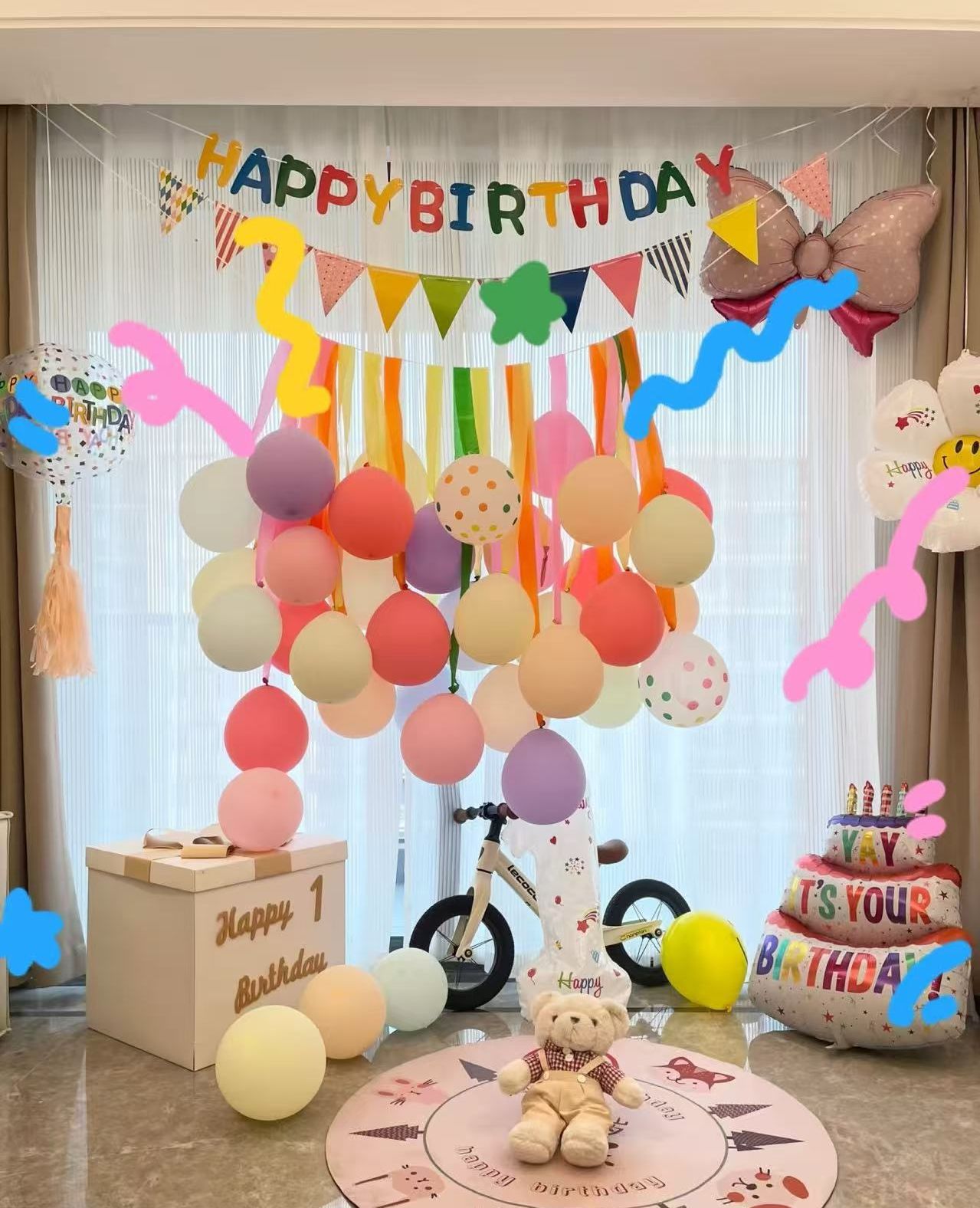 작은 빨간 승마 책 같은 어린이 생일 장면 레이아웃 풍선 아기의 1 년 된 파티 실내 술 배경 벽
