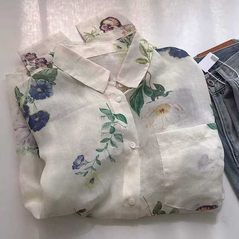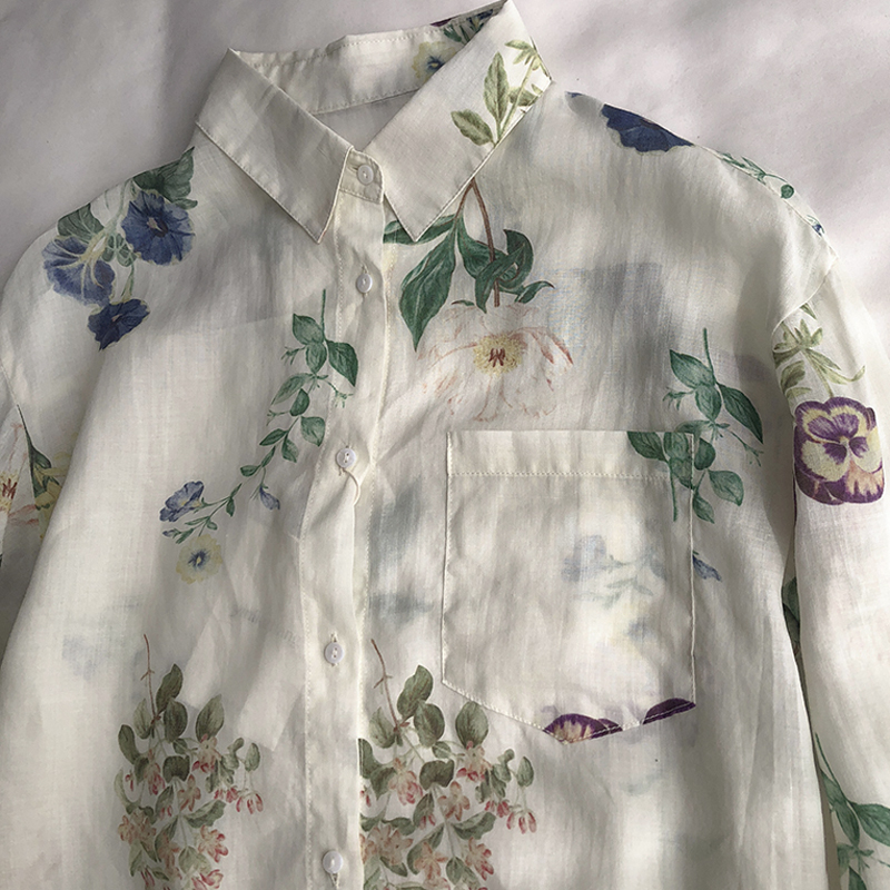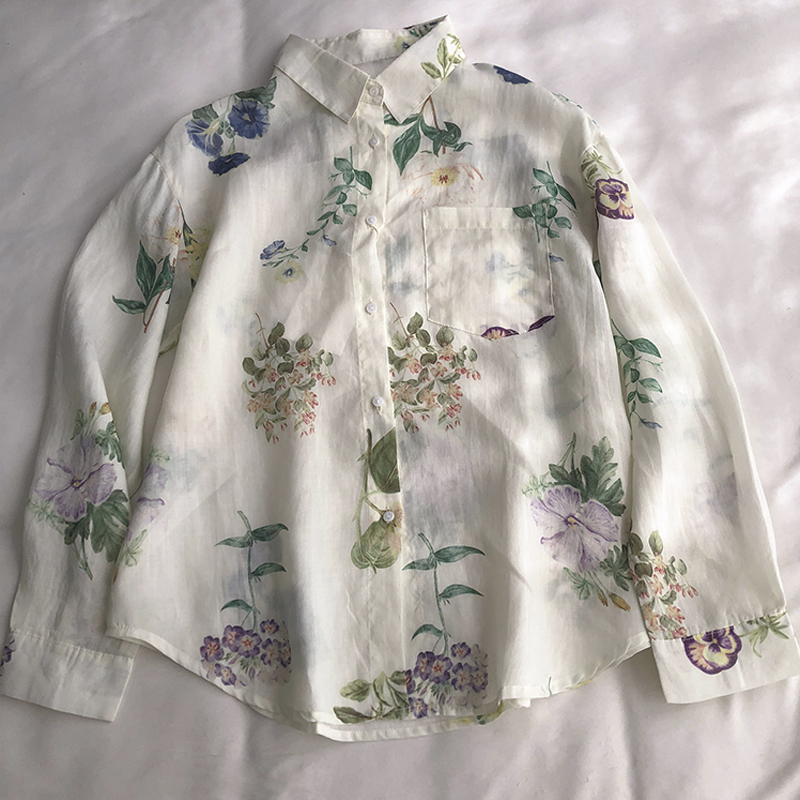 빈티지 인쇄 쉬폰 봄과 여름 얇은 캐주얼 셔츠 여성용 옷깃 긴 소매 모든 썬 스크린 카디건 외부 착용 탑