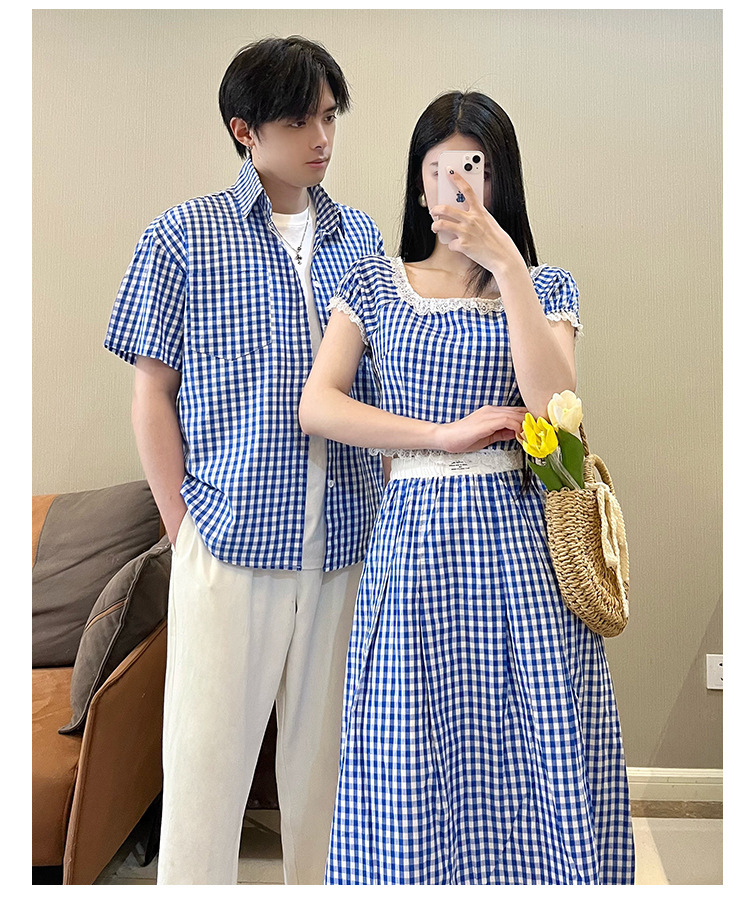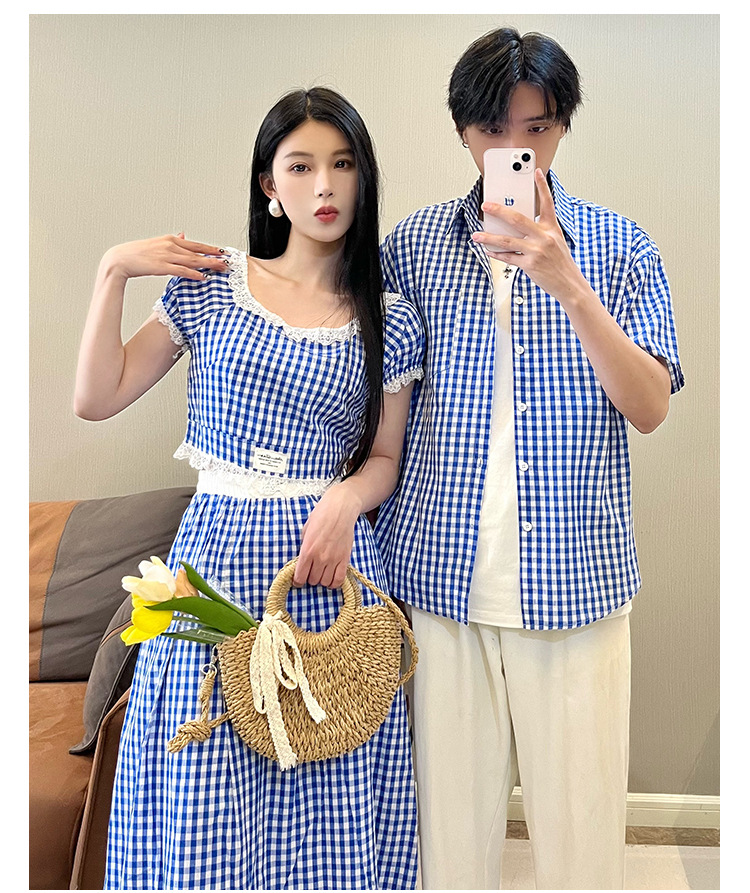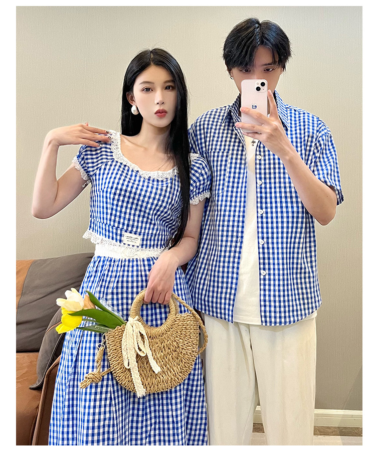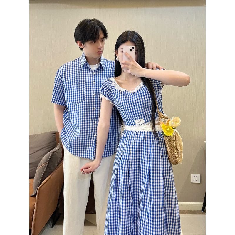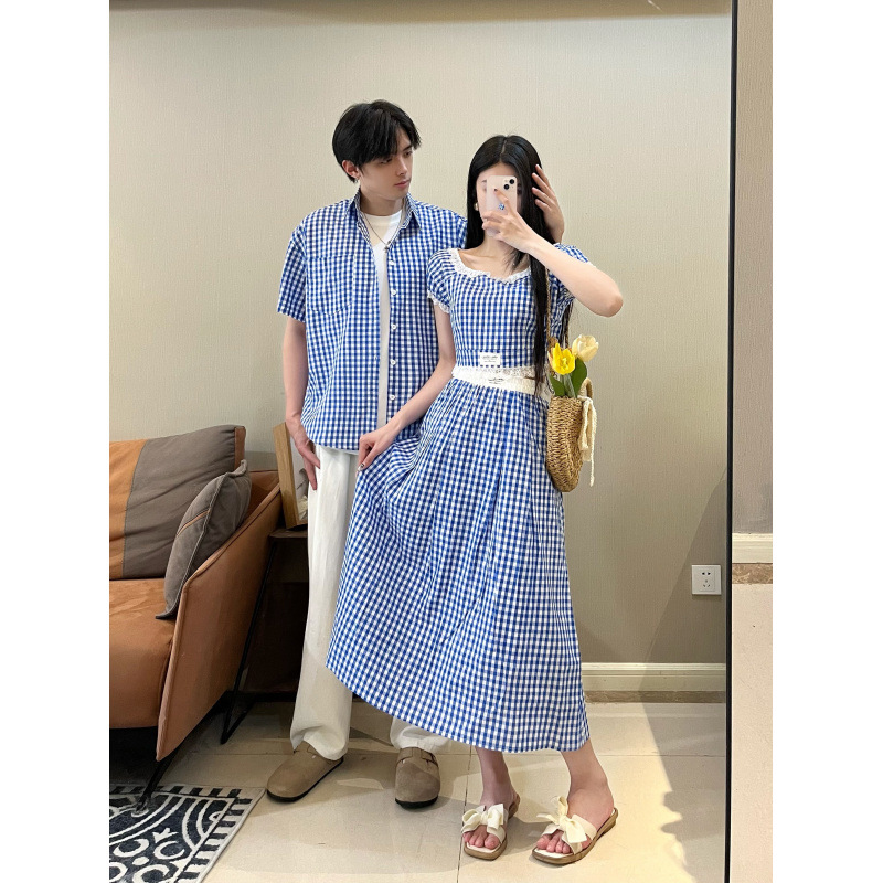 2025 여름 커플 착용 새로운 투피스 세트 그리드 인터넷 연예인 여행 휴가 여성 티셔츠 스커트 남성 반팔 셔츠