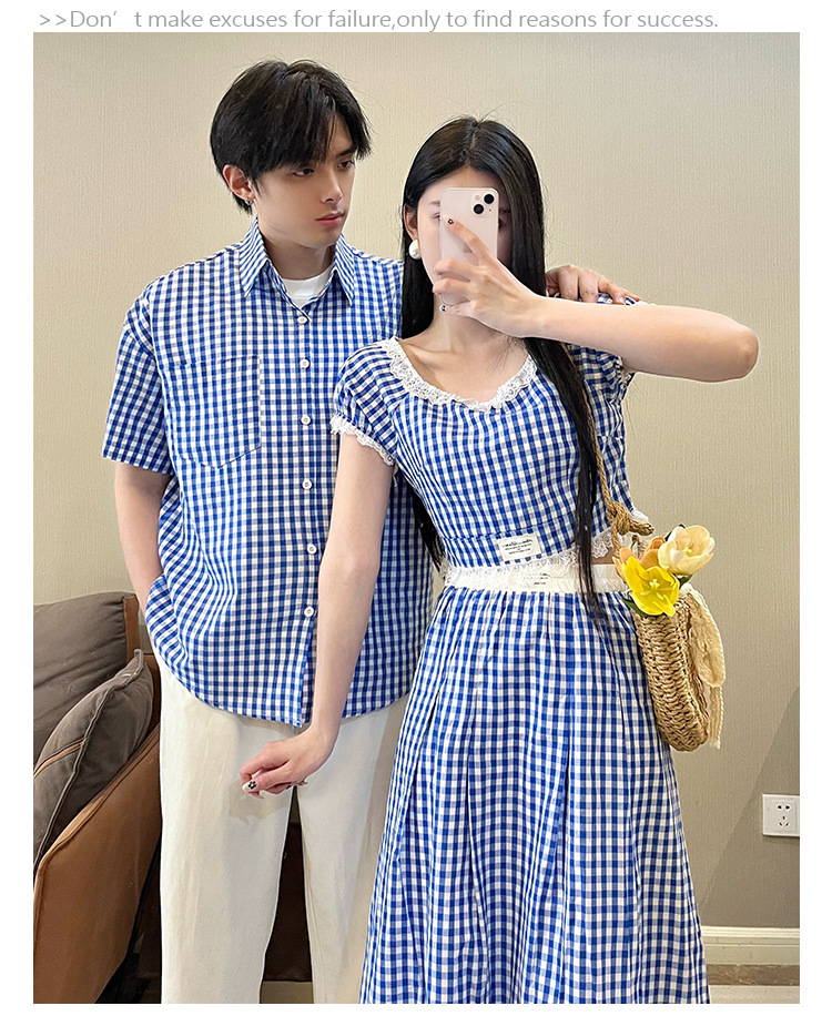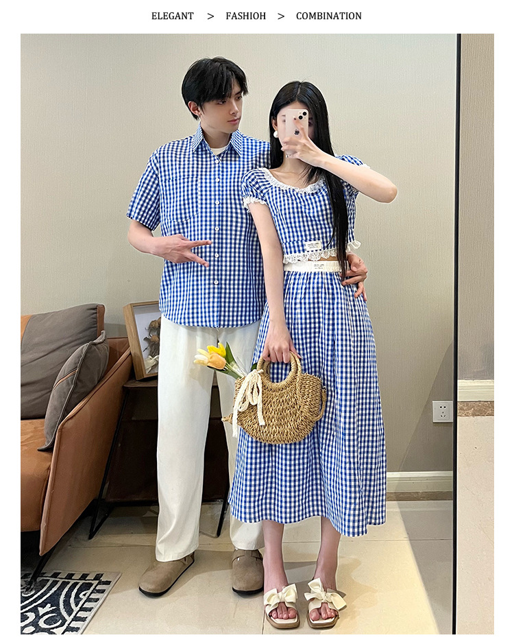 2025 여름 커플 착용 새로운 투피스 세트 그리드 인터넷 연예인 여행 휴가 여성 티셔츠 스커트 남성 반팔 셔츠스토어 가기
