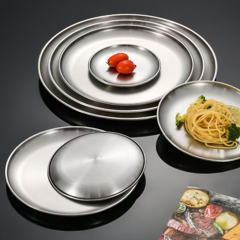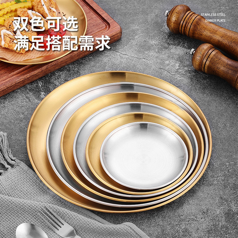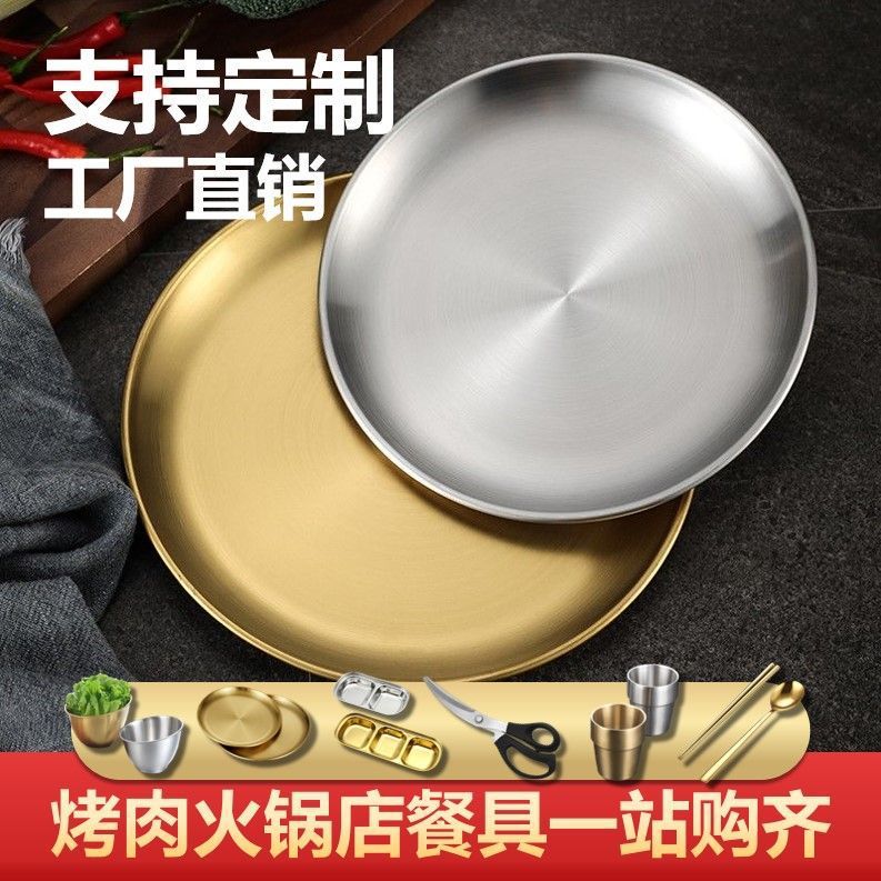 도매 신장 도매 한국 스테인레스 스틸 두꺼운 원형 접시 황금 트레이 과일 접시 케이크 접시 뼈 접시 바베큐 접시스토어 가기